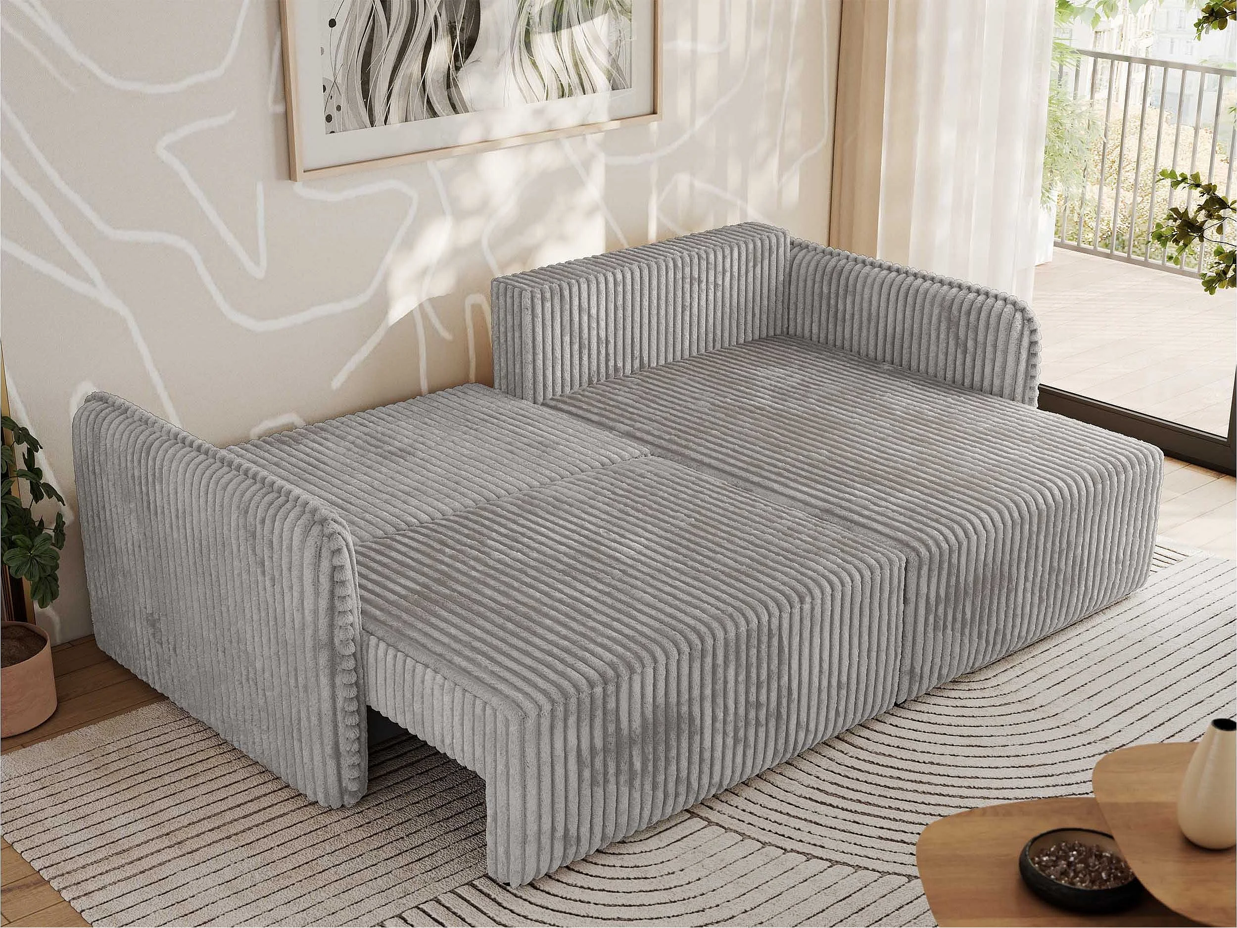 Ecksofa MESTO - Schlaffunktion und Bettkasten, L-form Couch für das Wohnzimmer, Armlehnen - Hellgrau Cord - Ecke Rechts
