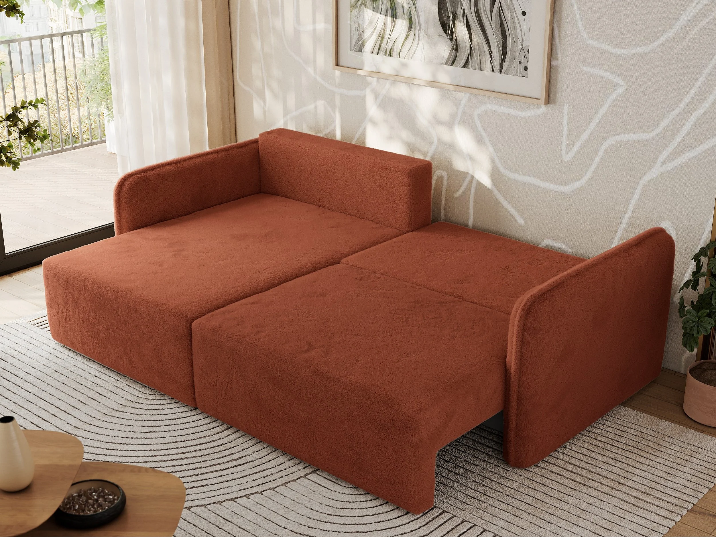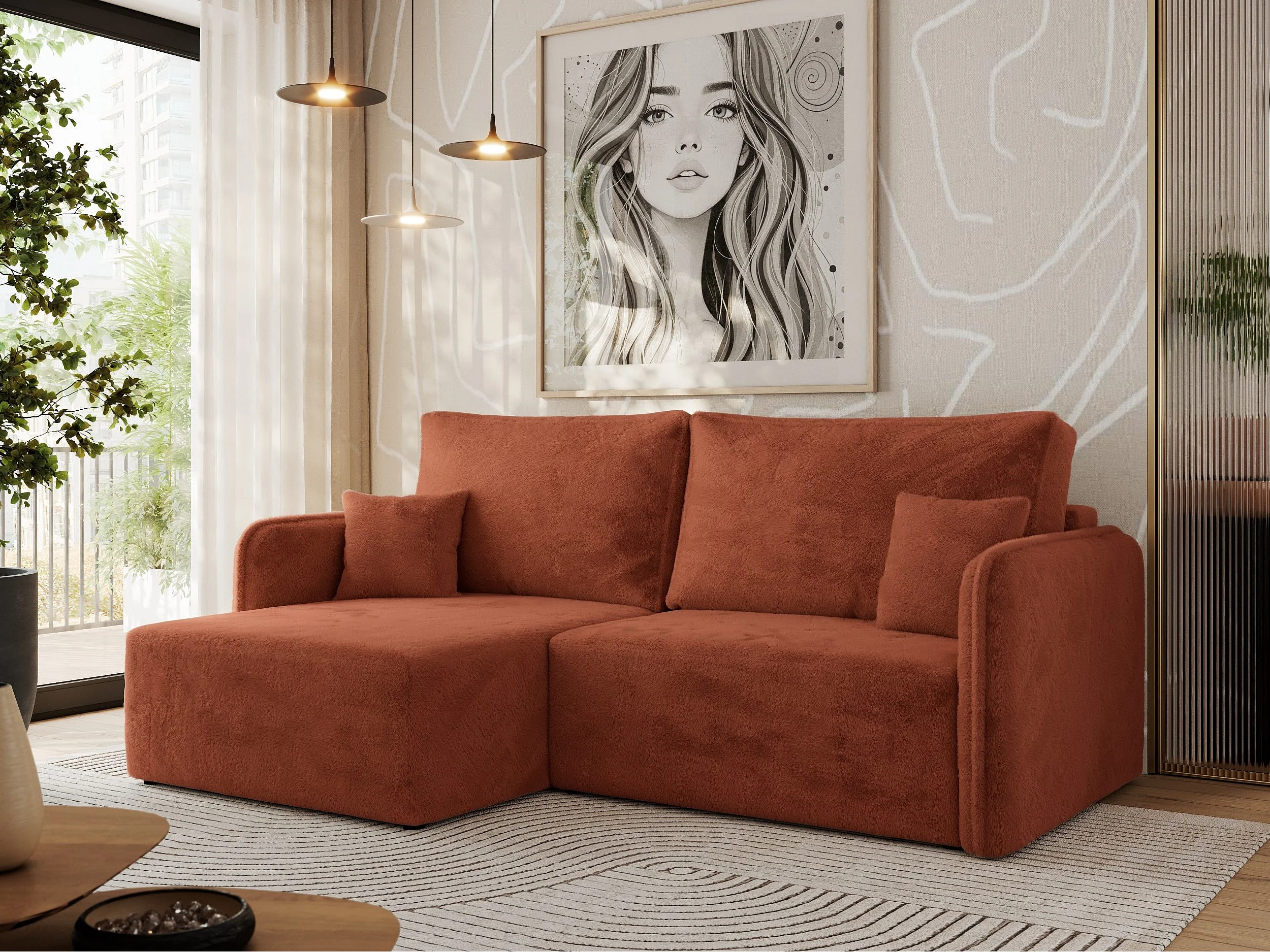Ecksofa MESTO - Schlaffunktion und Bettkasten, L-form Couch für das Wohnzimmer, Armlehnen - Orange Plüsch - Ecke Links