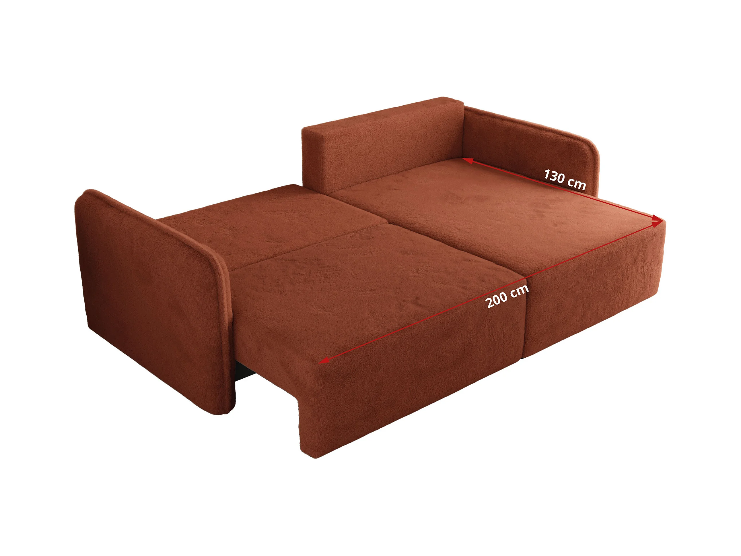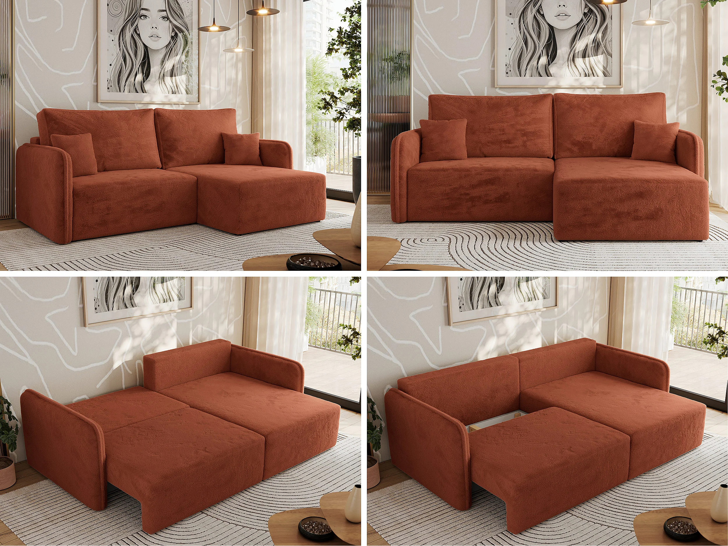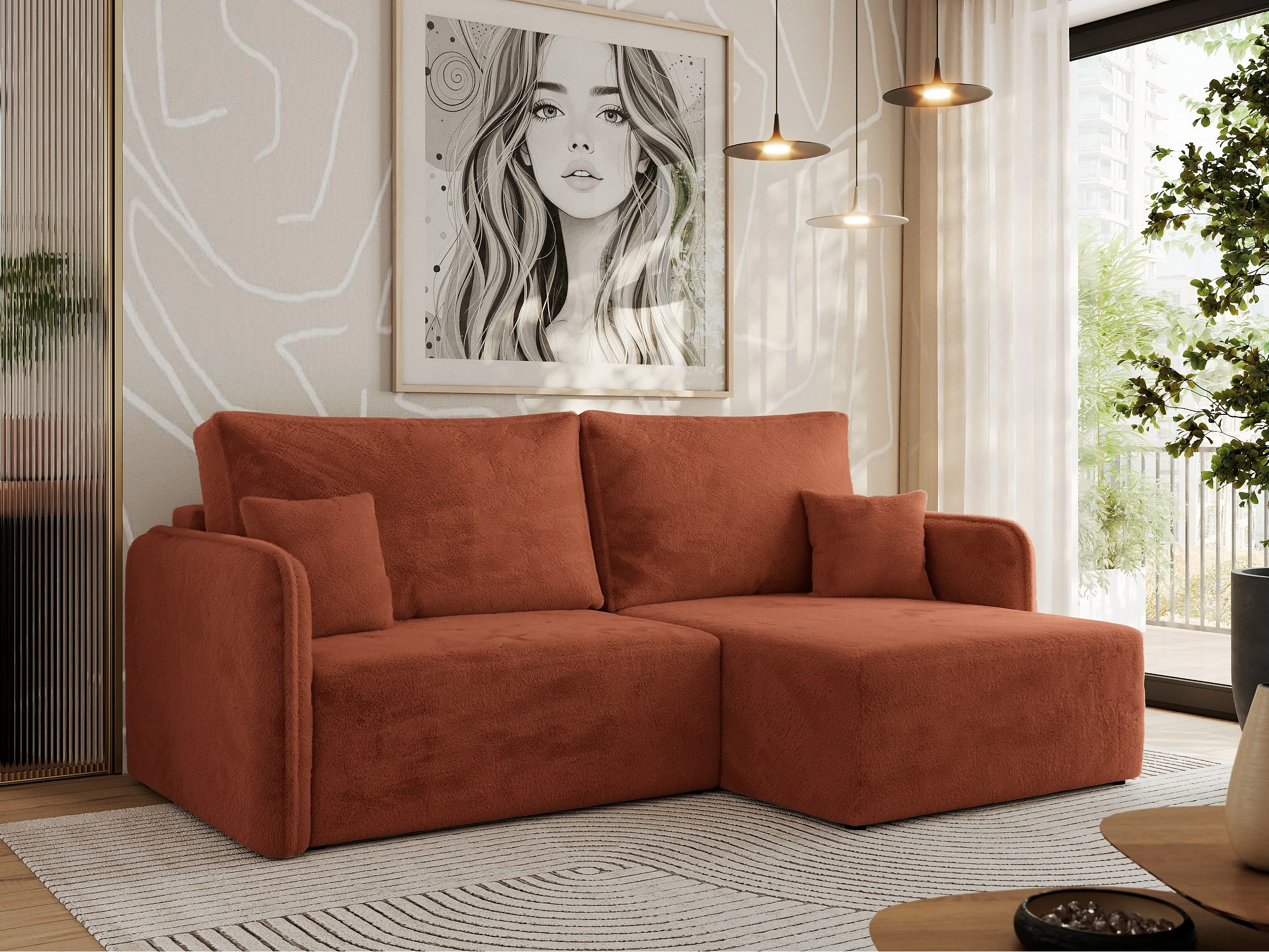 Ecksofa MESTO - Schlaffunktion und Bettkasten, L-form Couch für das Wohnzimmer, Armlehnen - Orange Plüsch - Ecke Rechts