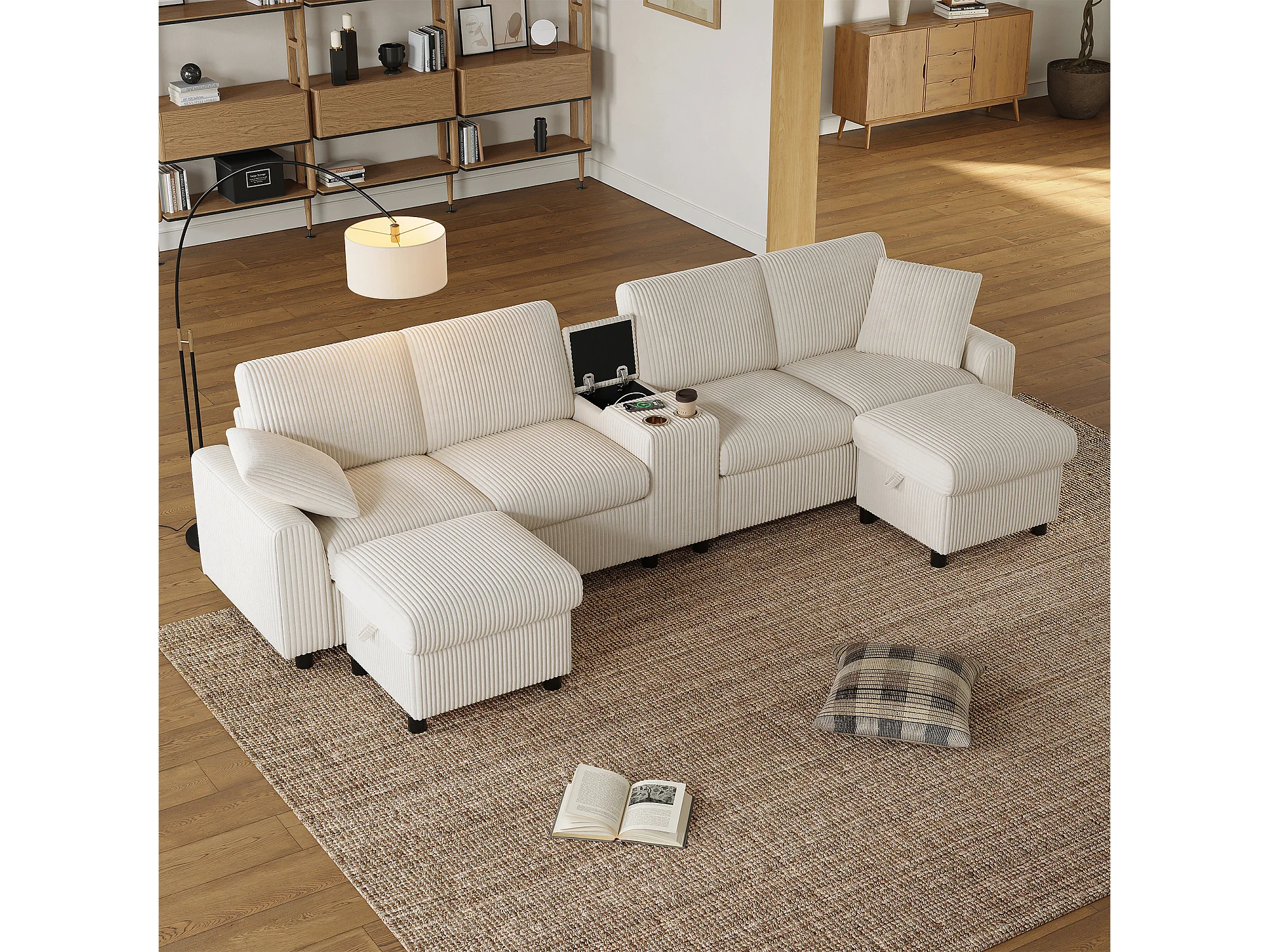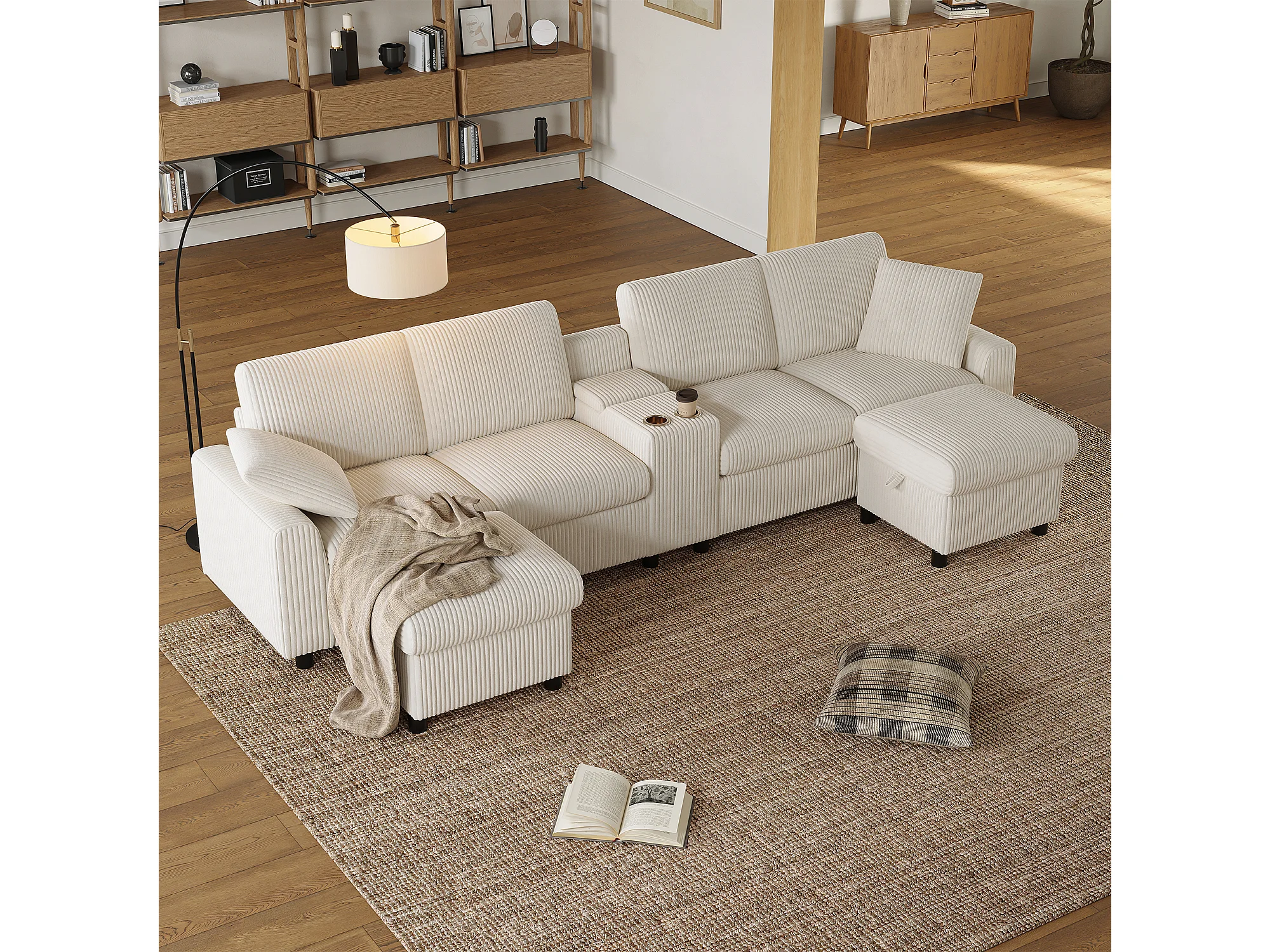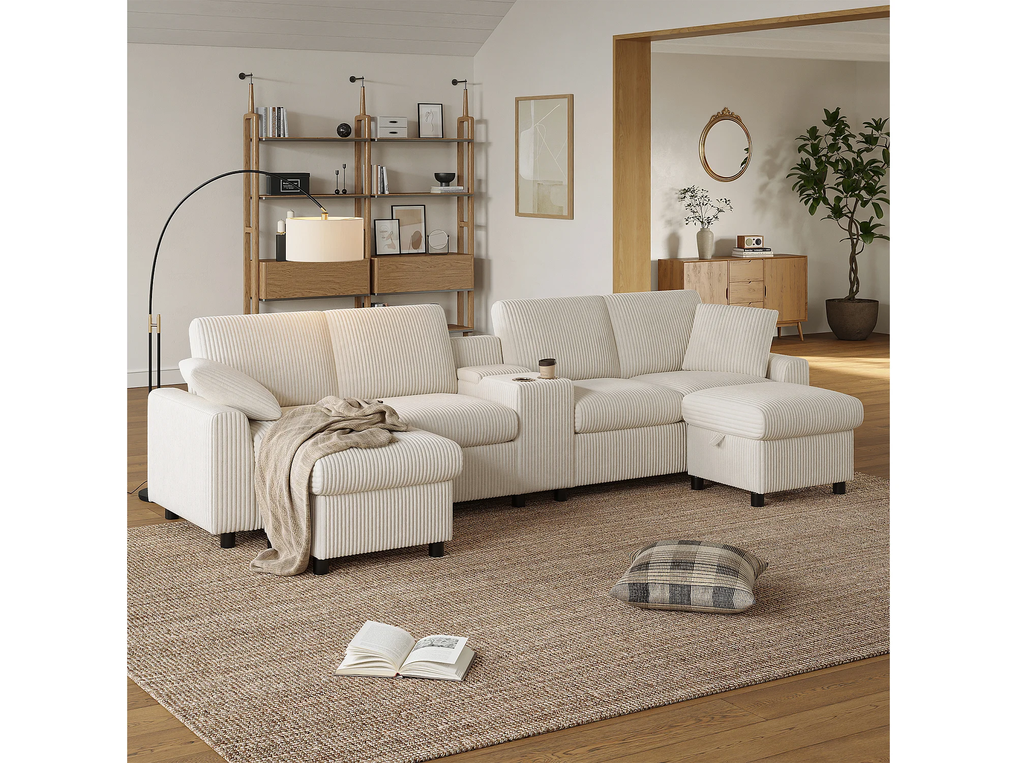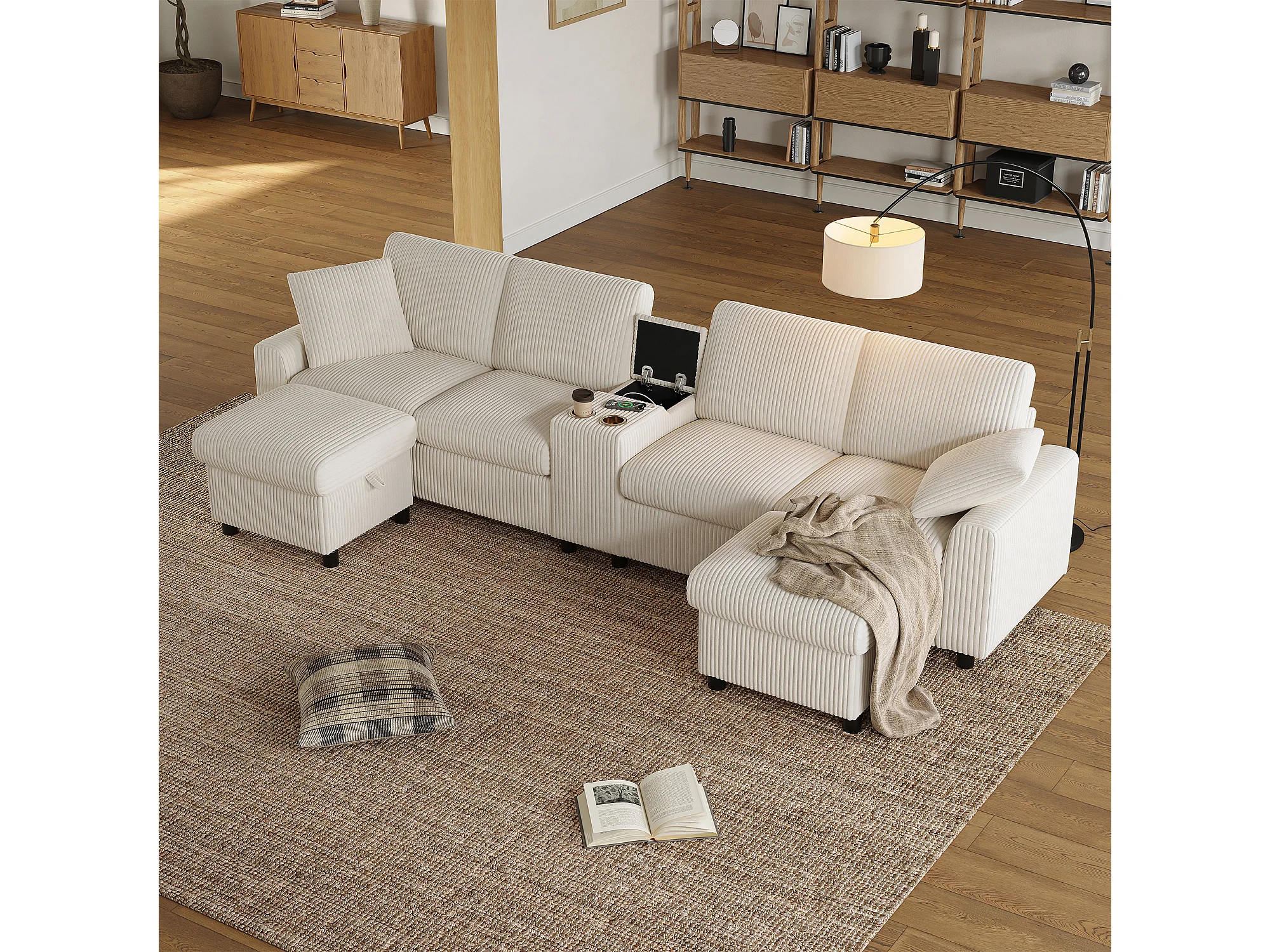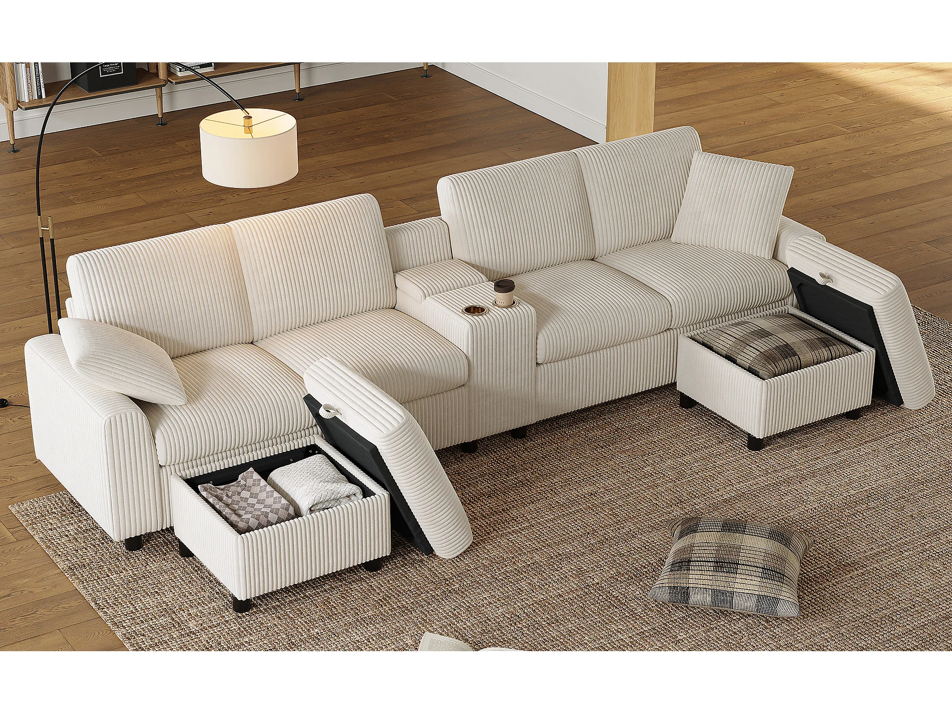 Ecksofa mit 2 Fußstützen mit Stauraum, 2 Getränkehaltern, 1 USB-Anschluss und Steckdosen – 315 x 135 x 81 cm – Samt – Beige