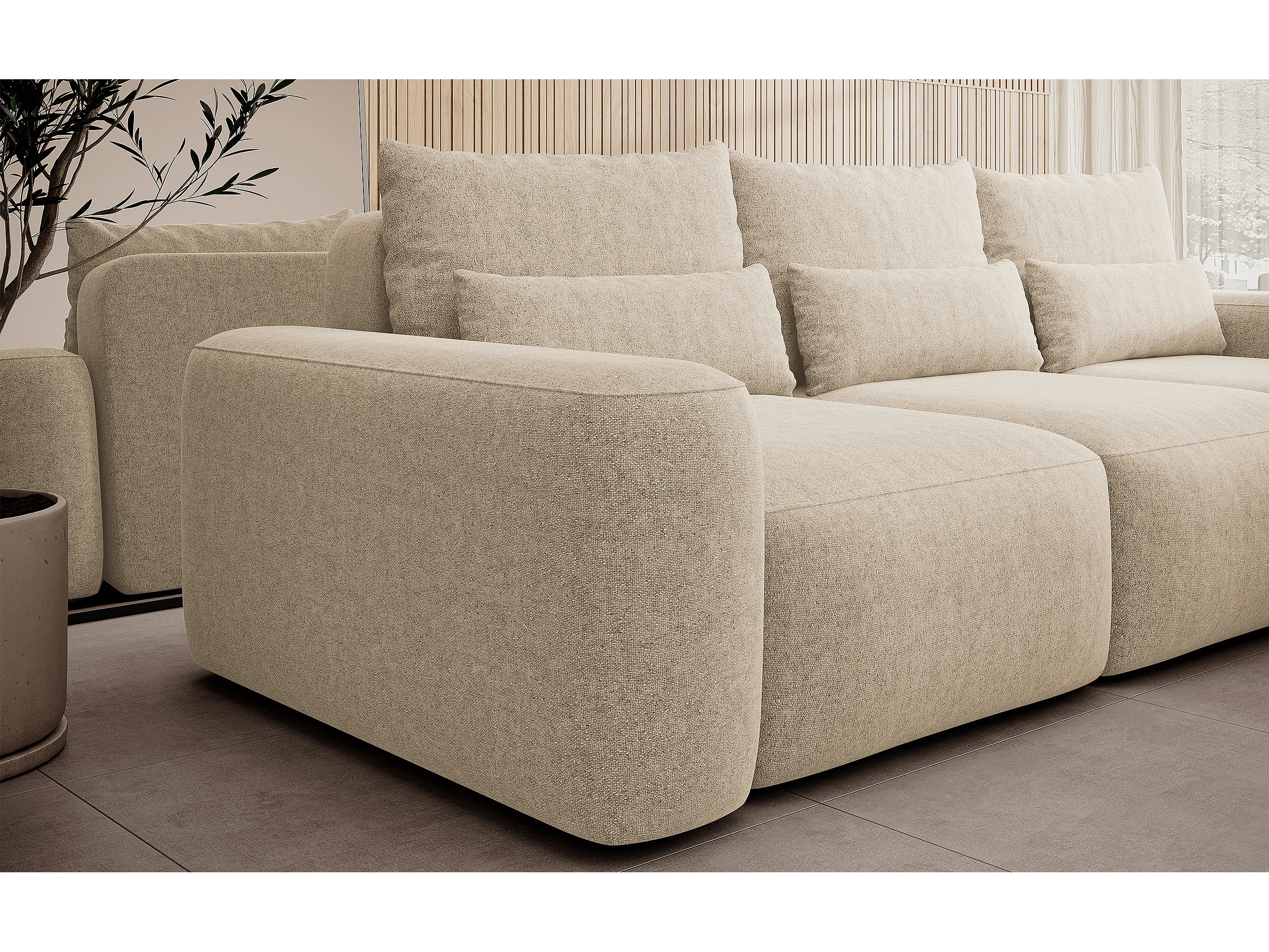 Ecksofa mit Chenillebezug – Schlaffunktion und Stauraum – Beige – rechts – CARNOS