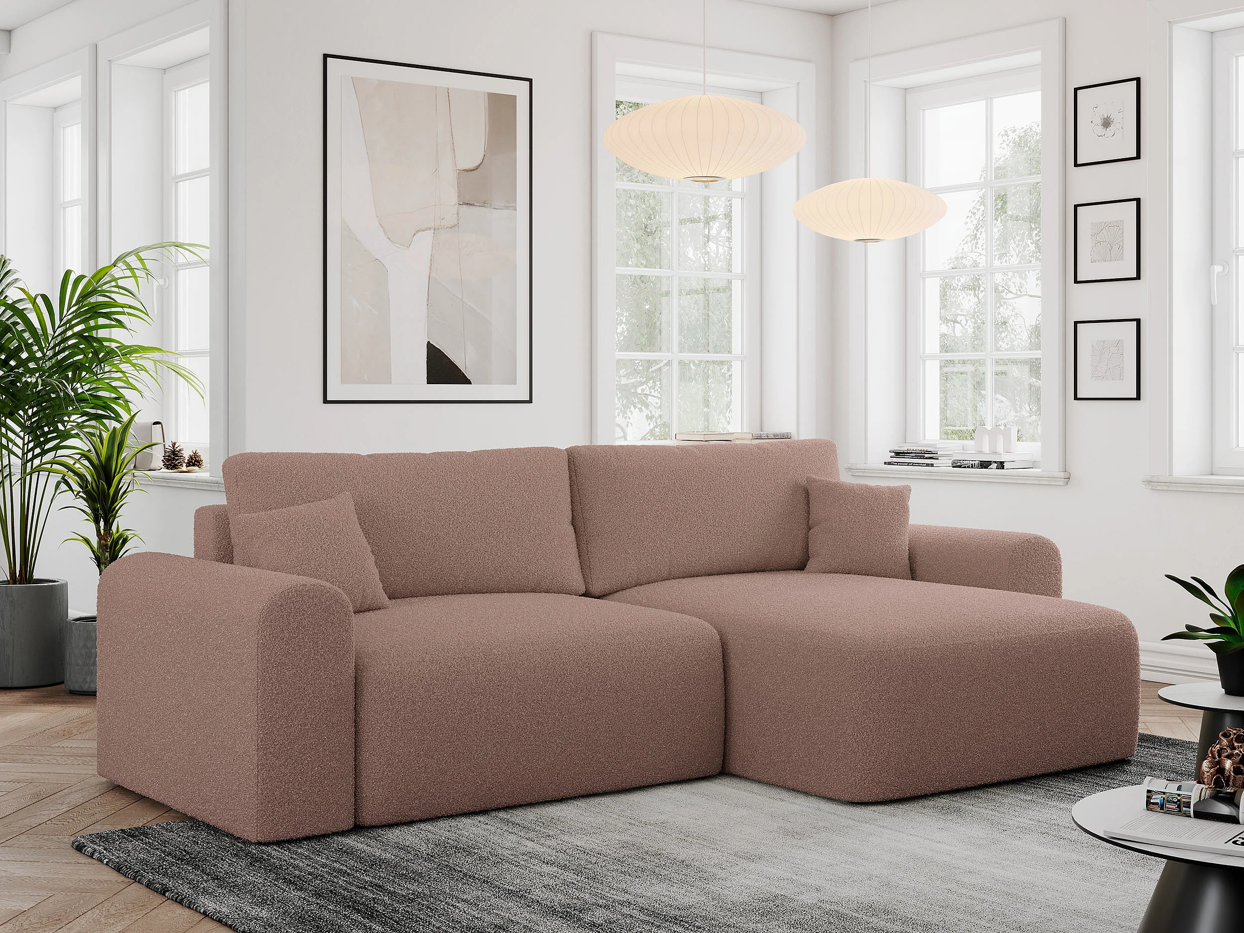 Ecksofa NELSON - Schlafcouch mit Armlehnen und Bettkasten, universelles L-förmige Ecksofa - Rosa Boucle