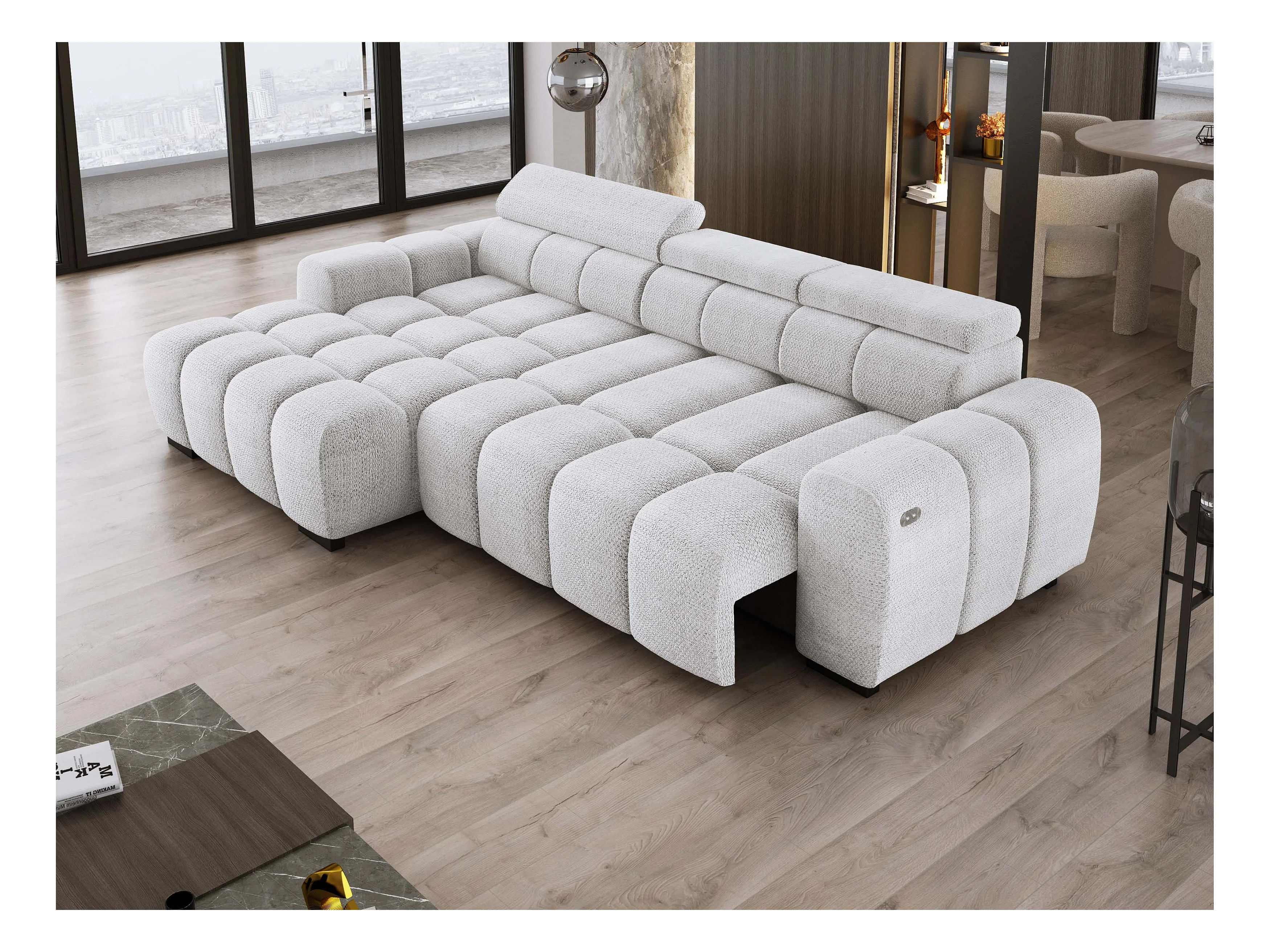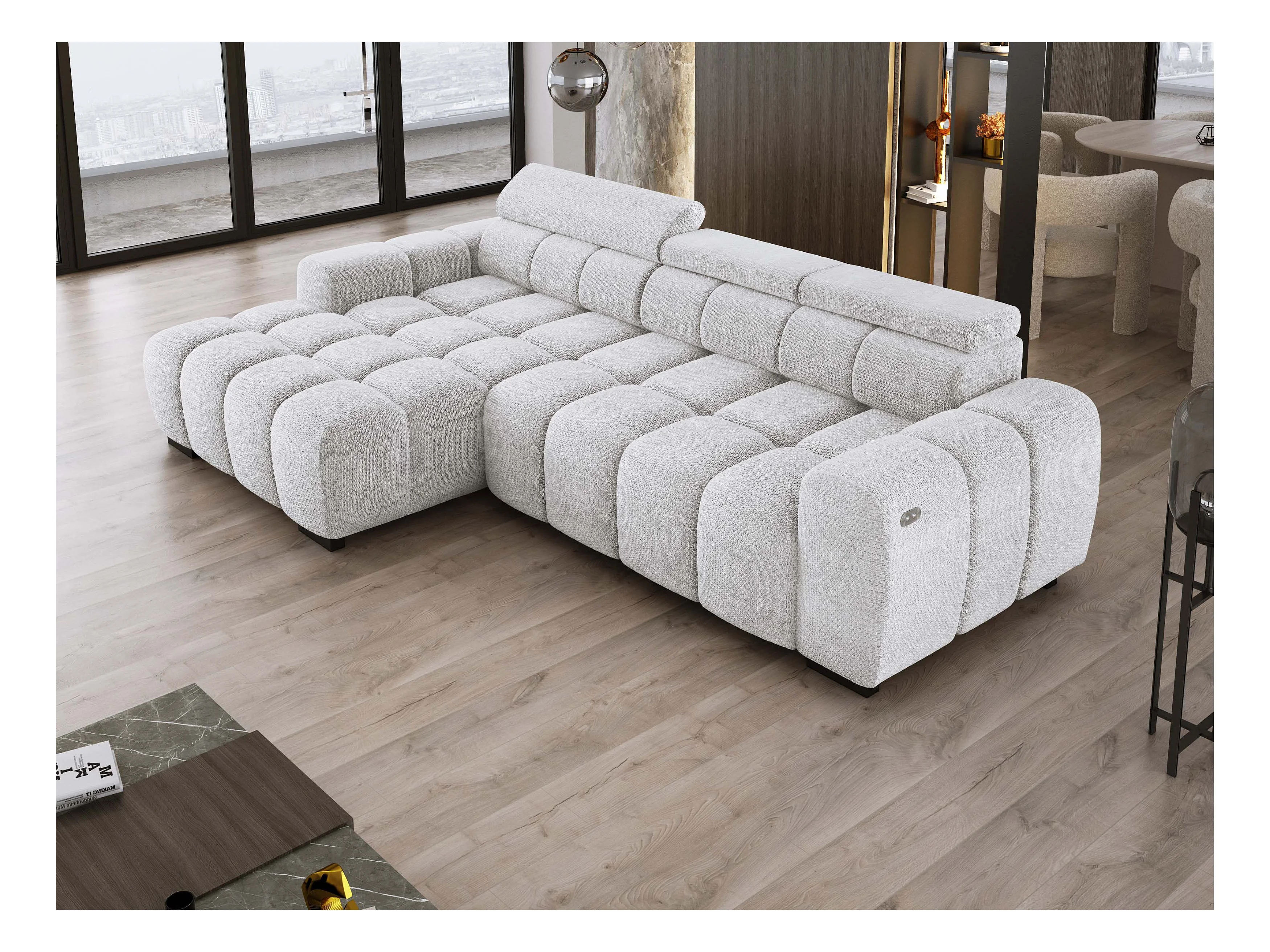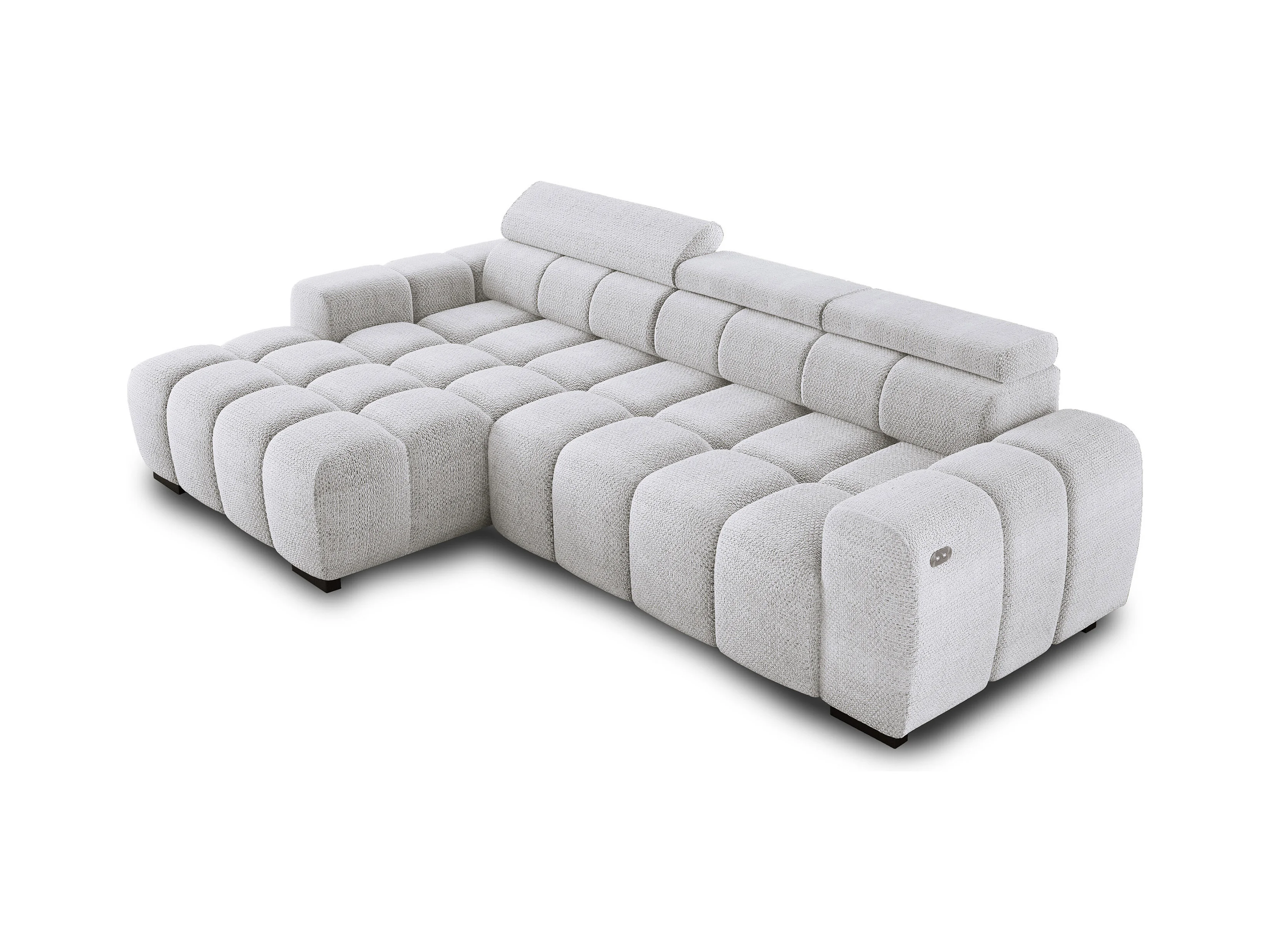 Ecksofa OMBO 285x168x77/97 cm, Links, Schlaffunktion, elektr. Sitz, Kopfstützen, Buche dunkel, hydrophober EDEN-Stoff – Esche