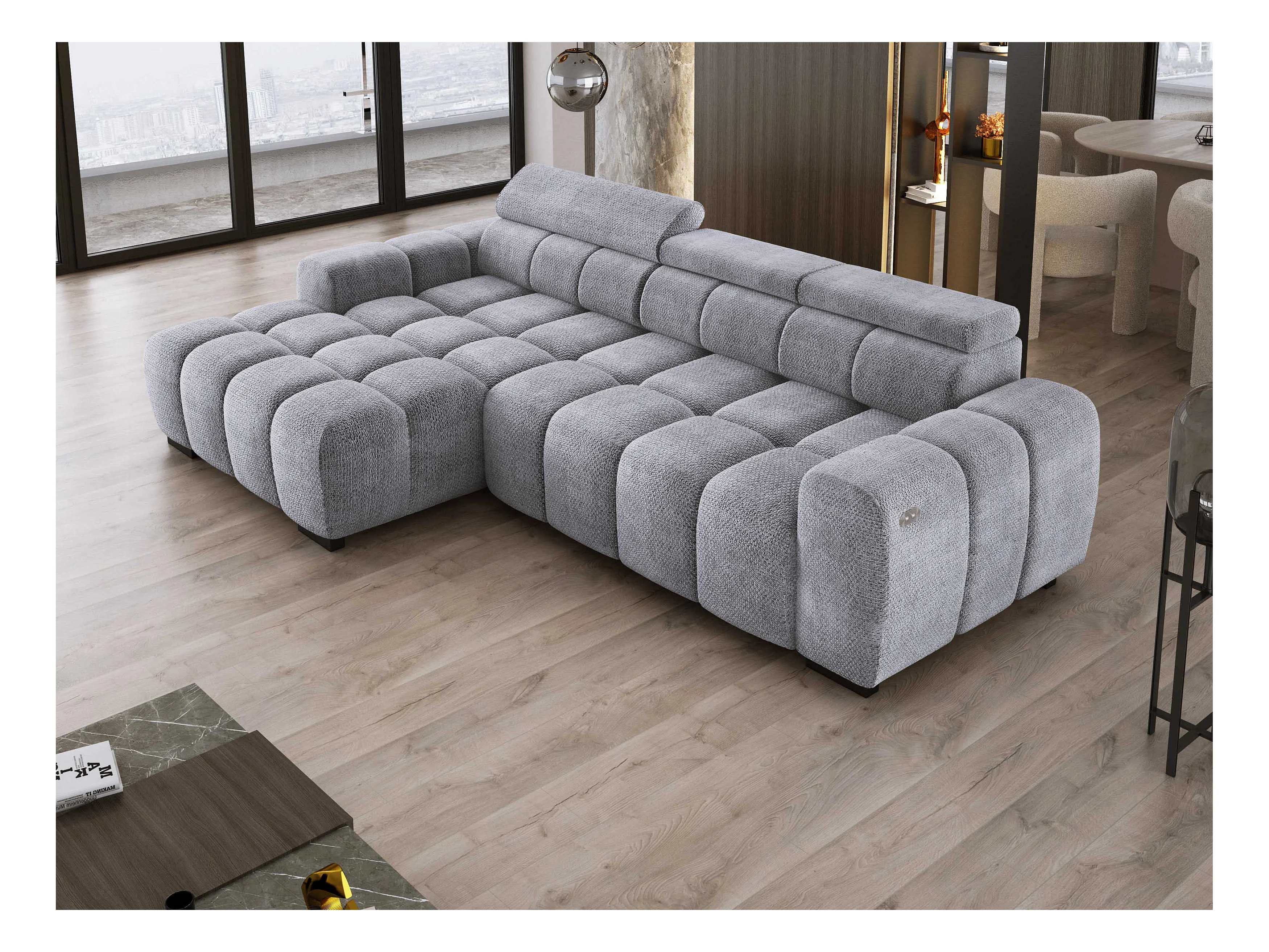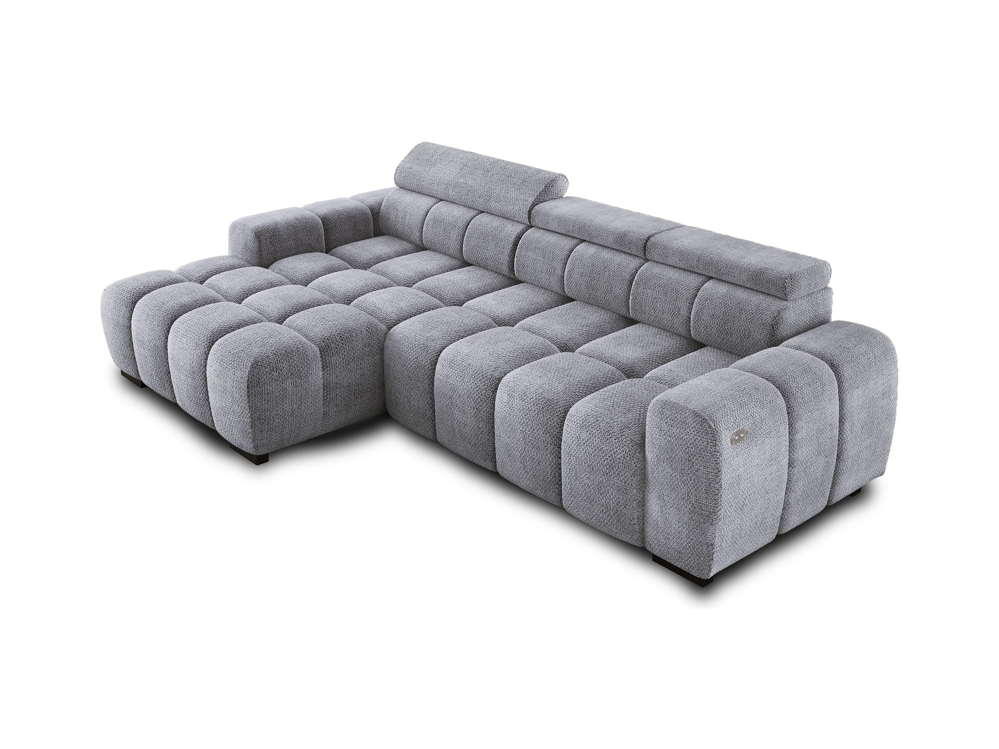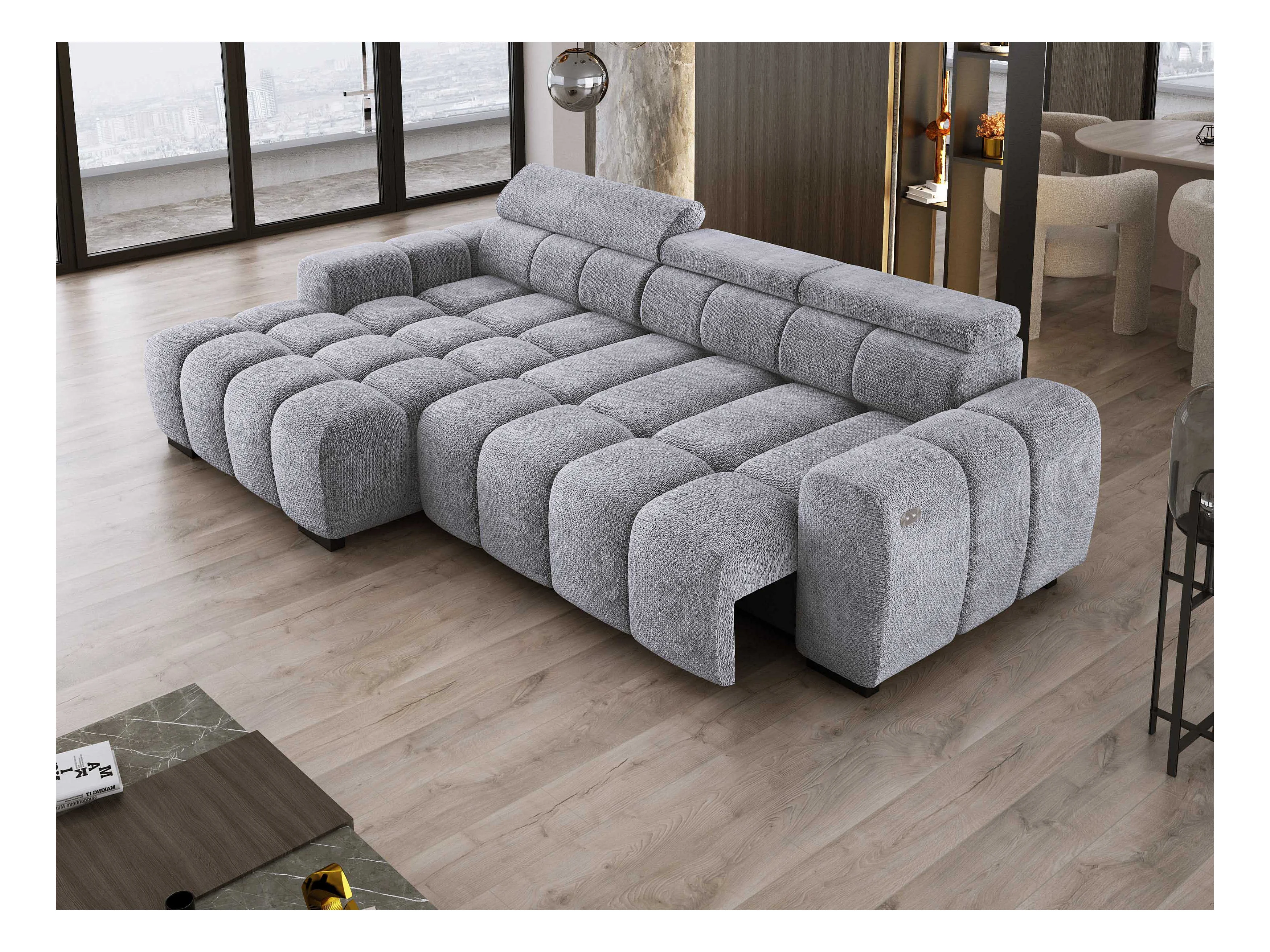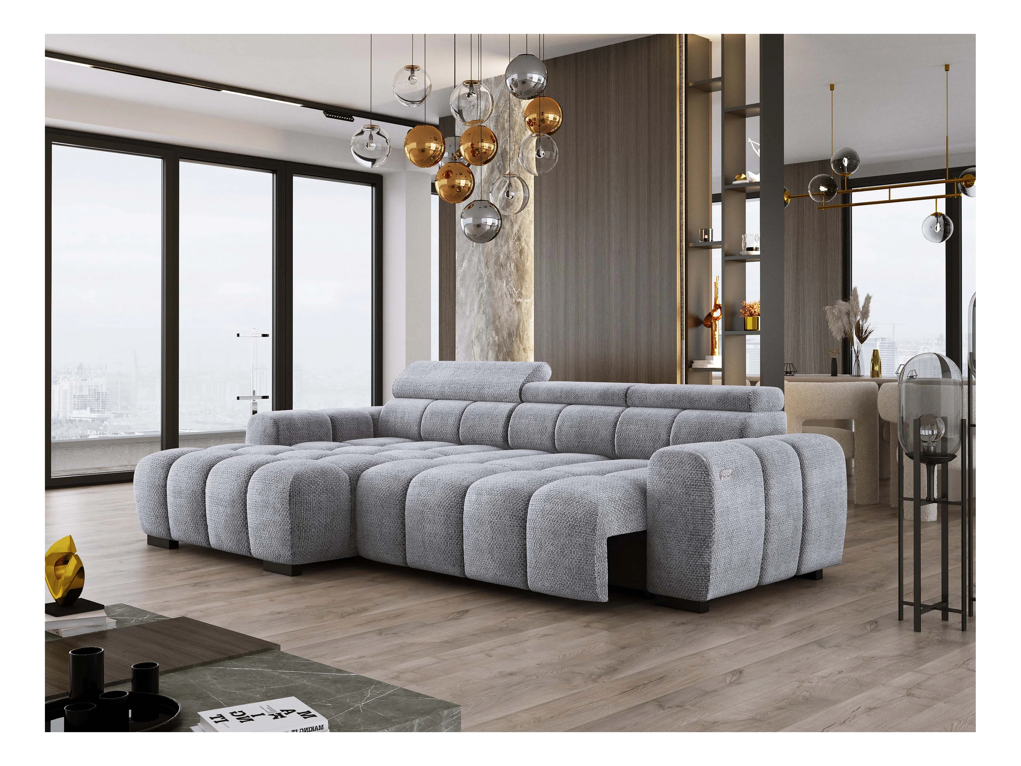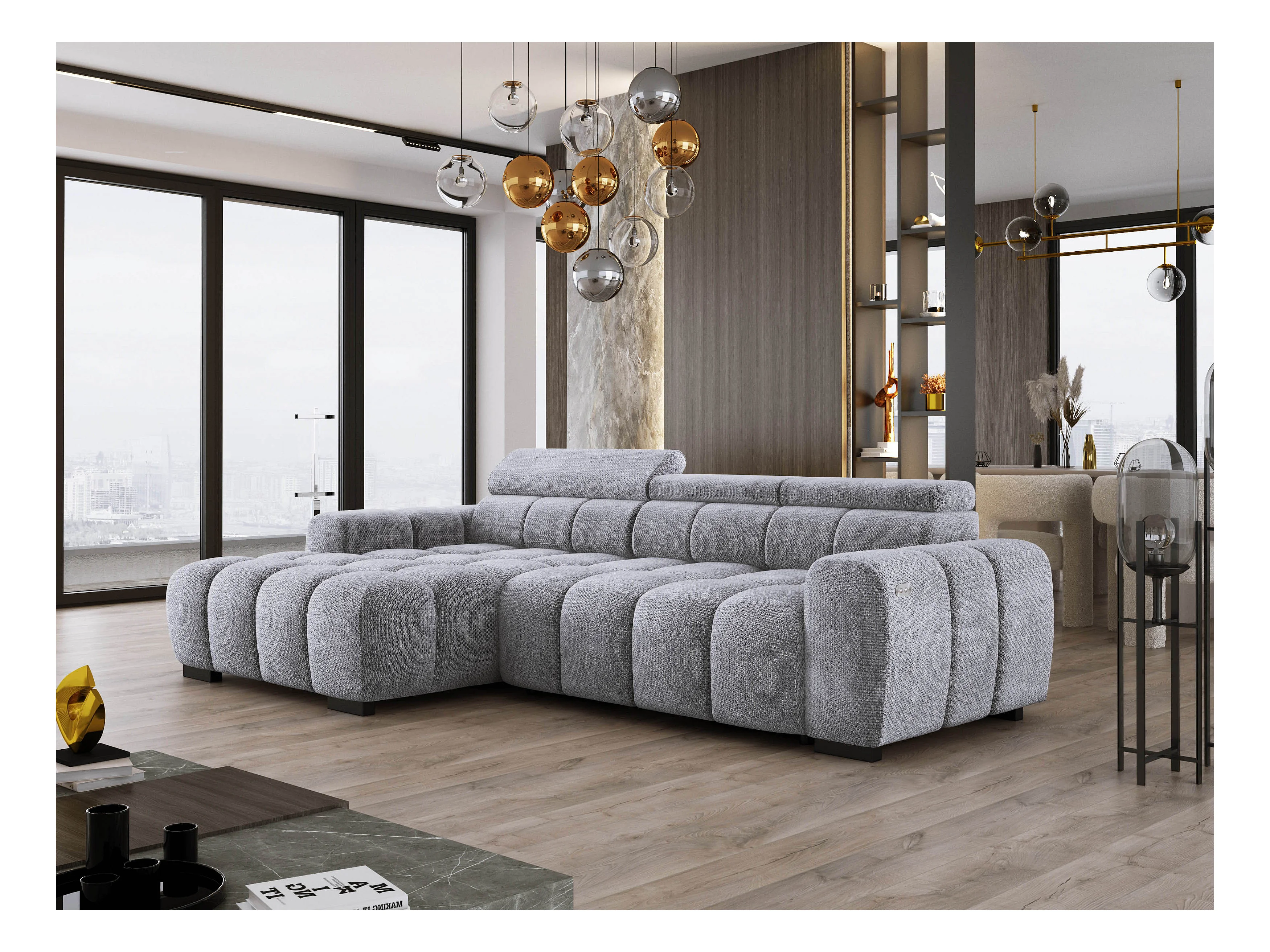Ecksofa OMBO 285x168x77/97 cm, Links, Schlaffunktion, elektr. Sitz, Kopfstützen, Buche dunkel, hydrophober EDEN-Stoff – Silber