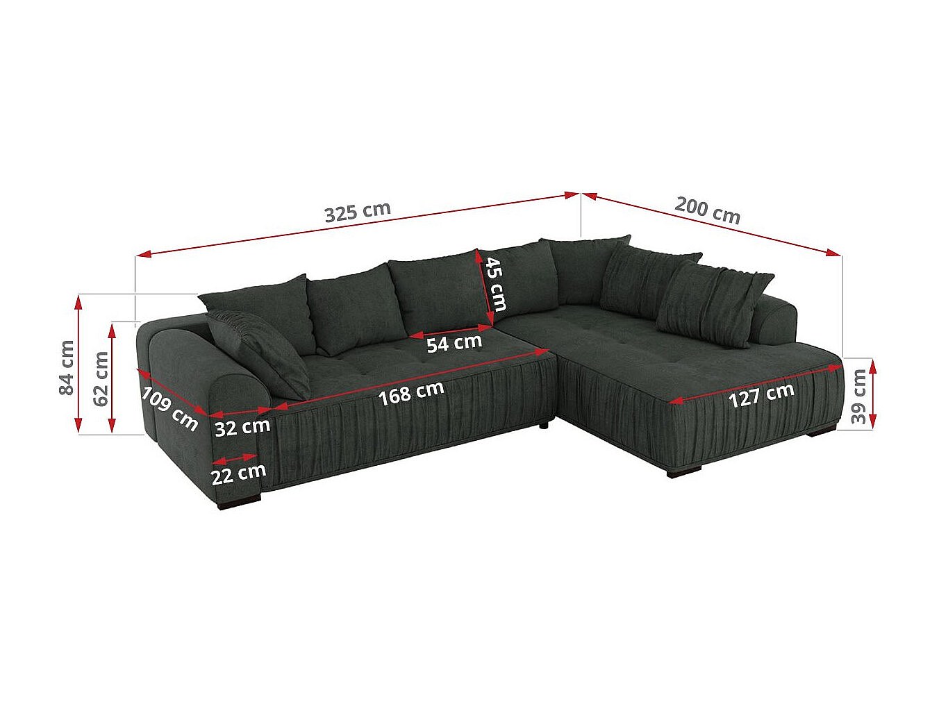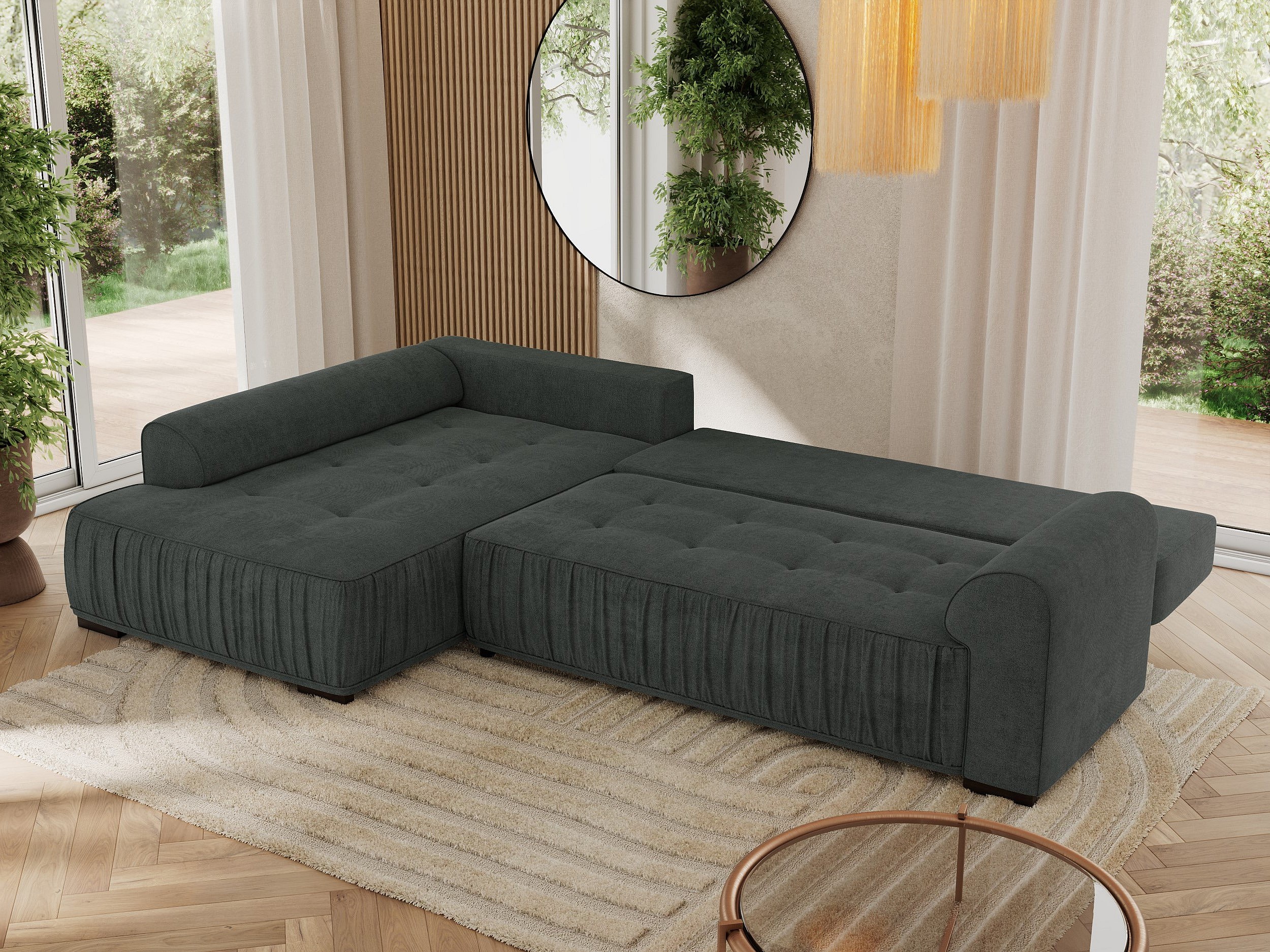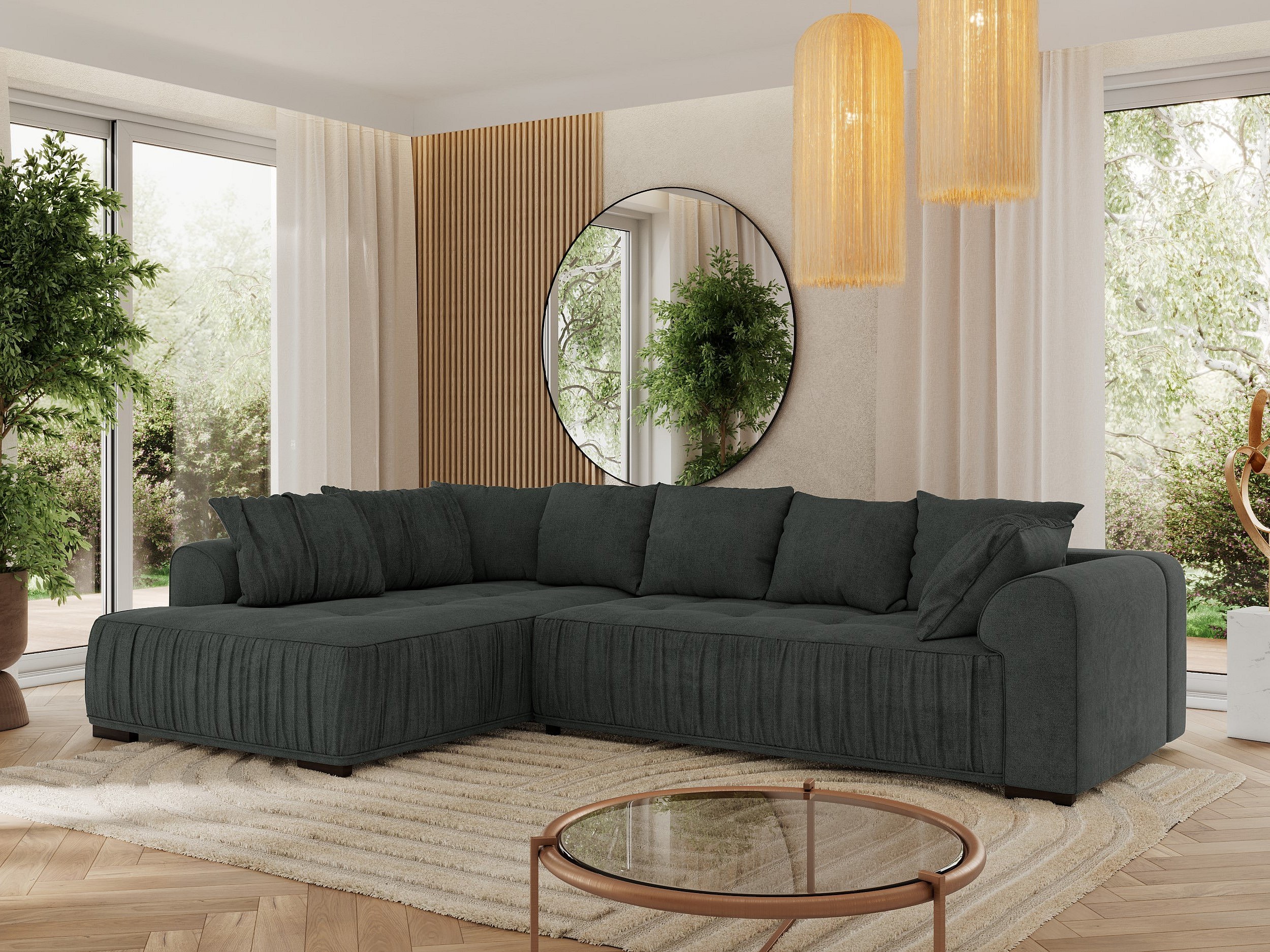 Ecksofa ORTA - Schlaffunktion und Bettkasten, lose Kissen, gesteppter Sitz, L-förmige Ecke - Dunkelgrau Stukture - Ecke Links