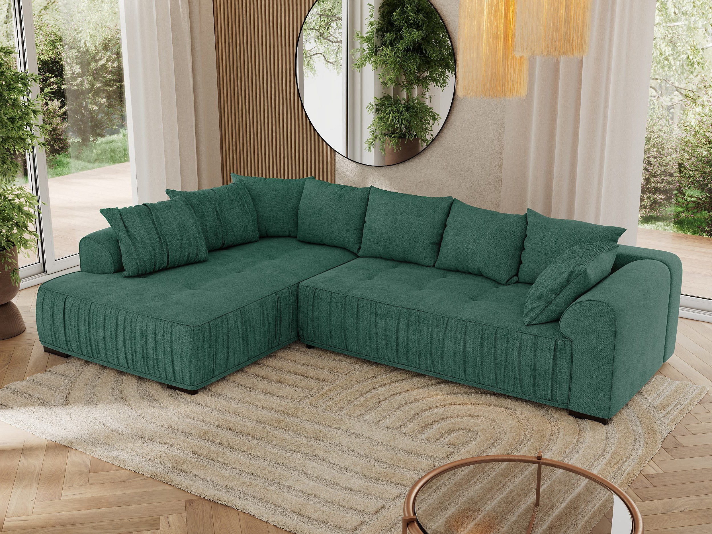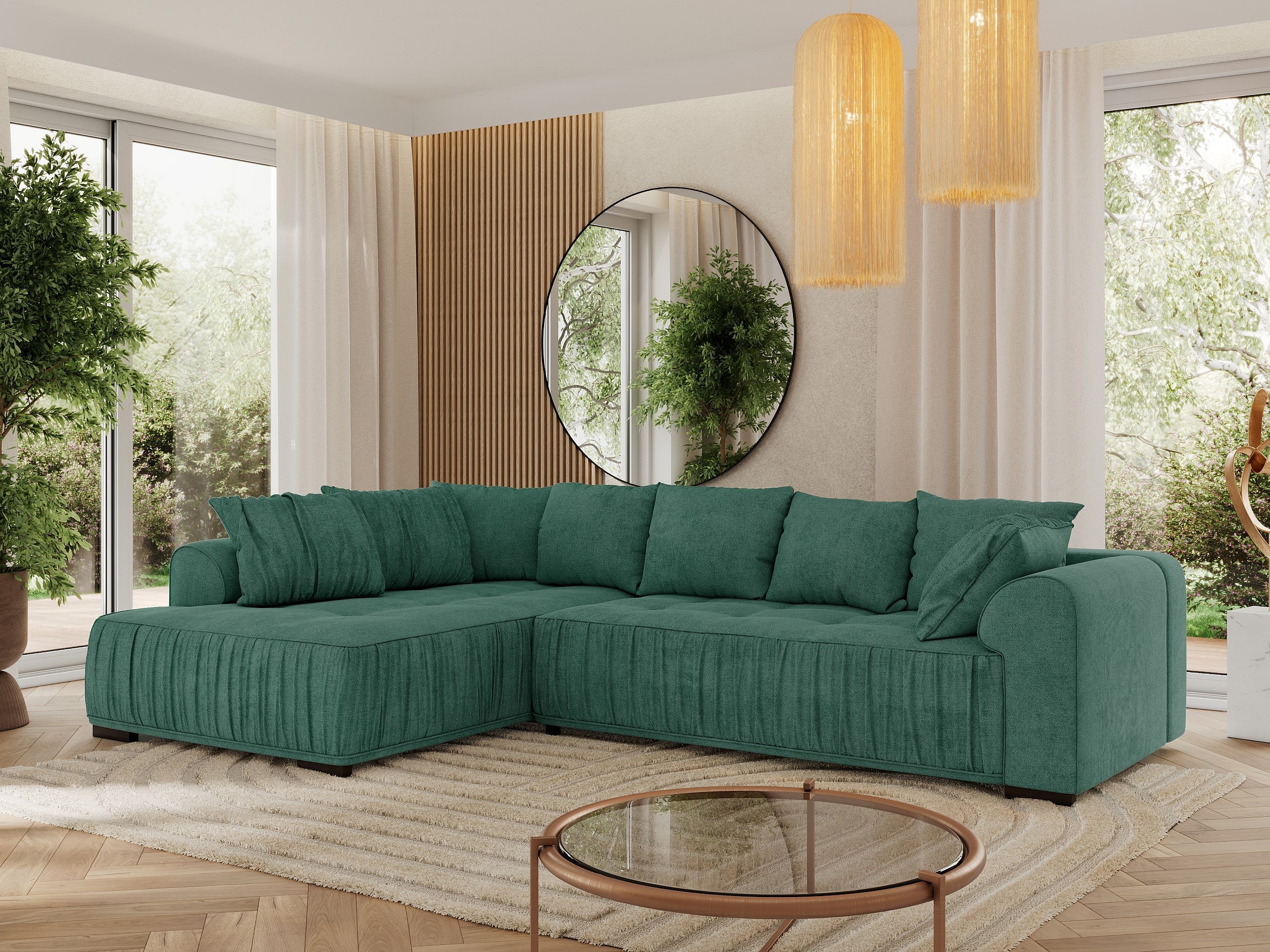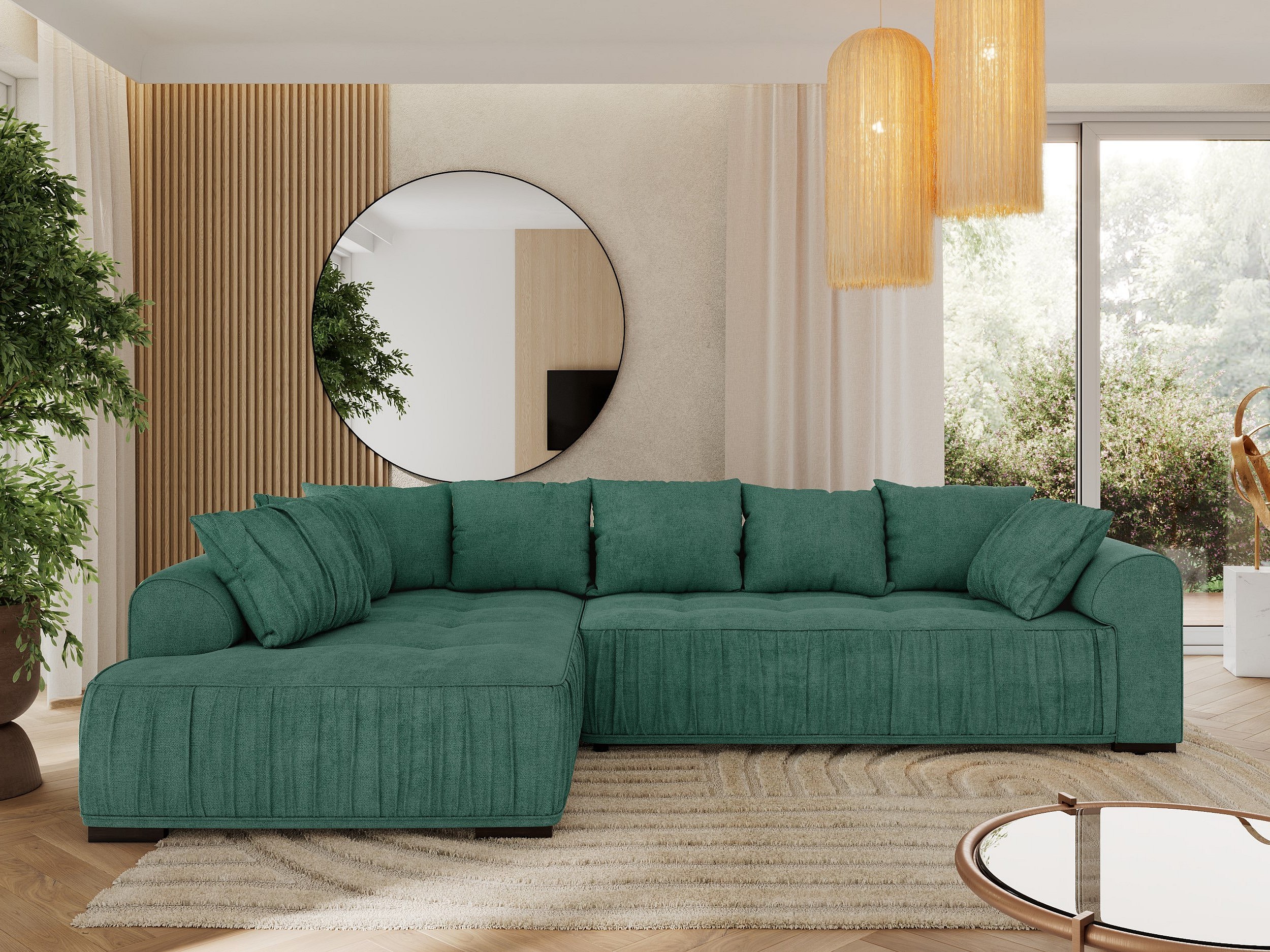 Ecksofa ORTA - Schlaffunktion und Bettkasten, lose Kissen, gesteppter Sitz, L-förmige Ecke - Grün Stukture - Ecke Links