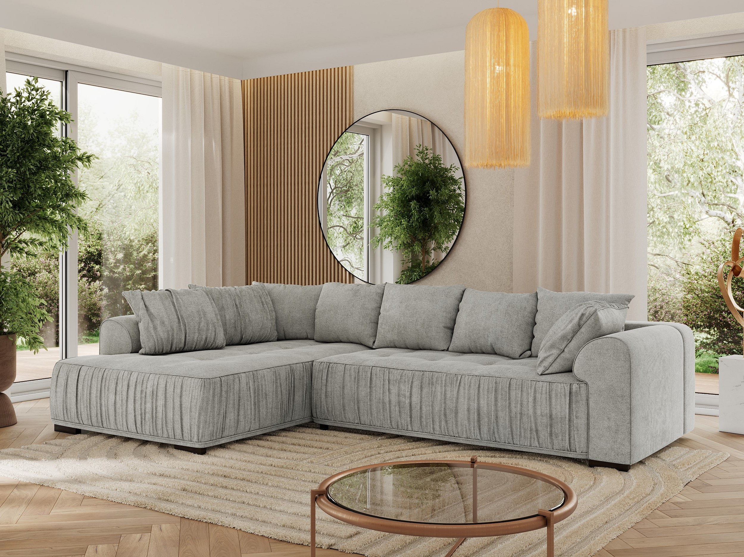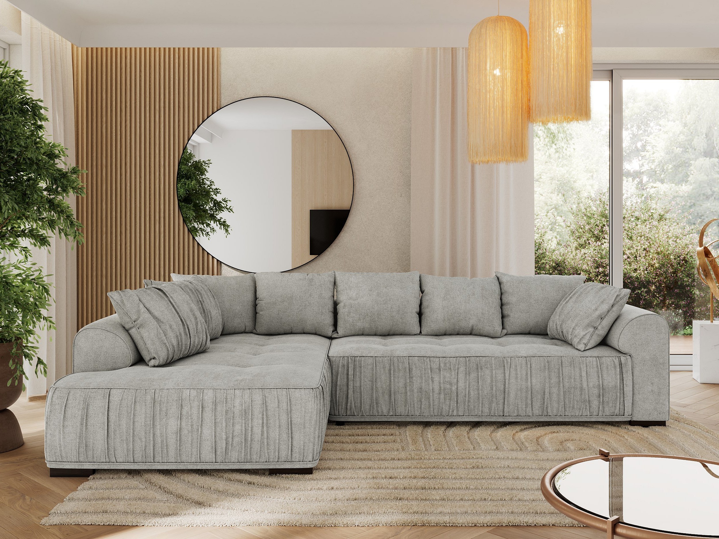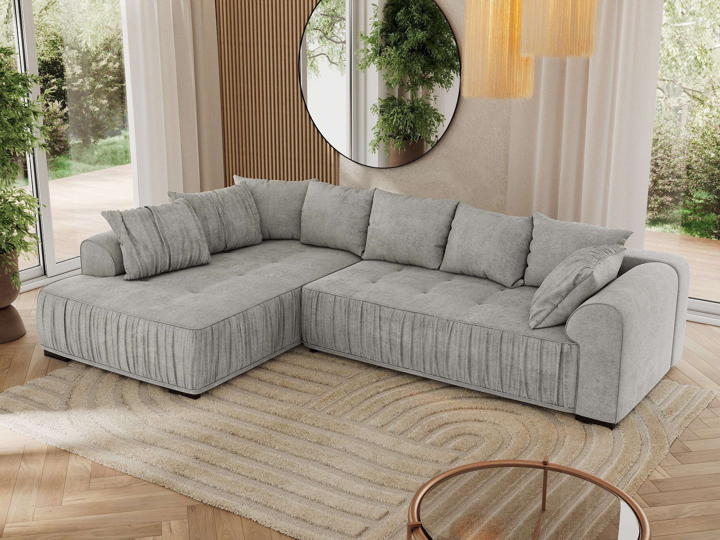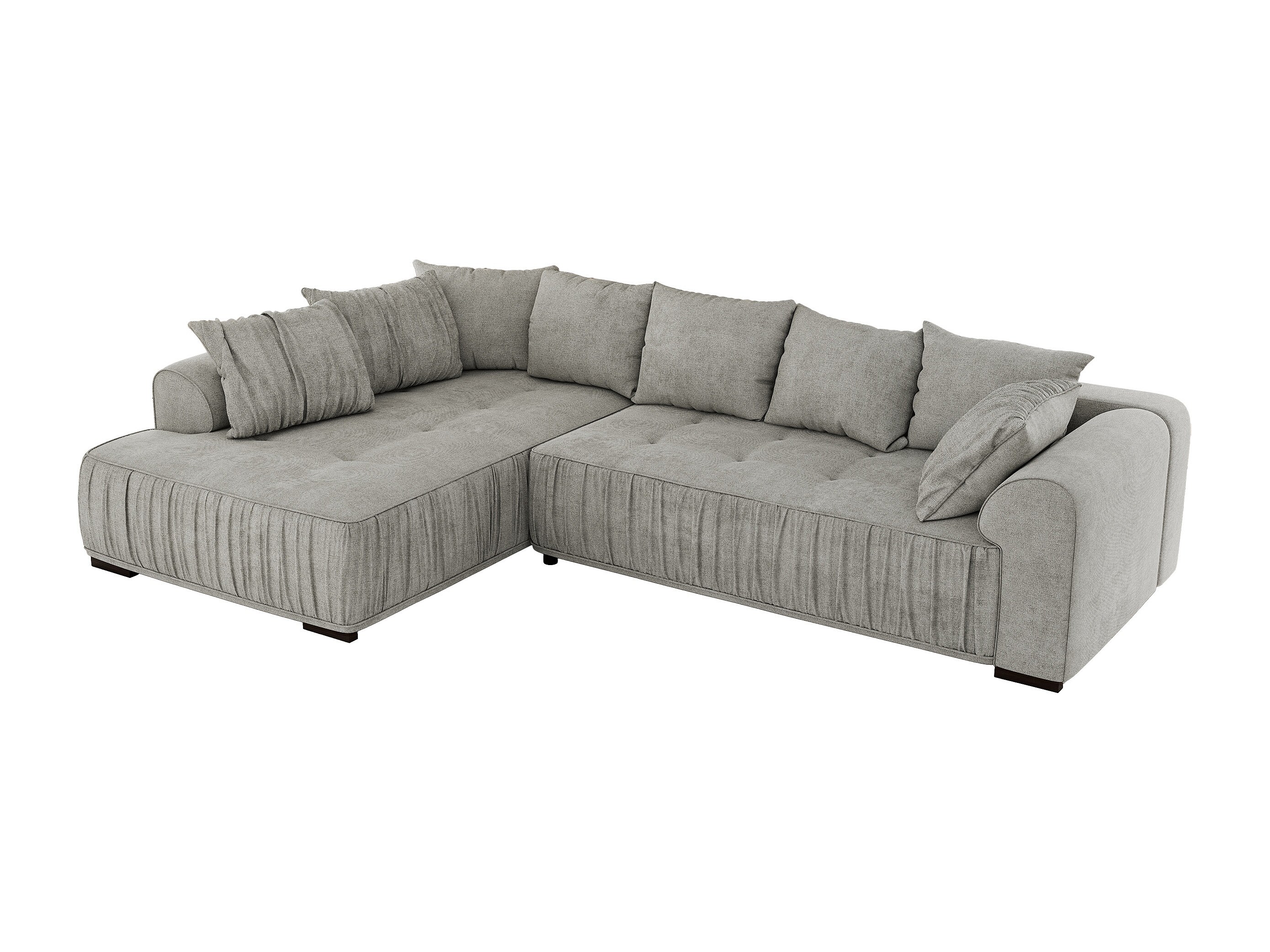 Ecksofa ORTA - Schlaffunktion und Bettkasten, lose Kissen, gesteppter Sitz, L-förmige Ecke - Hellgrau Stukture - Ecke Links
