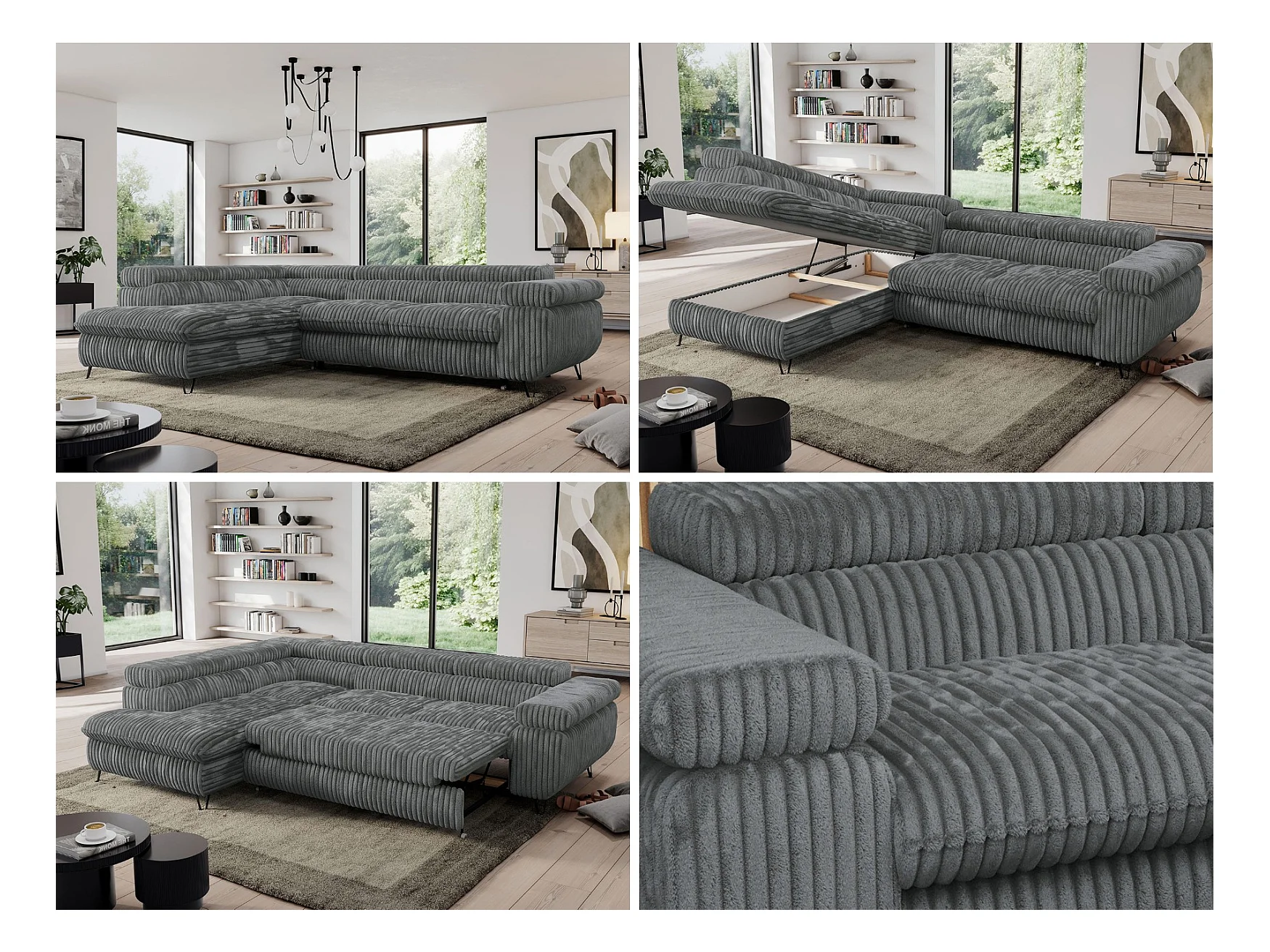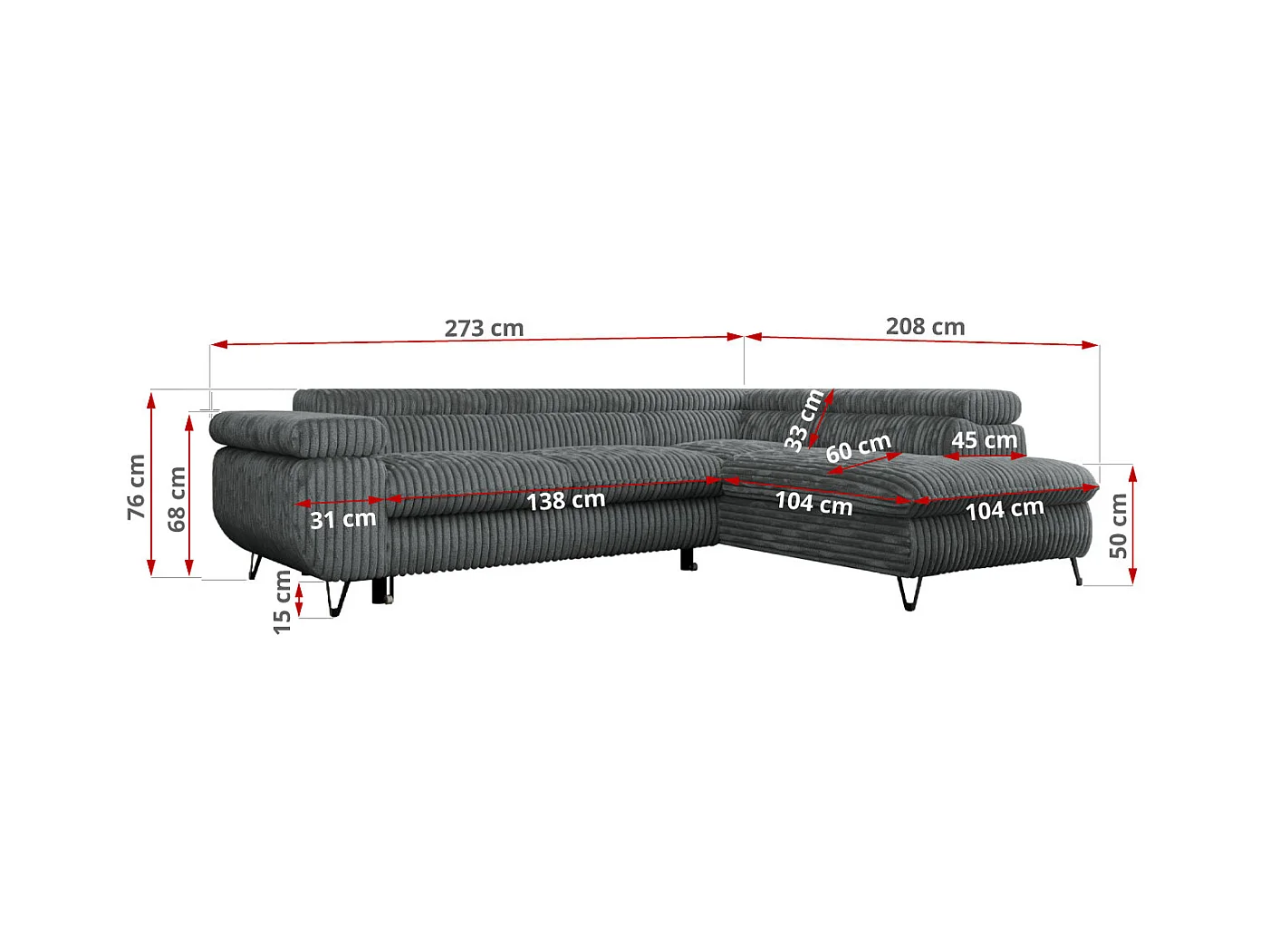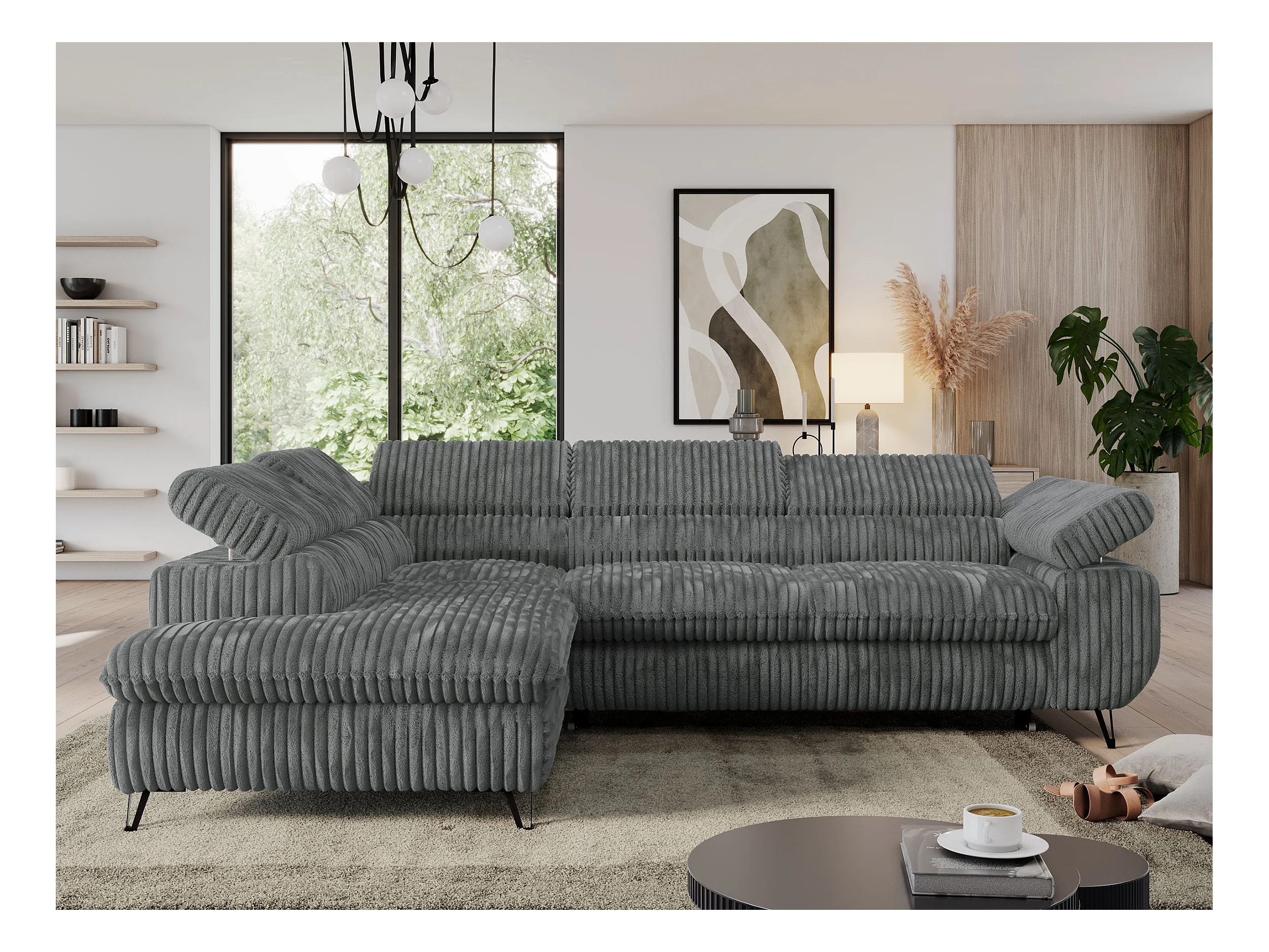 Ecksofa PEDRO - L-Form mit Schlaffunktion 200x125 cm, verstellbaren Kopfstützen - Dunkelgrau Cord - Ecke Links
