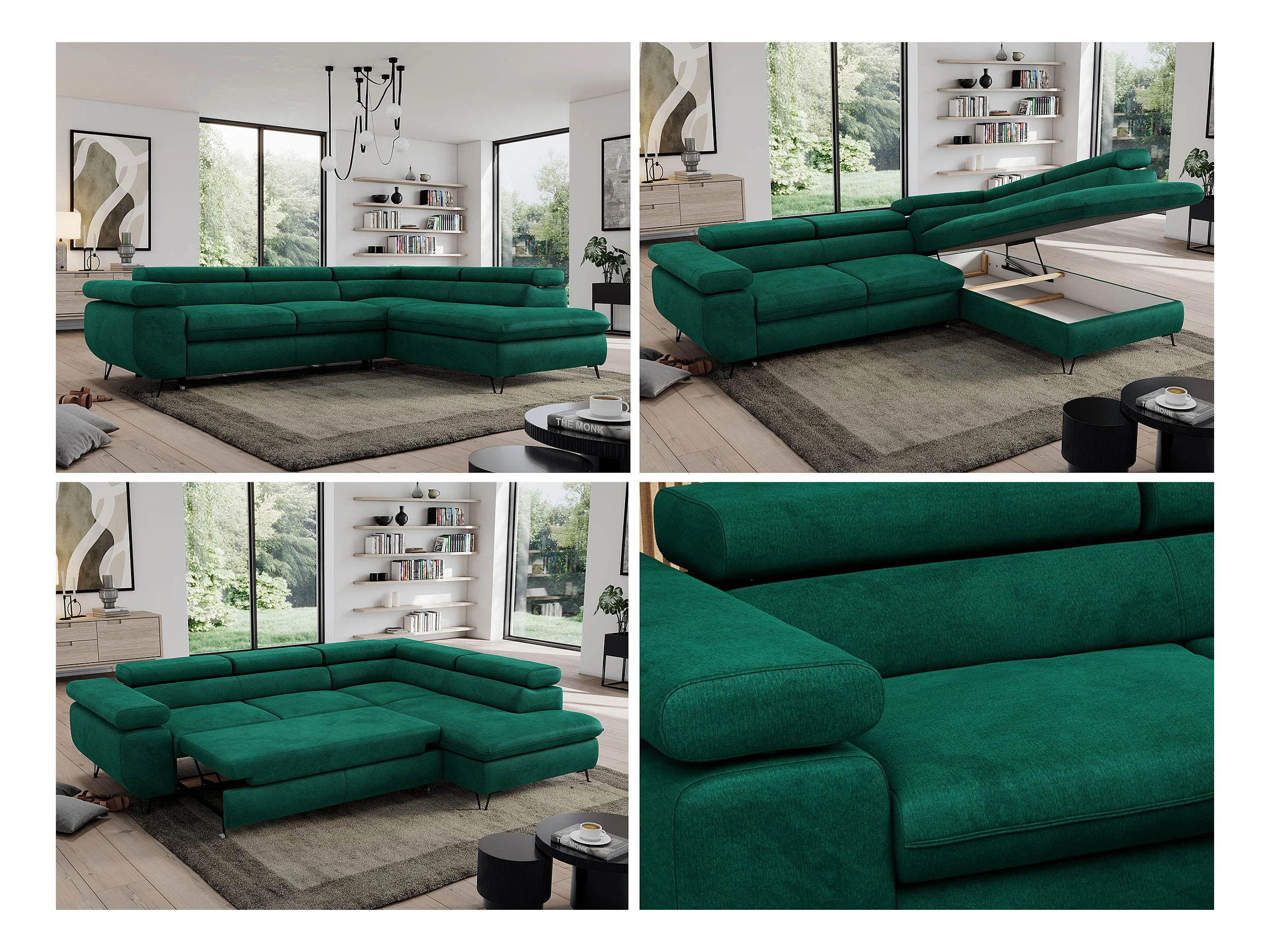 Ecksofa PEDRO - L-Form mit Schlaffunktion 200x125 cm, verstellbaren Kopfstützen - Dunkelgrün Velvet - Ecke Rechts