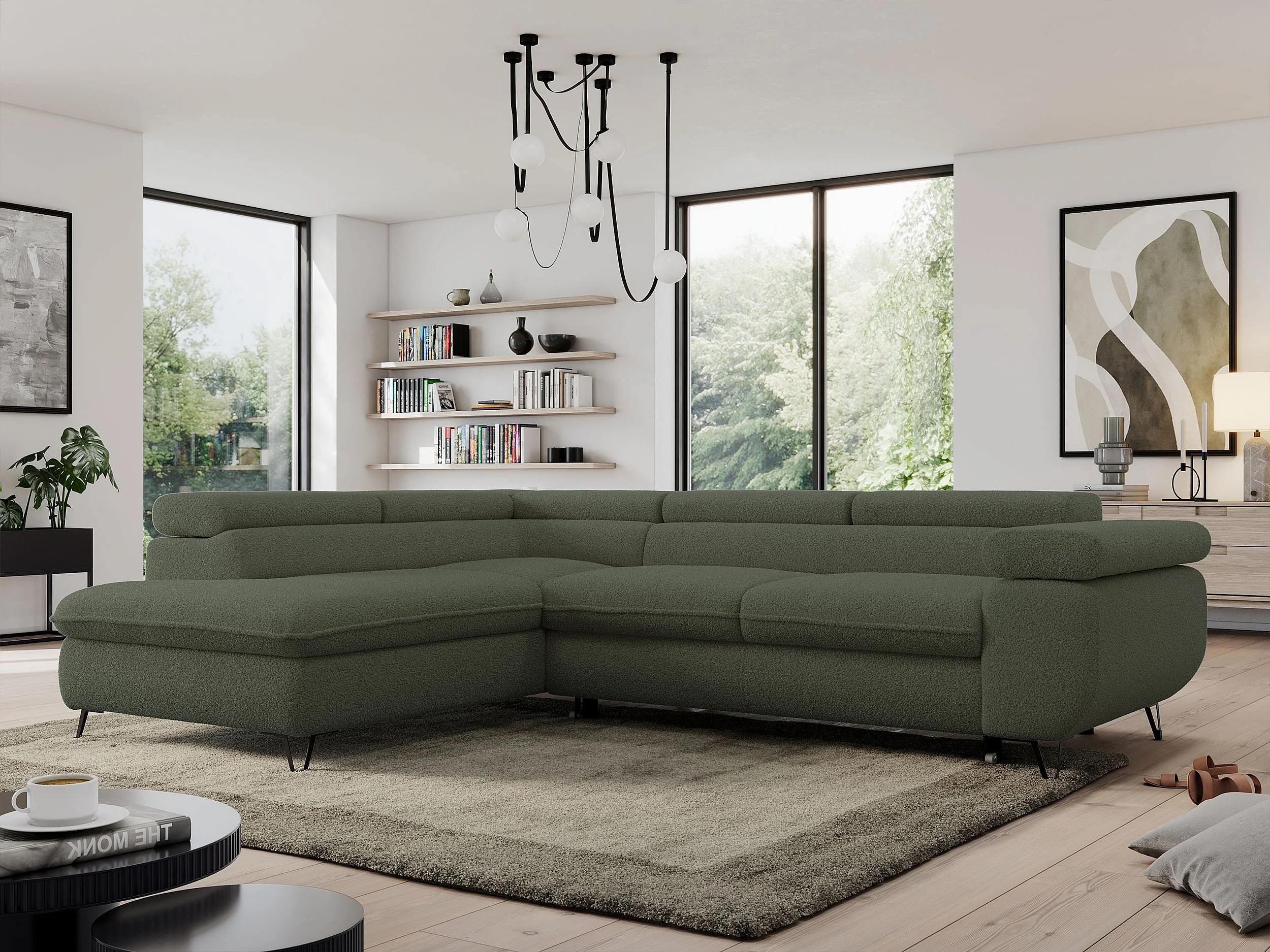 Ecksofa PEDRO - L-Form mit Schlaffunktion 200x125 cm, verstellbaren Kopfstützen - Grün Boucle - Ecke Links