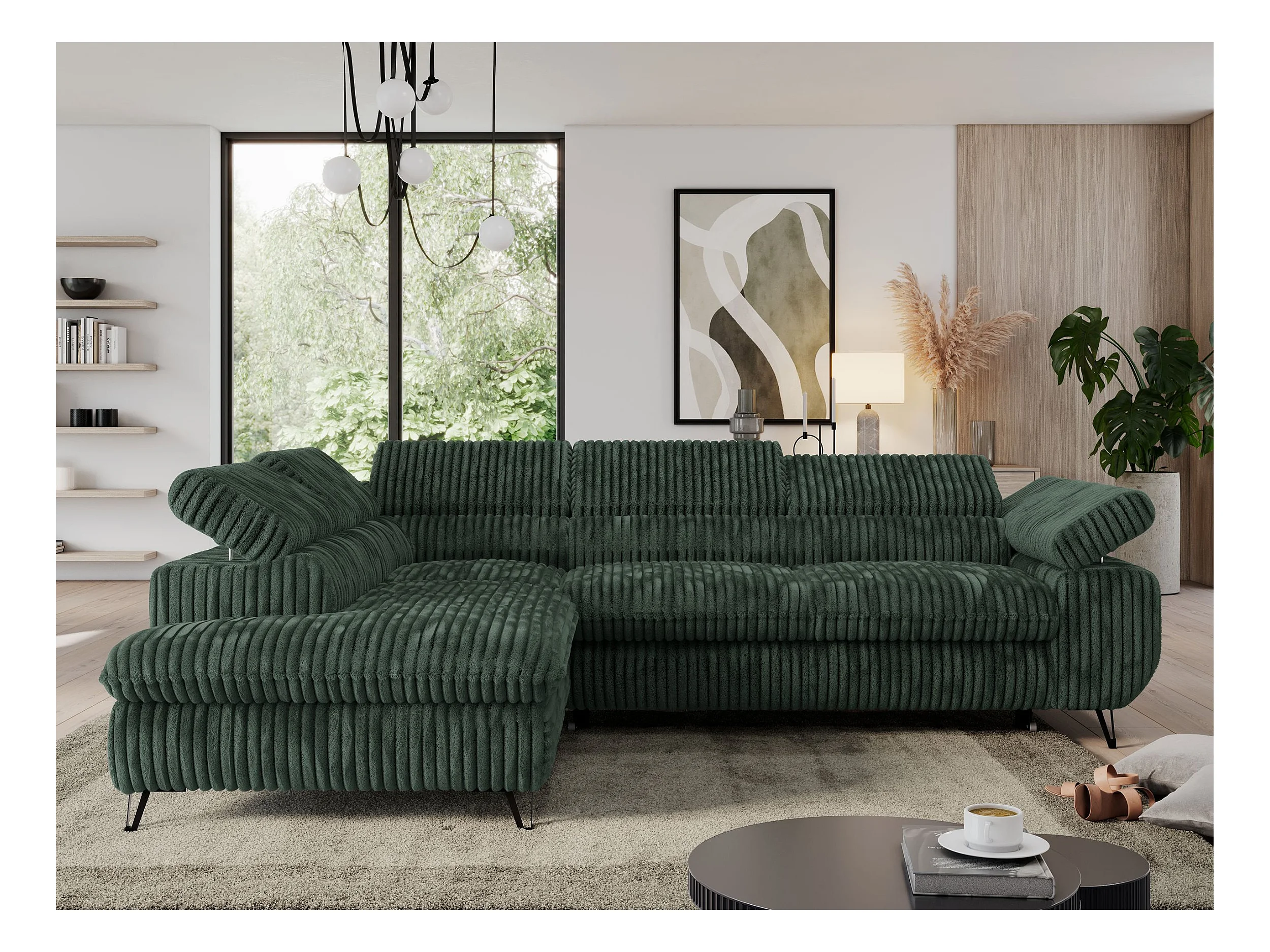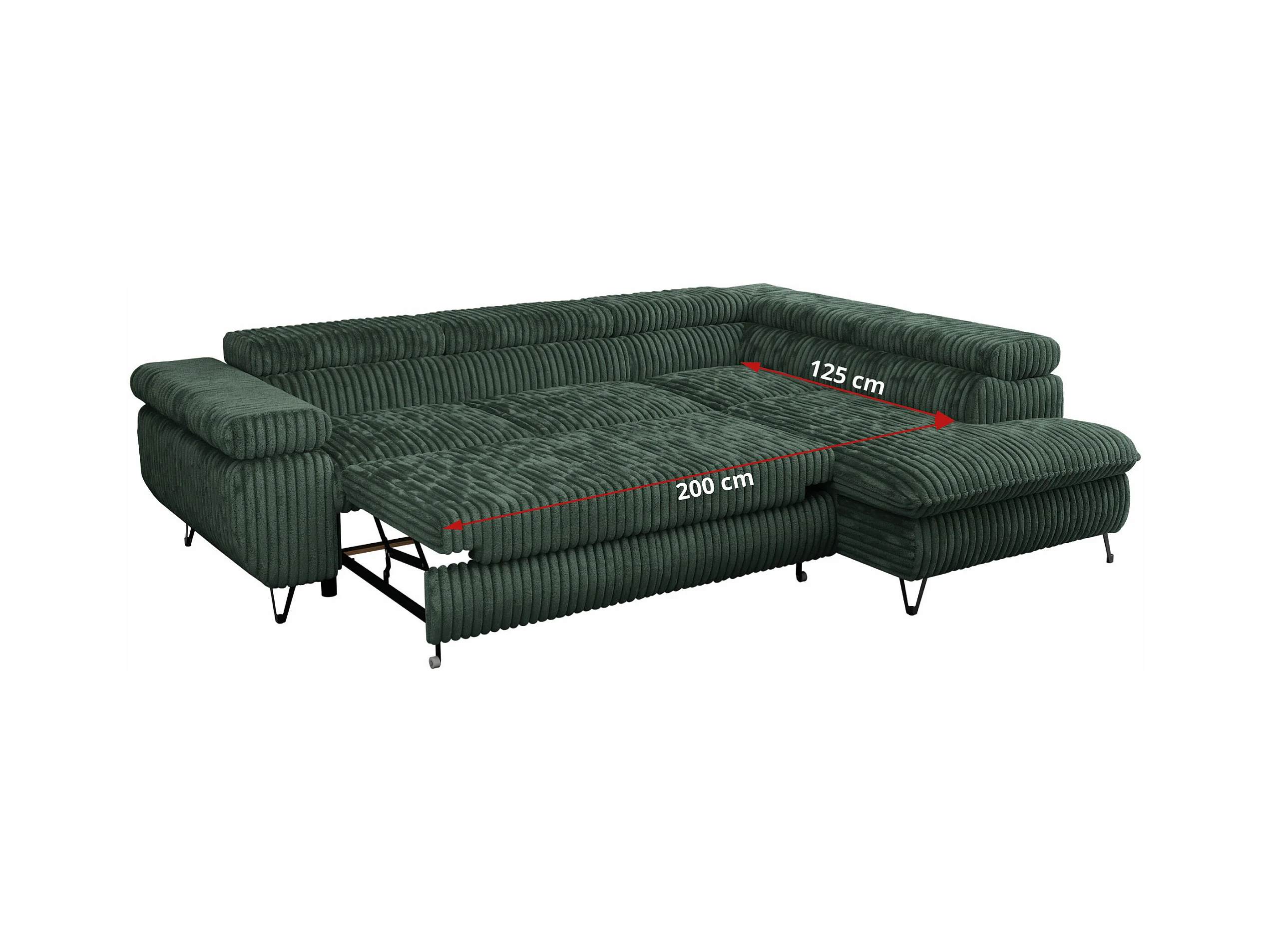 Ecksofa PEDRO - L-Form mit Schlaffunktion 200x125 cm, verstellbaren Kopfstützen - Grün Cord - Ecke Links