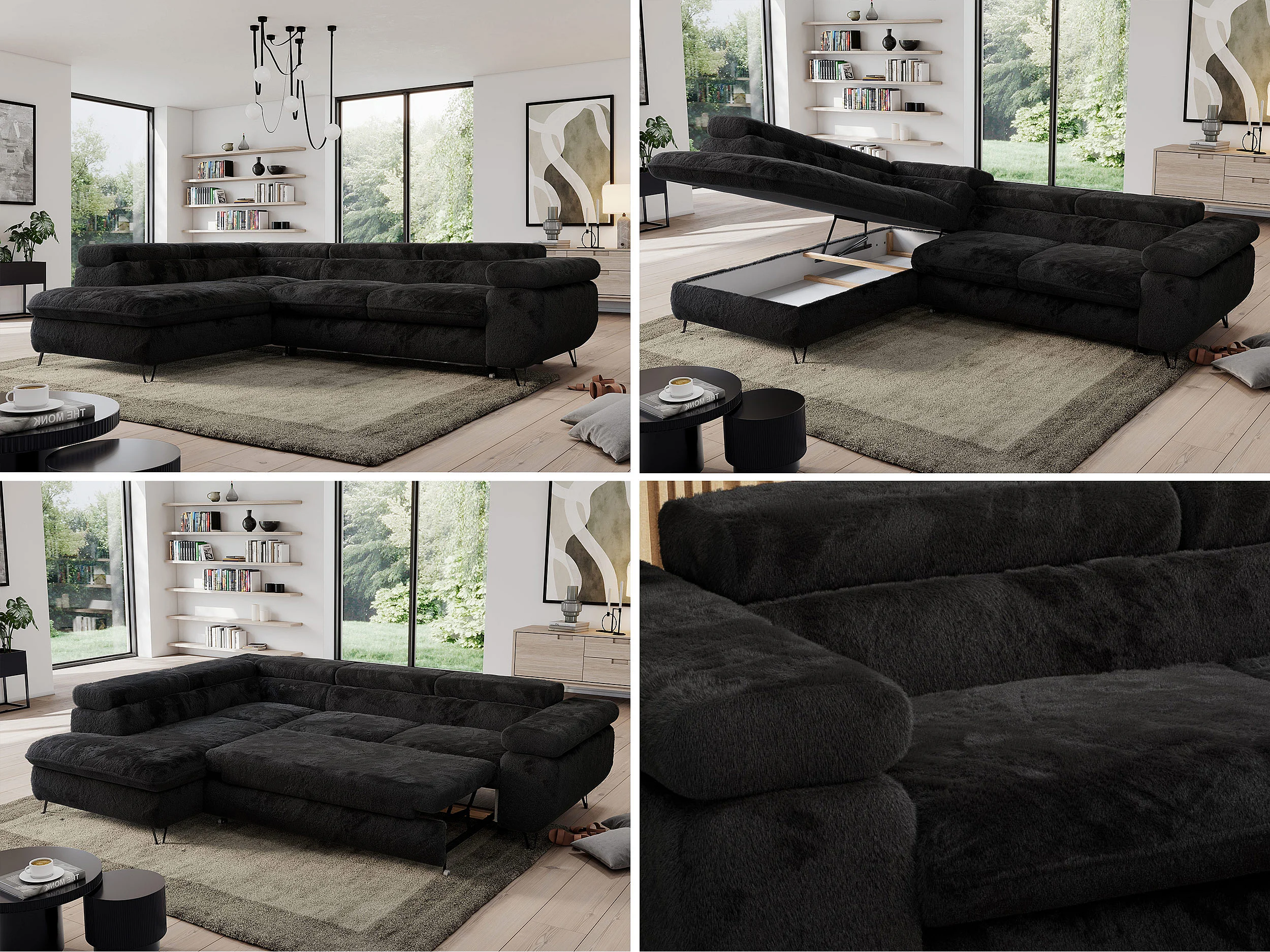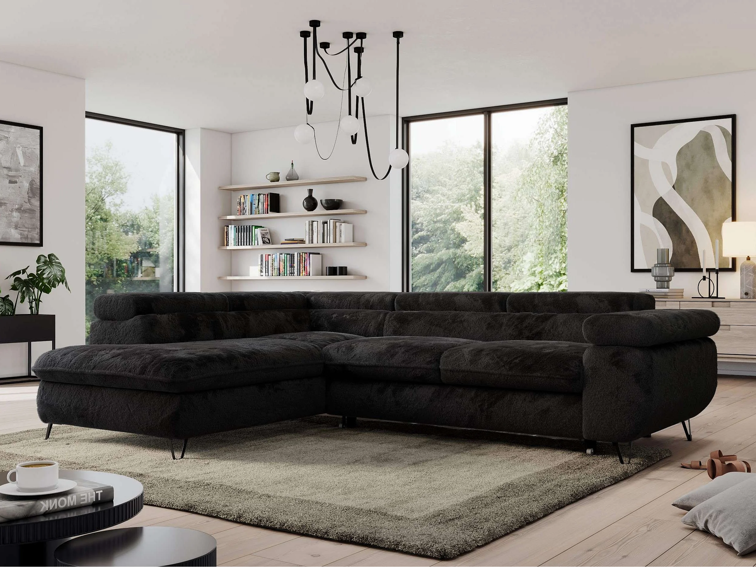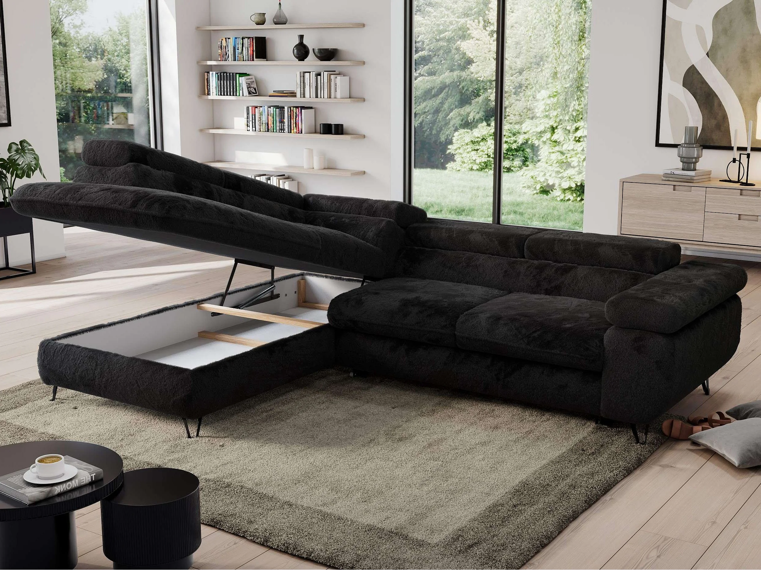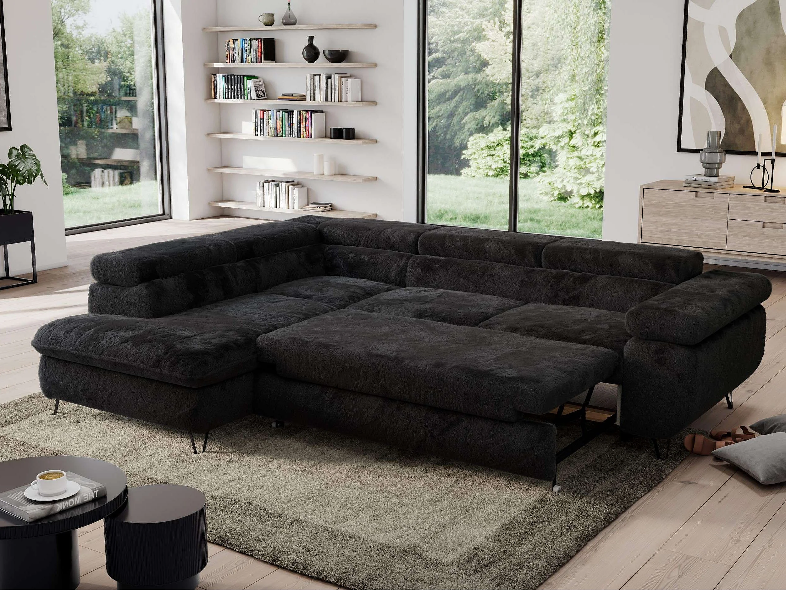 Ecksofa PEDRO - L-Form mit Schlaffunktion 200x125 cm, verstellbaren Kopfstützen - Schwarz Plüsch - Ecke Links