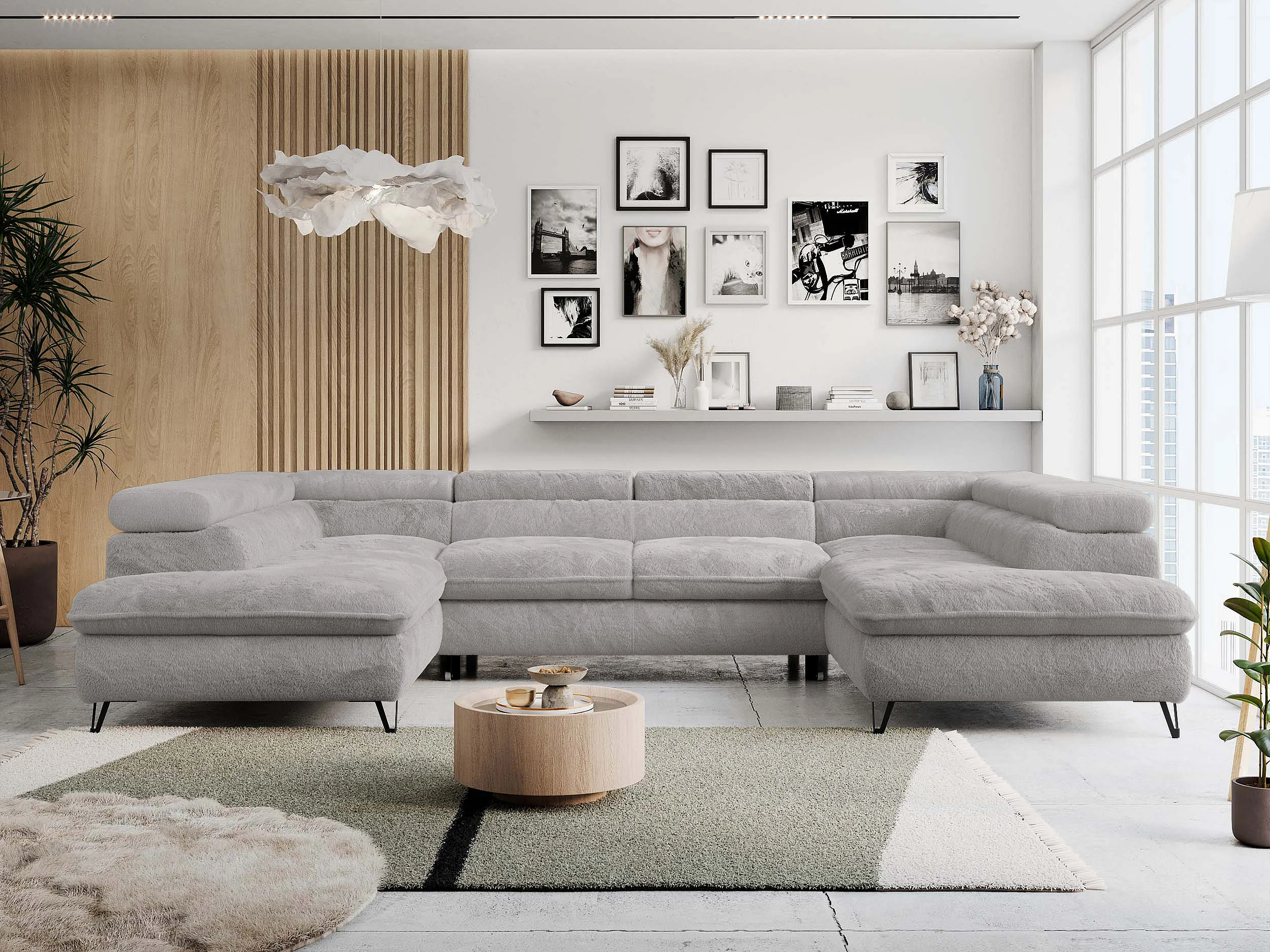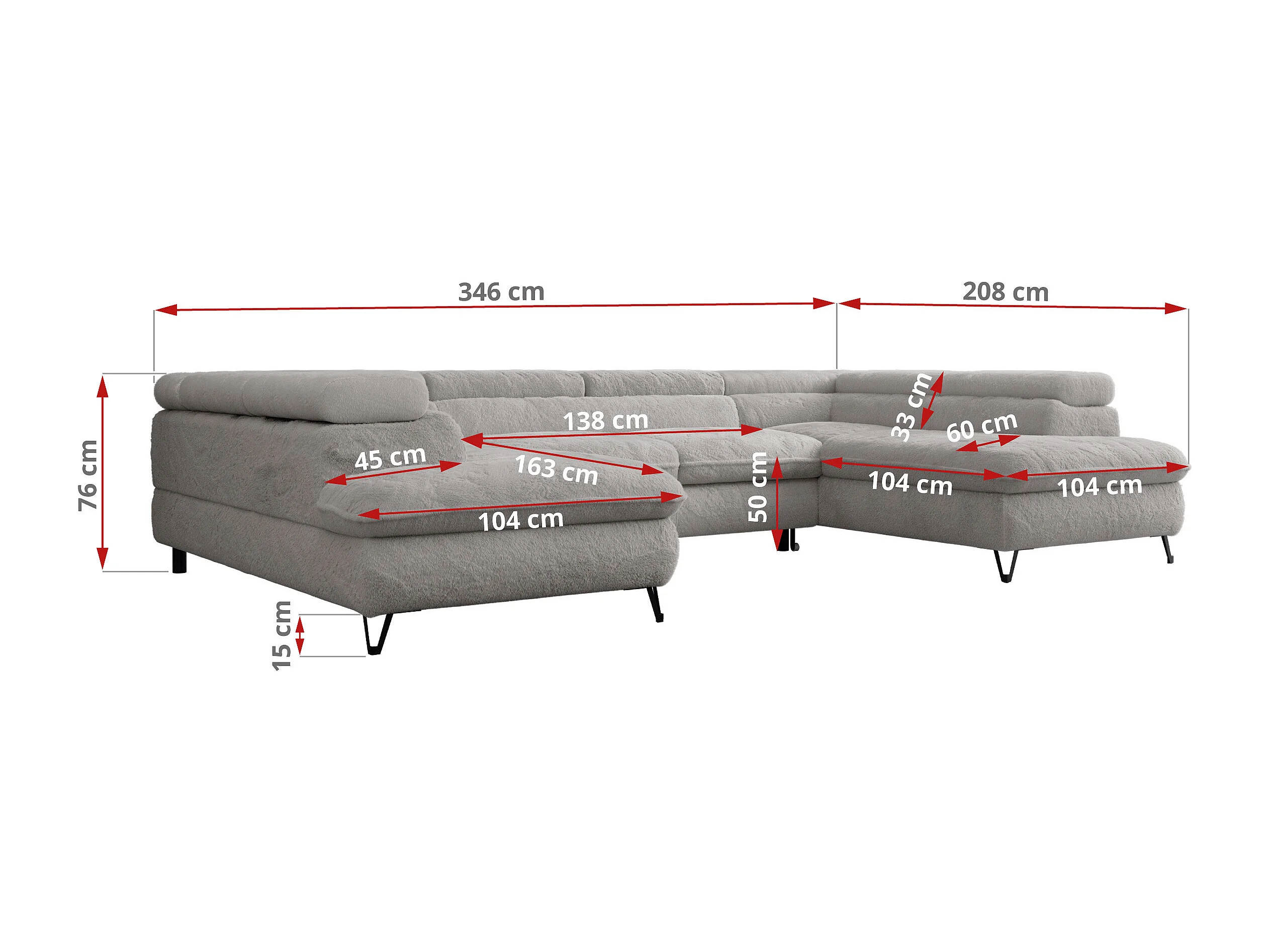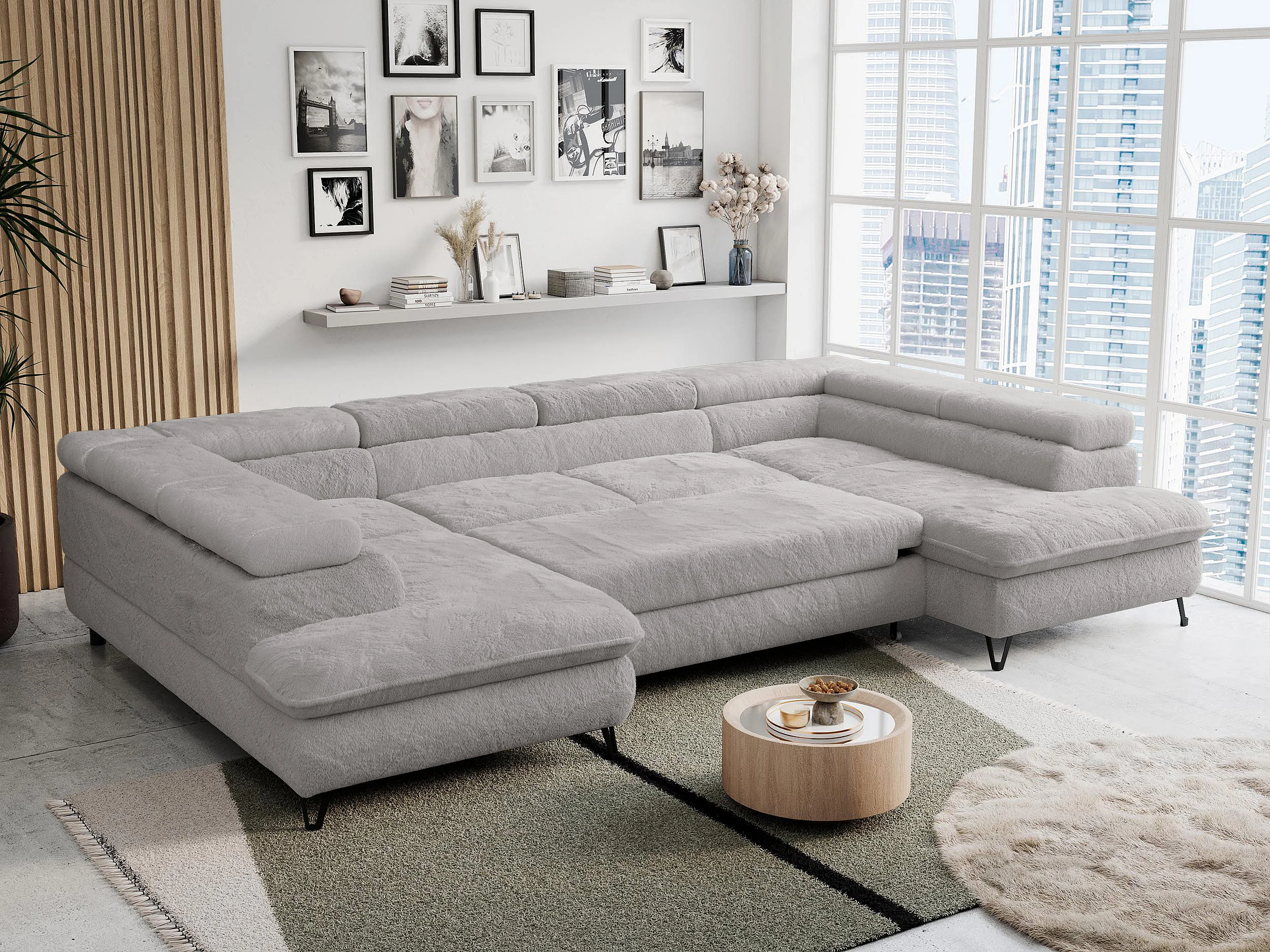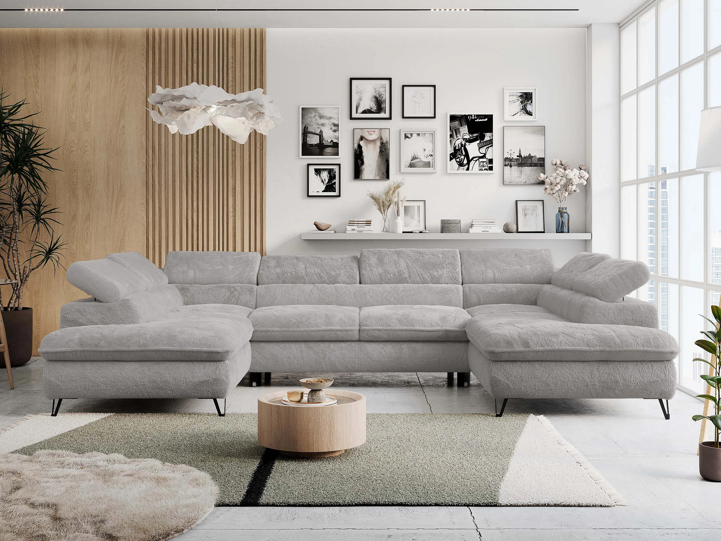 Ecksofa PETER U - schlaffunktion und Bettkästen, verstellbare Kopfstützen - Aschgrau Plüsch