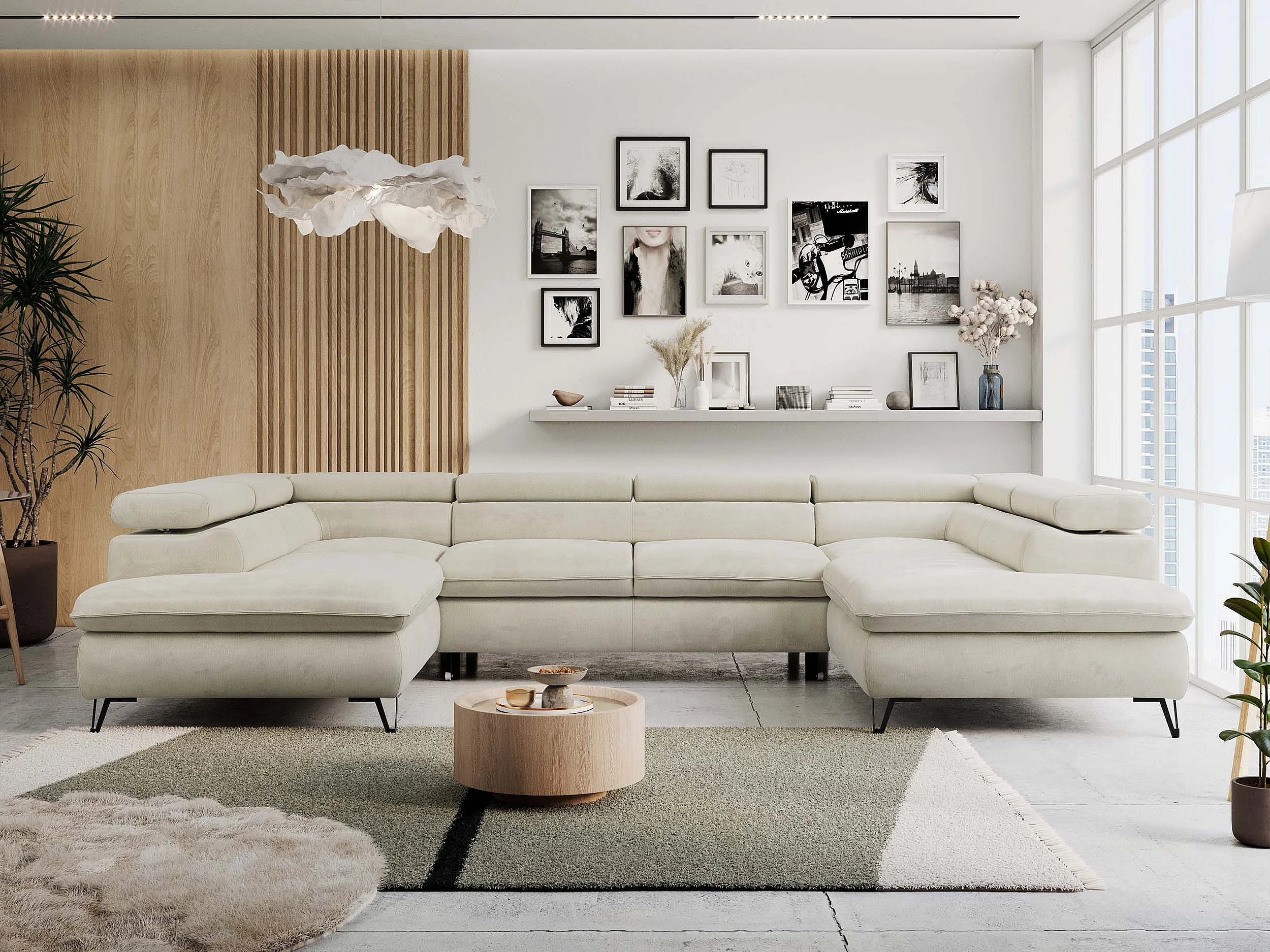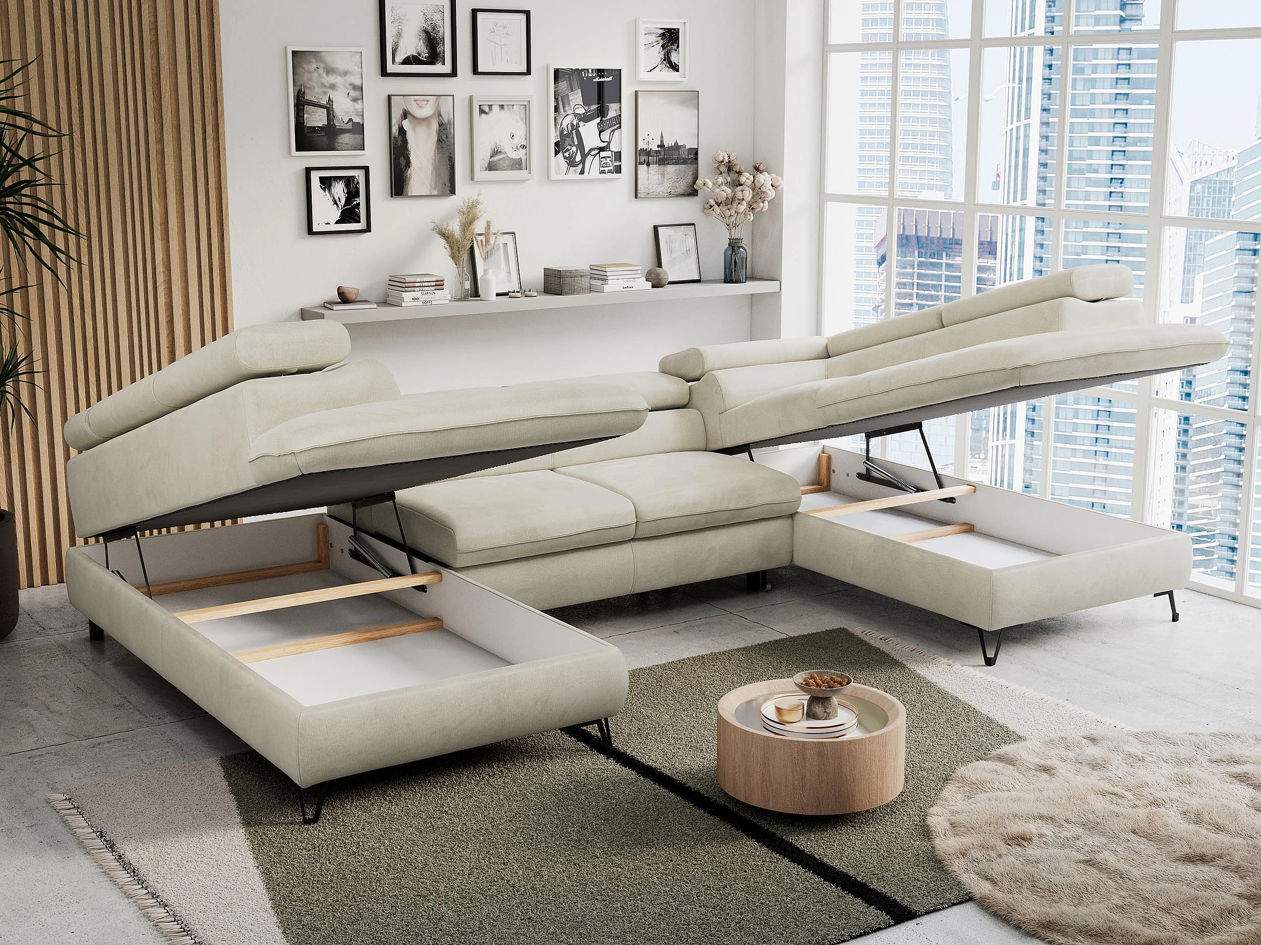 Ecksofa PETER U - schlaffunktion und Bettkästen, verstellbare Kopfstützen - Beige Velvet