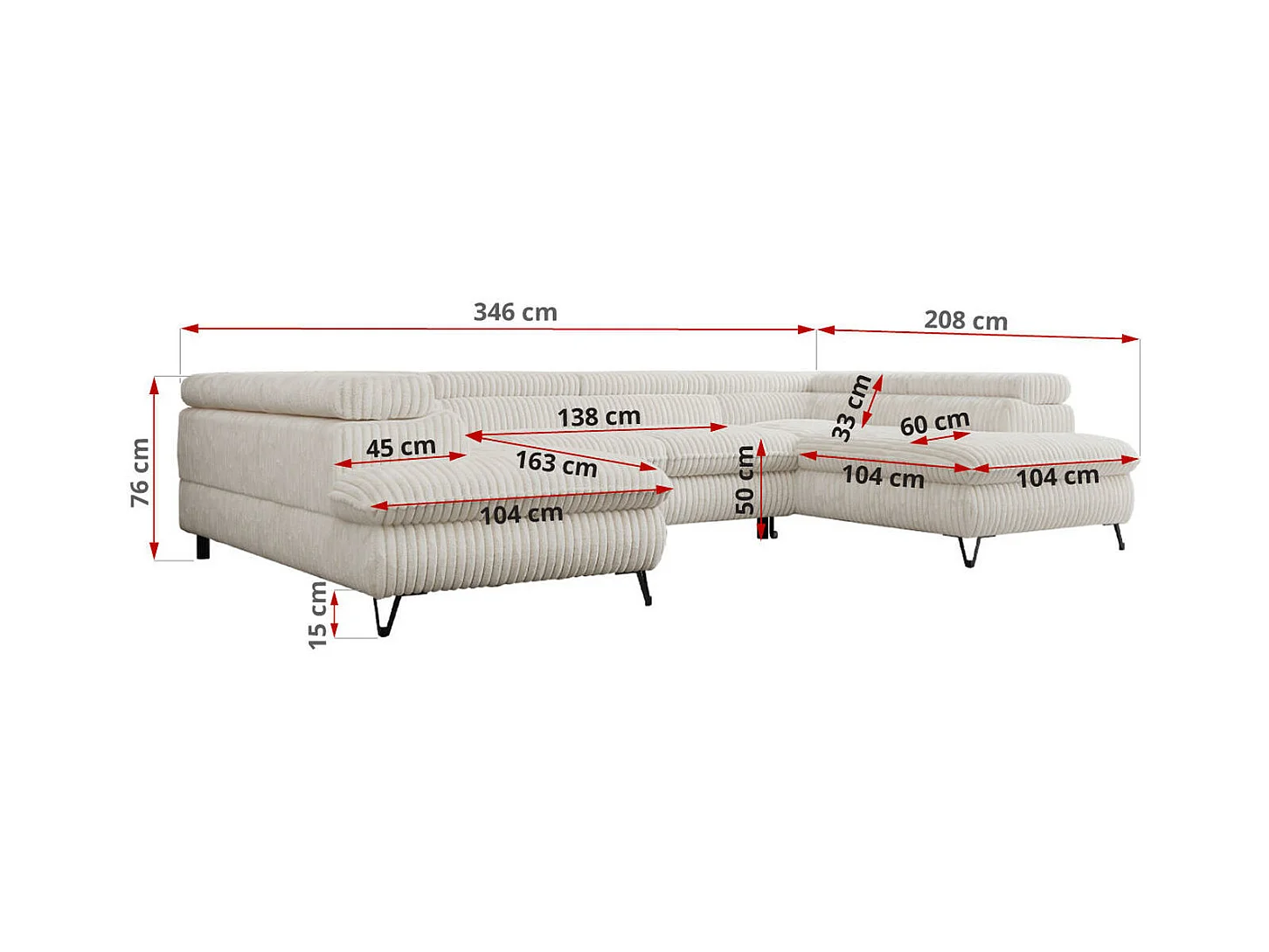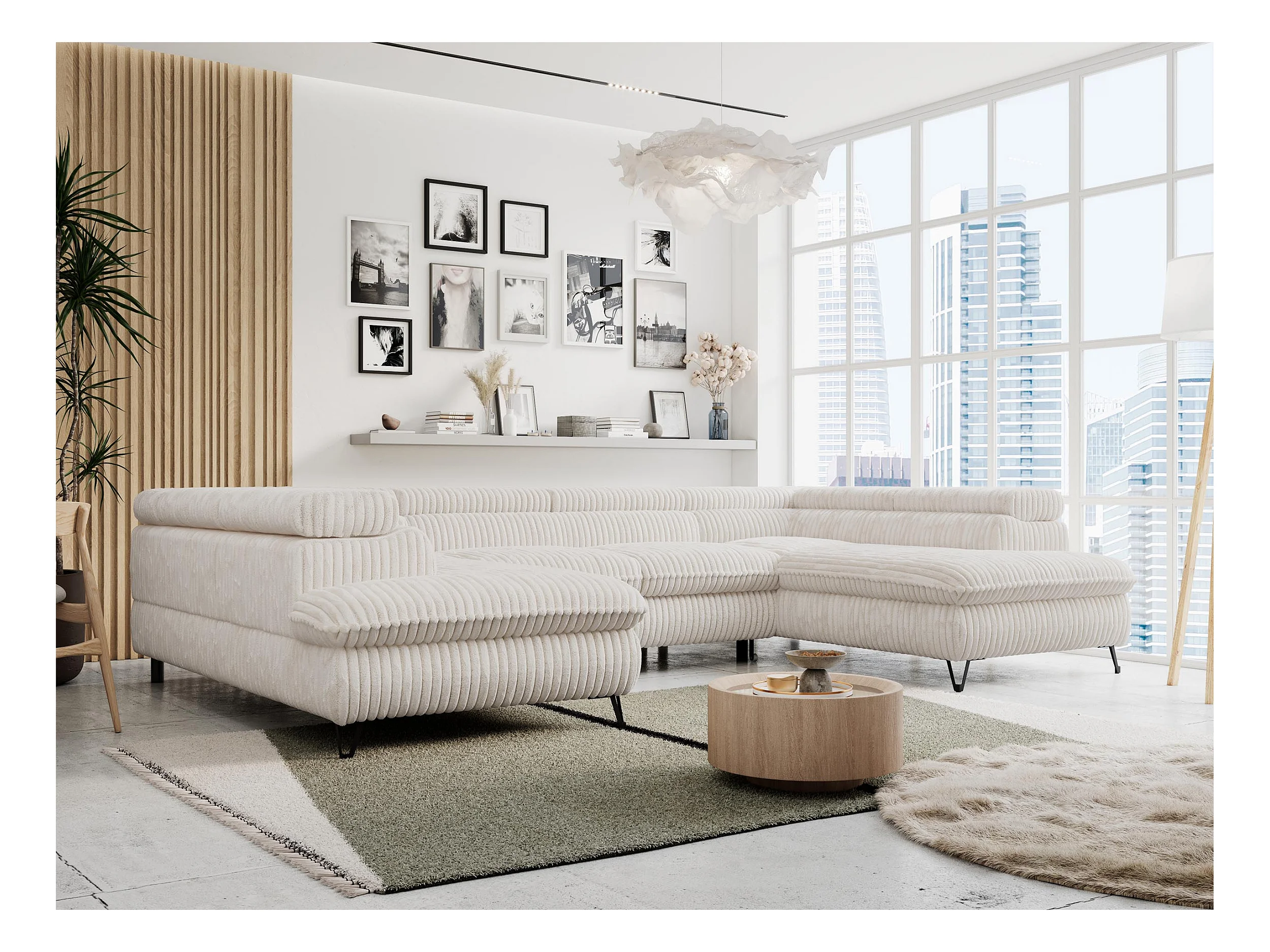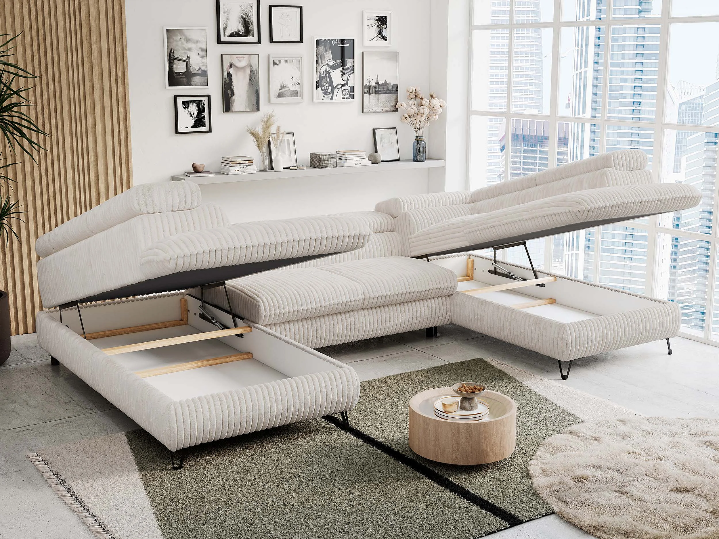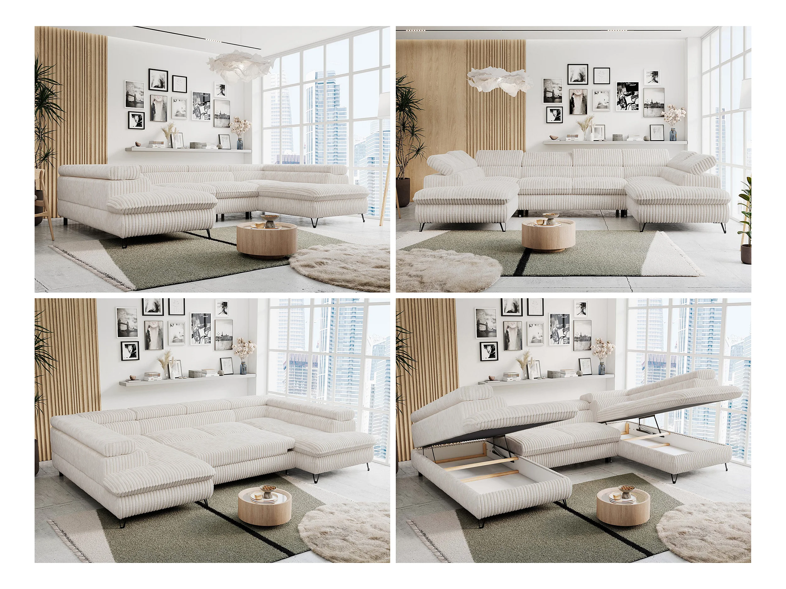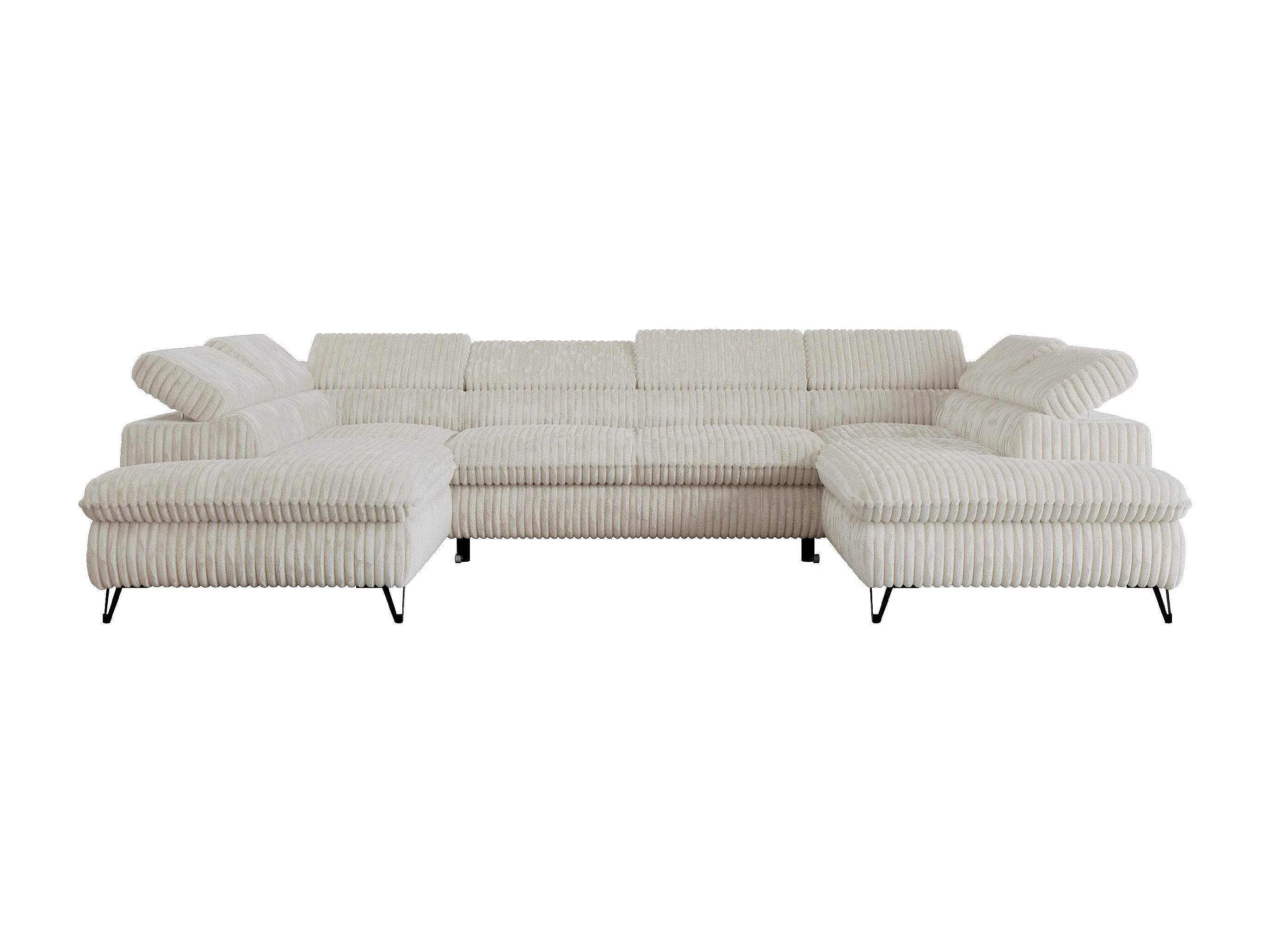 Ecksofa PETER U - schlaffunktion und Bettkästen, verstellbare Kopfstützen - Creme Cord