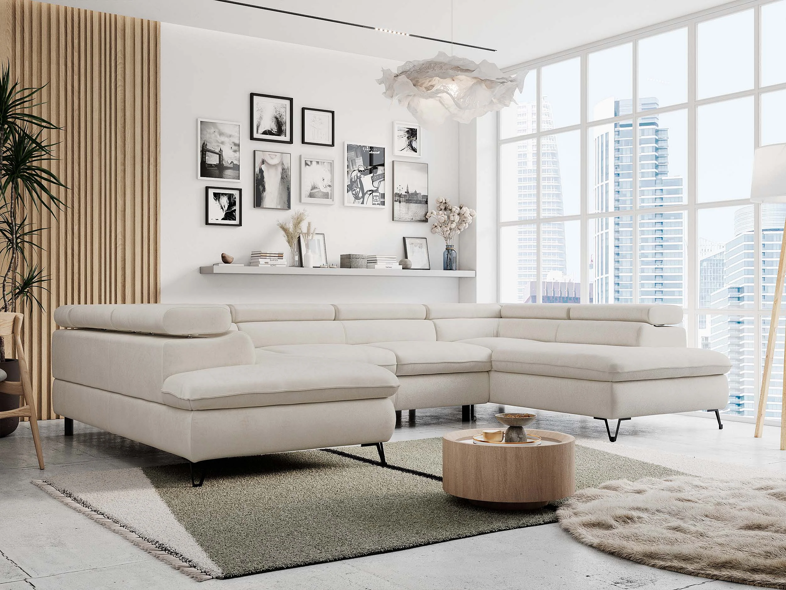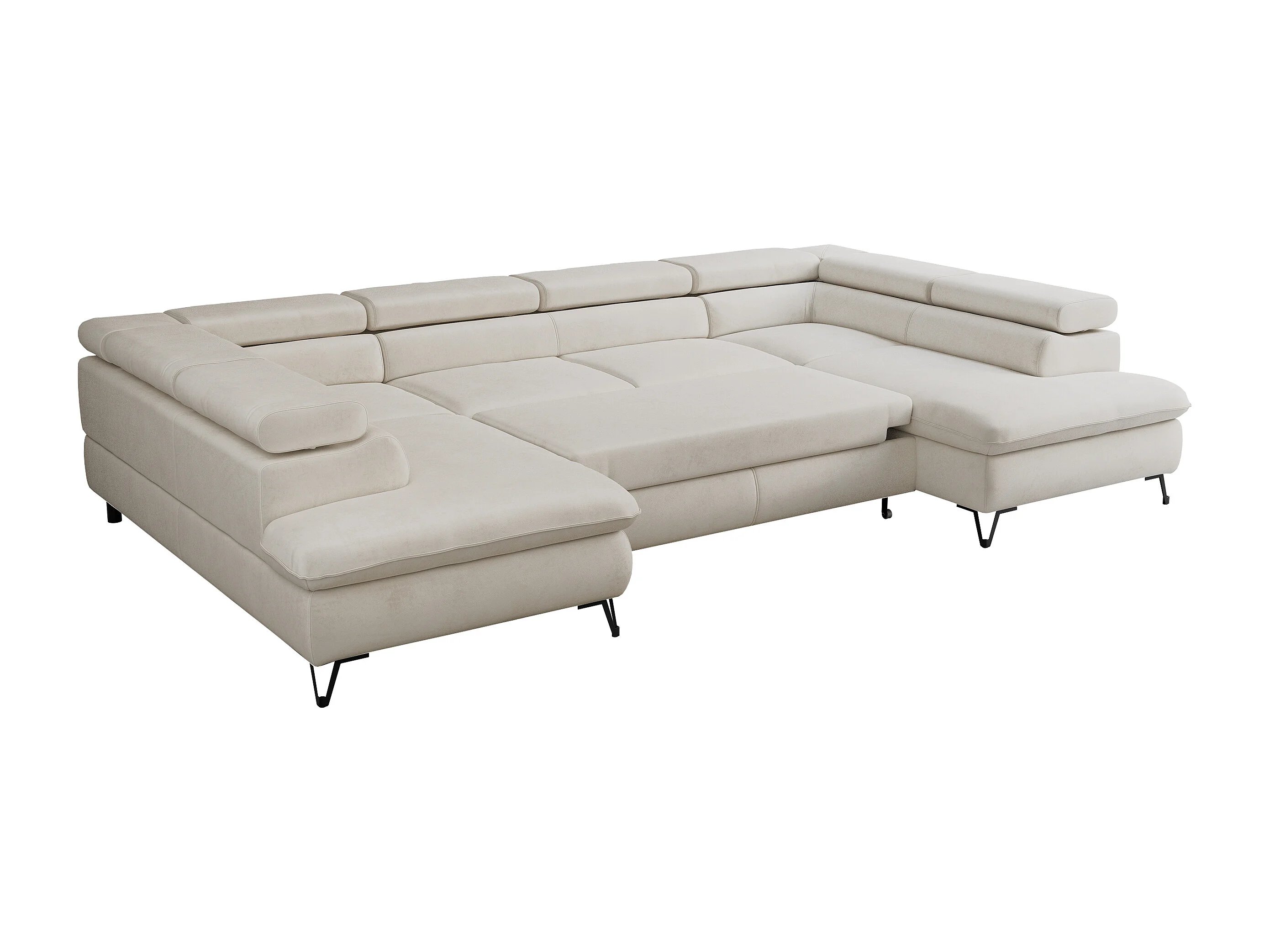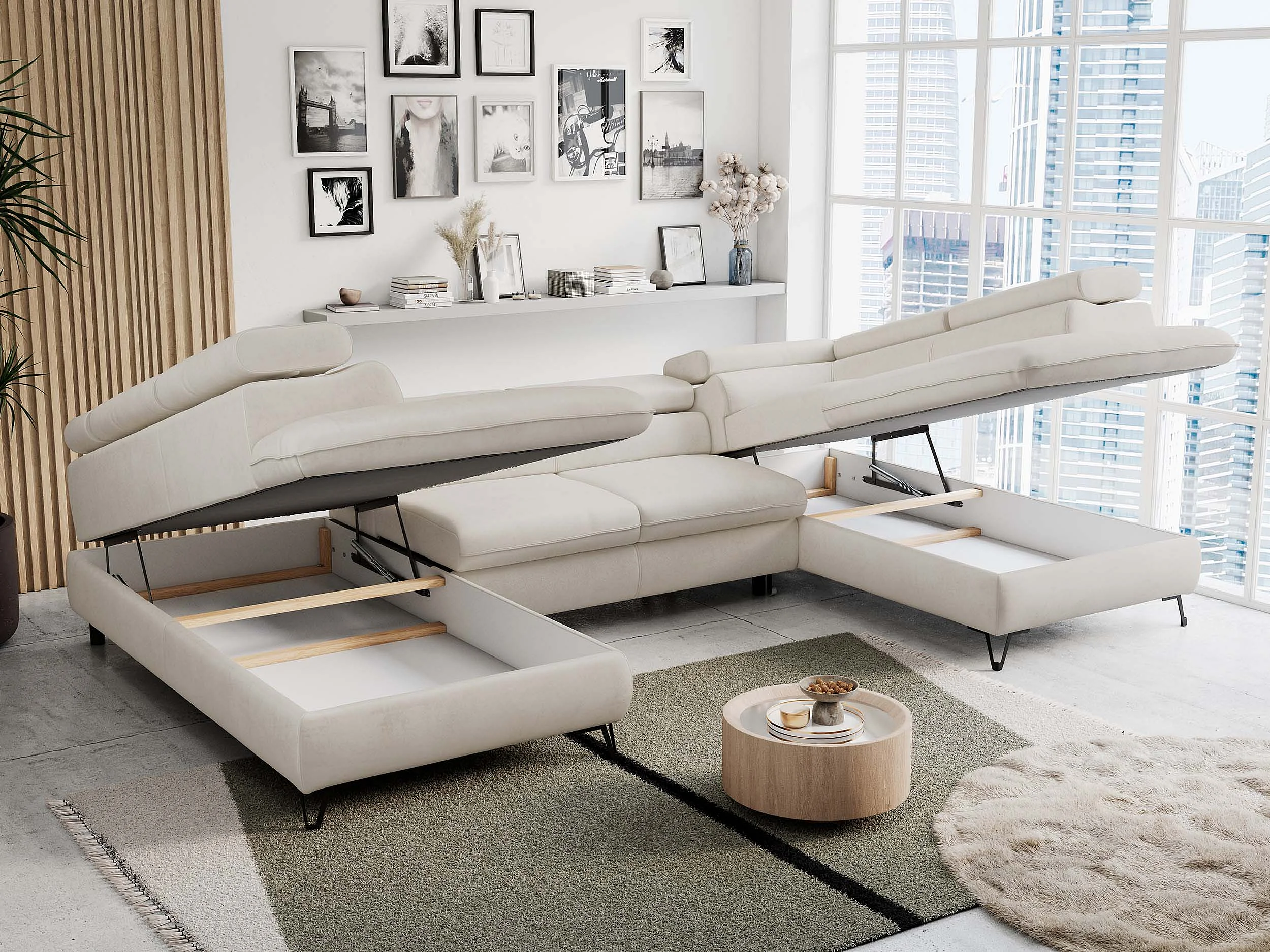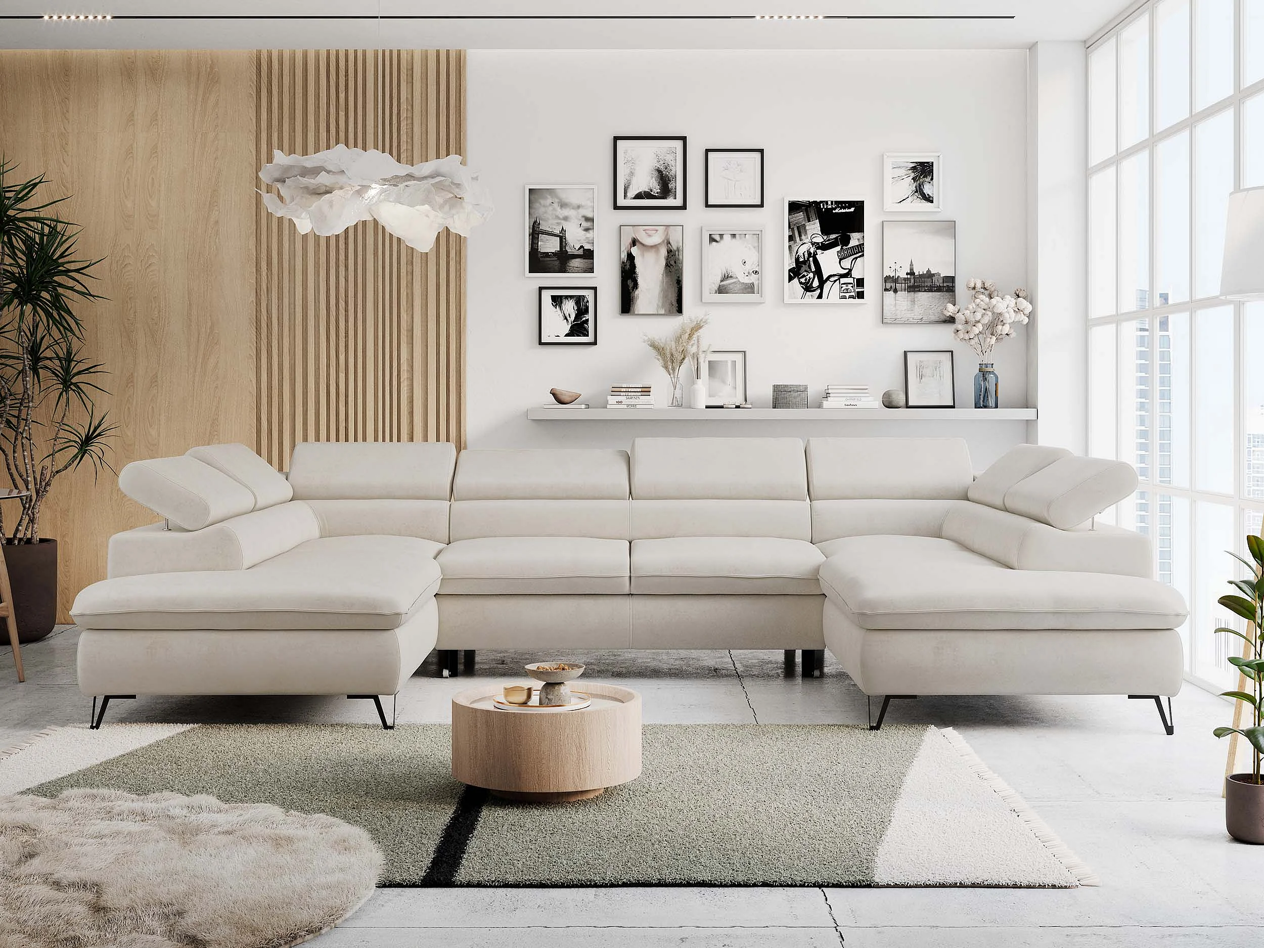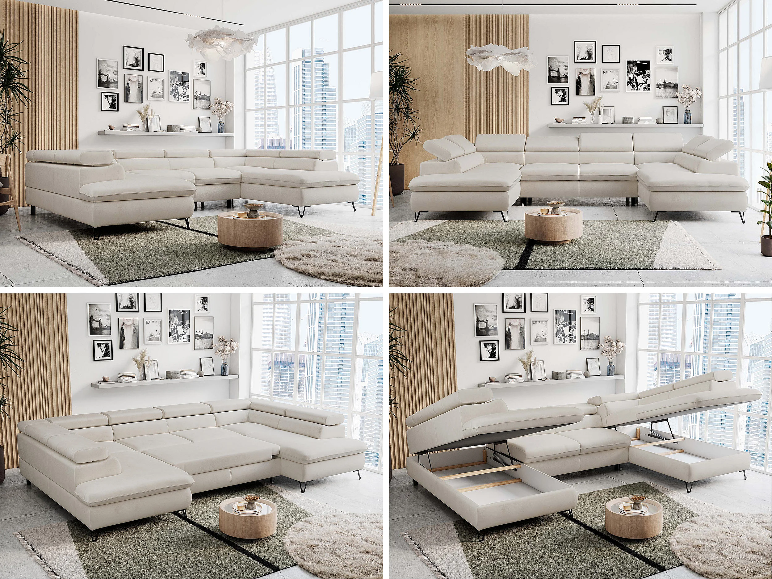 Ecksofa PETER U - schlaffunktion und Bettkästen, verstellbare Kopfstützen - Creme Velvet
