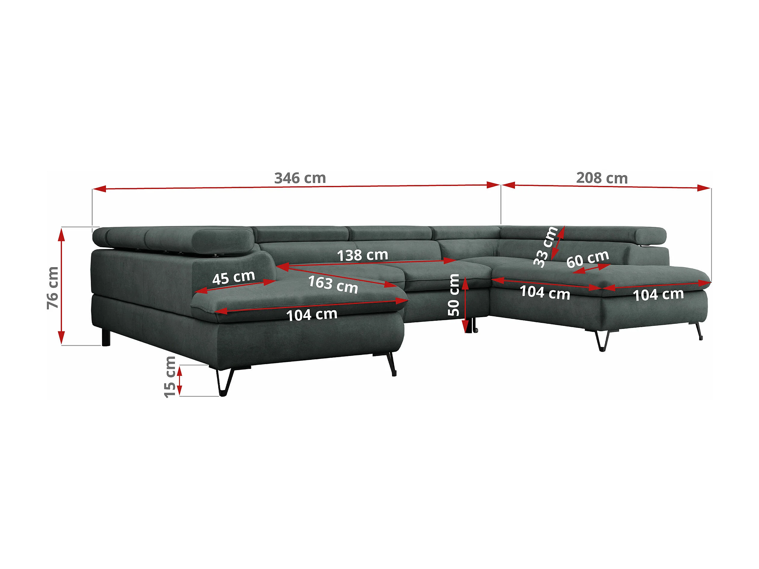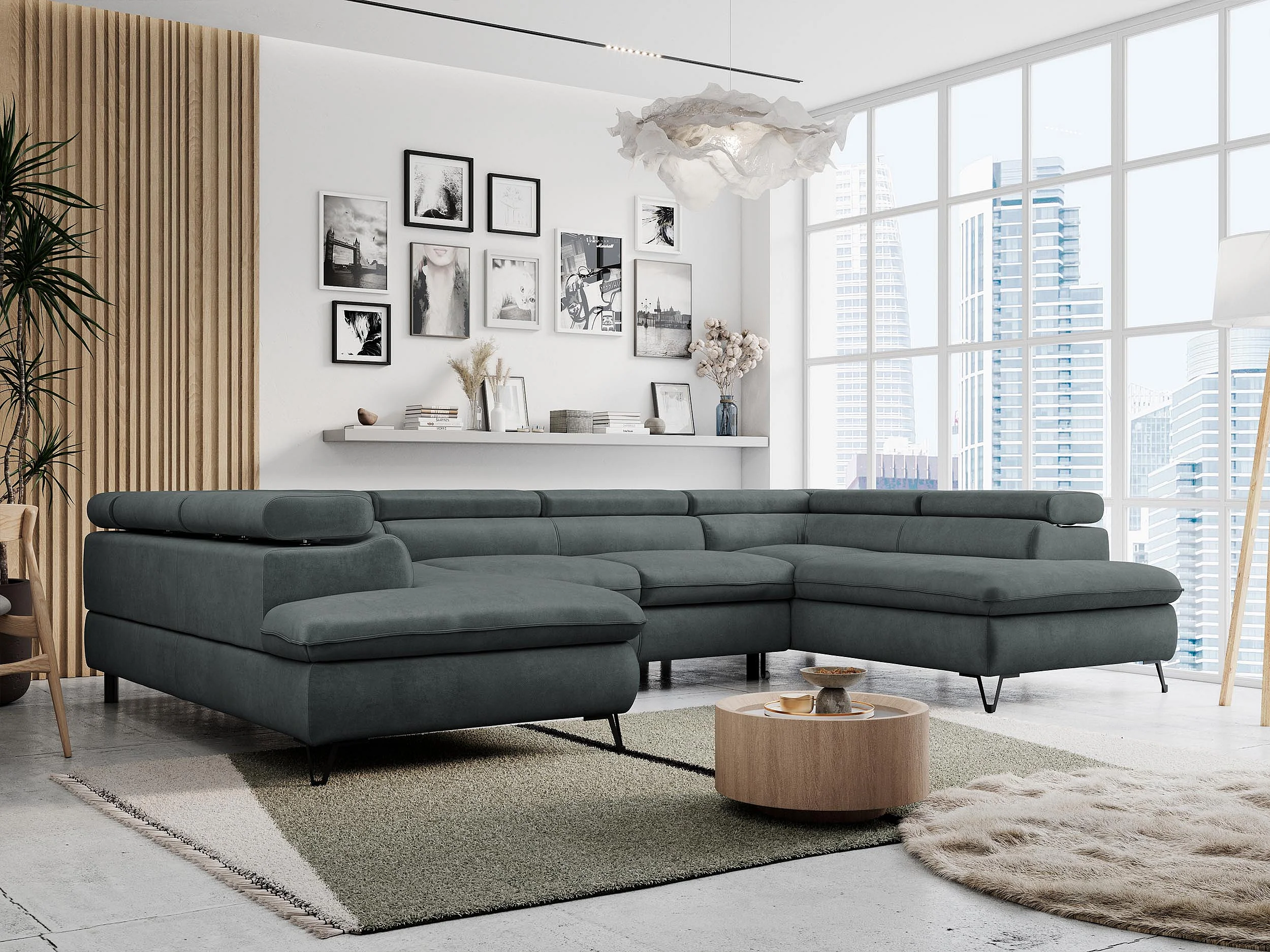 Ecksofa PETER U - schlaffunktion und Bettkästen, verstellbare Kopfstützen - Dunkelgrau Velvet