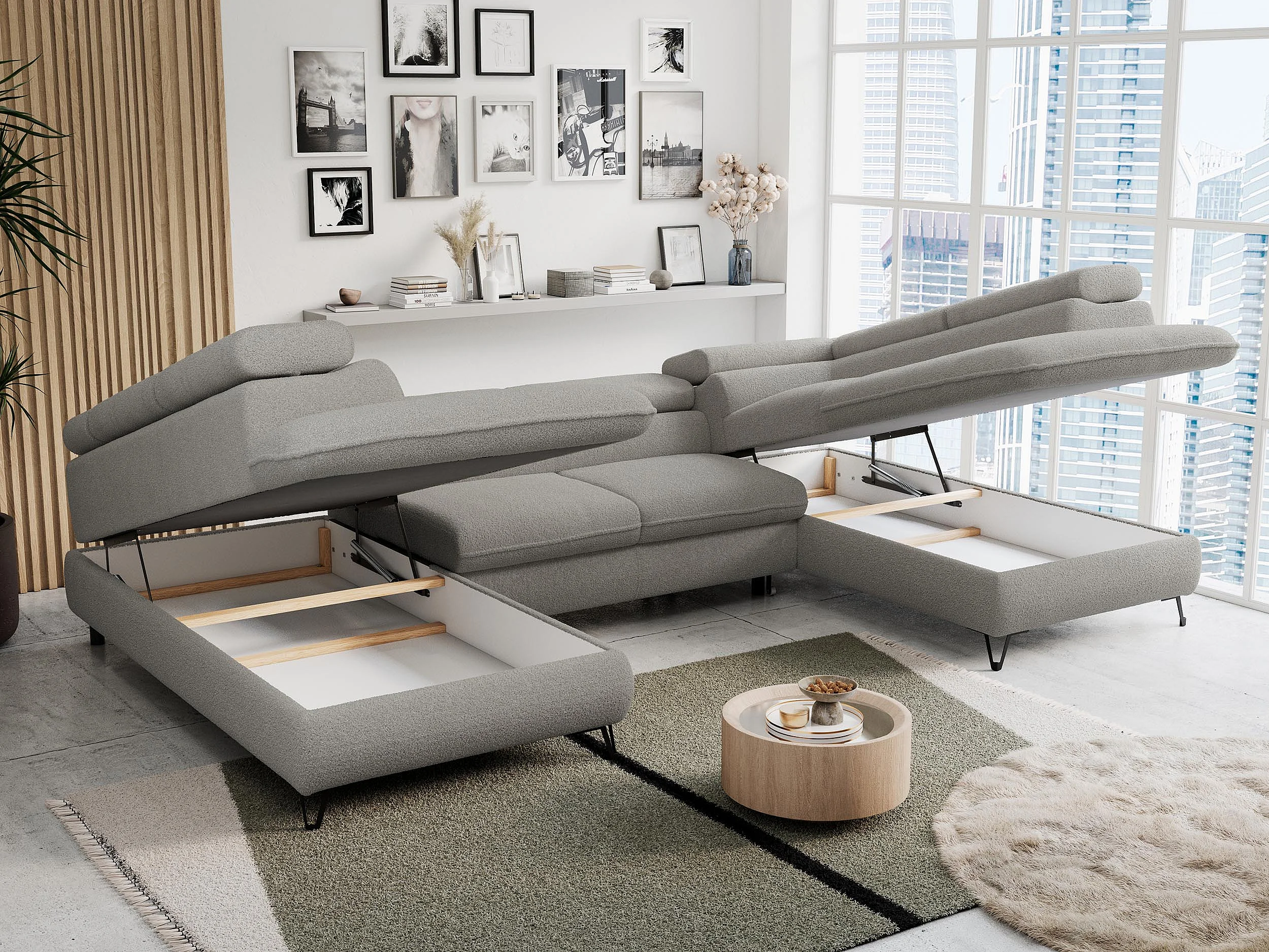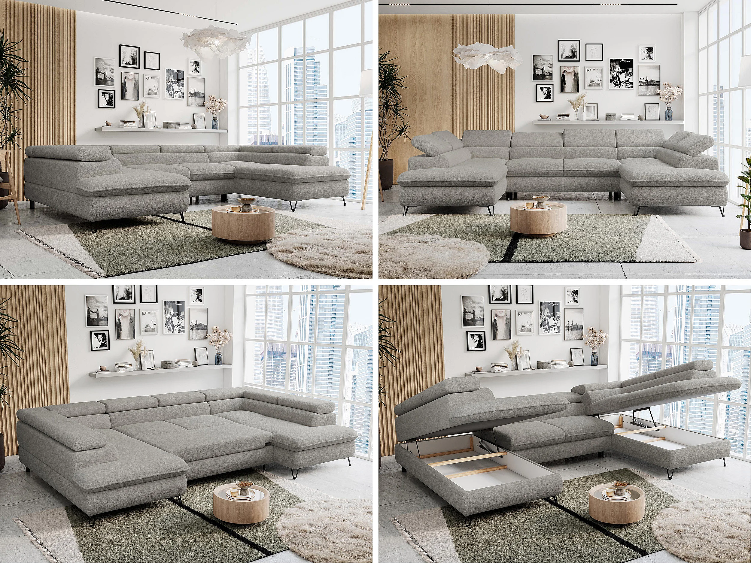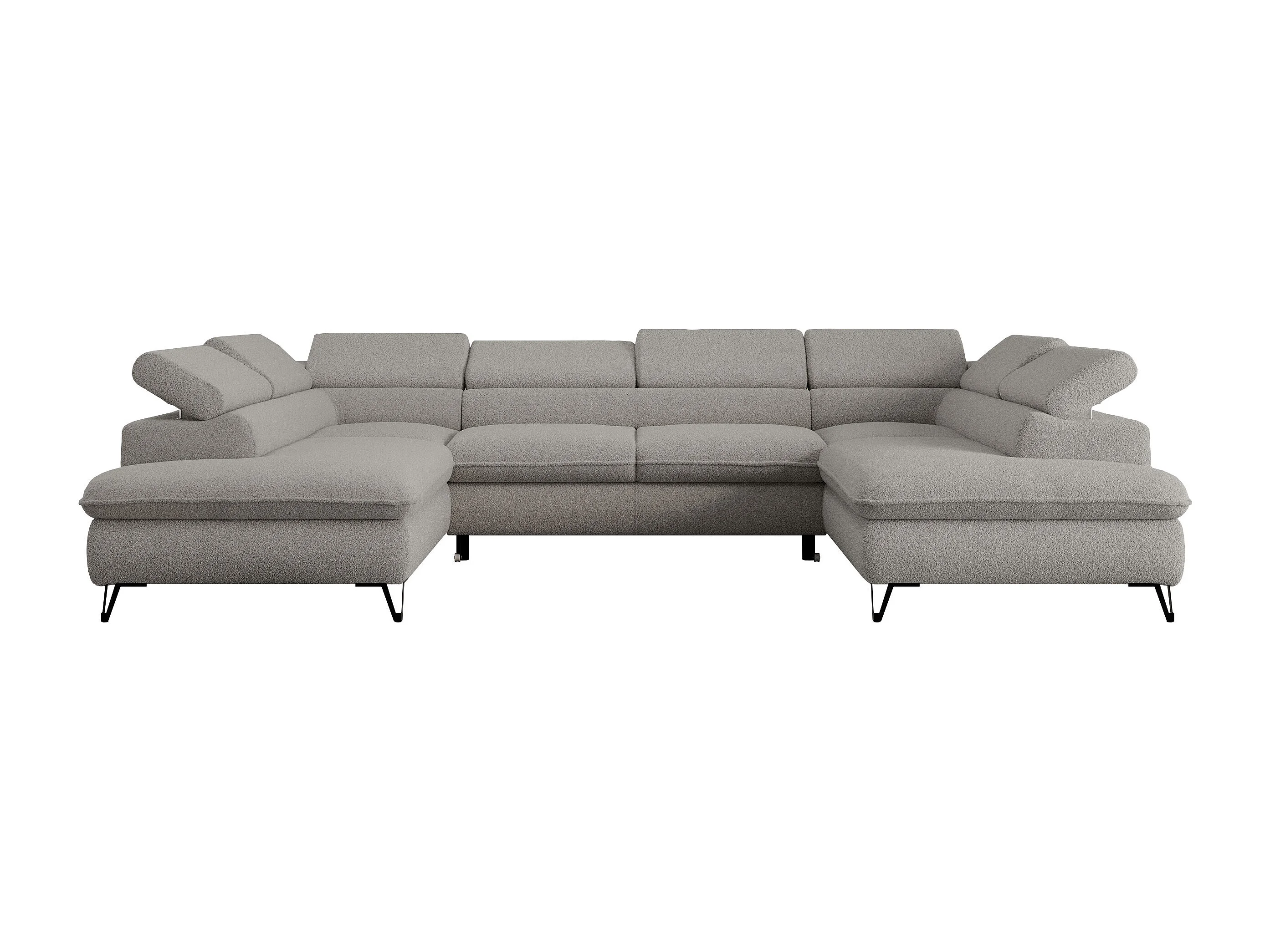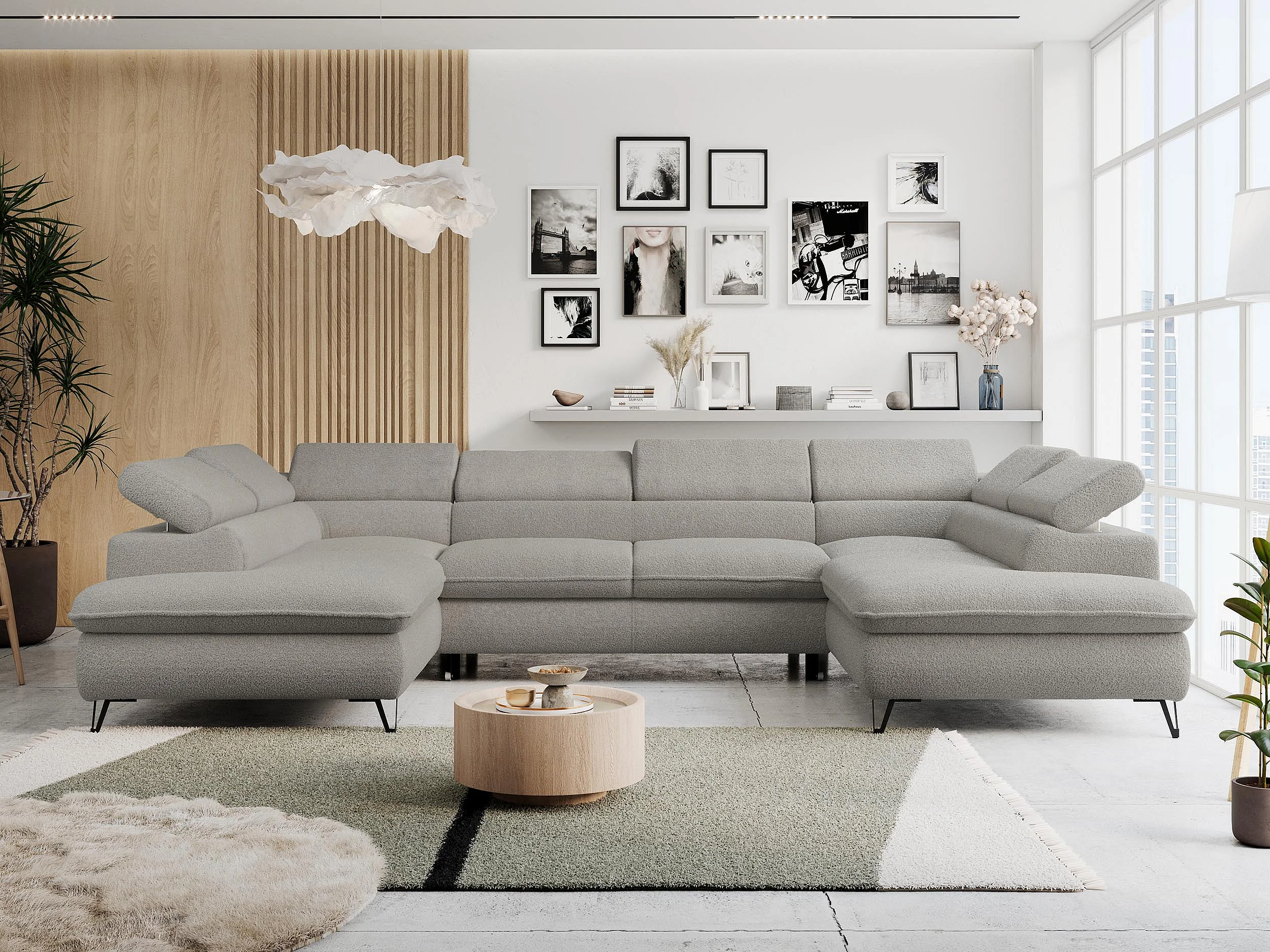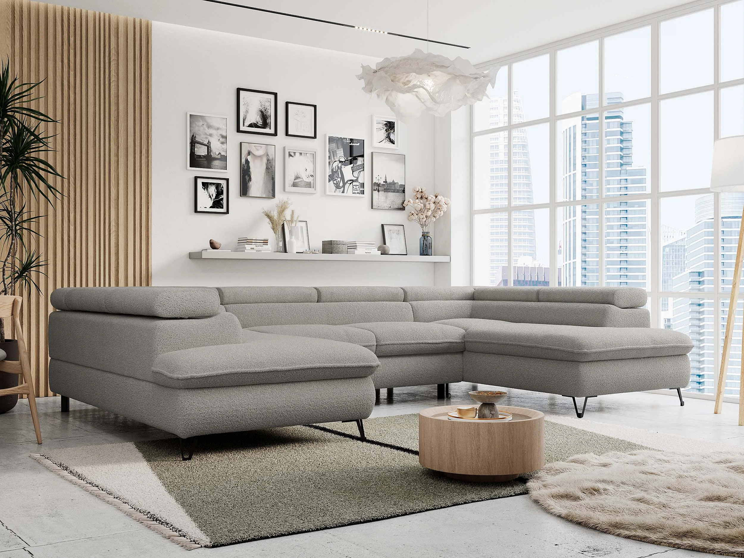 Ecksofa PETER U - schlaffunktion und Bettkästen, verstellbare Kopfstützen - Hellgrau Boucle