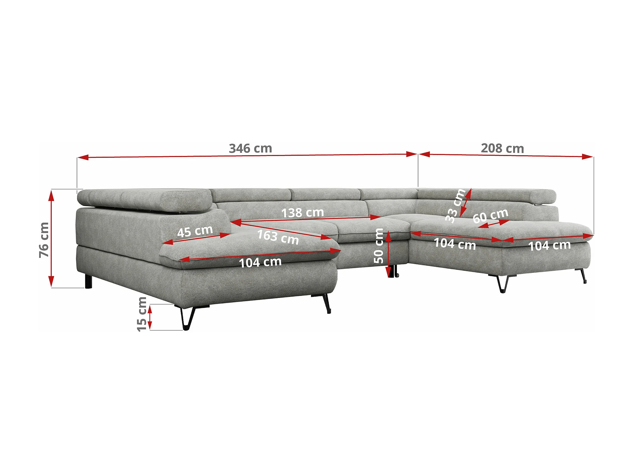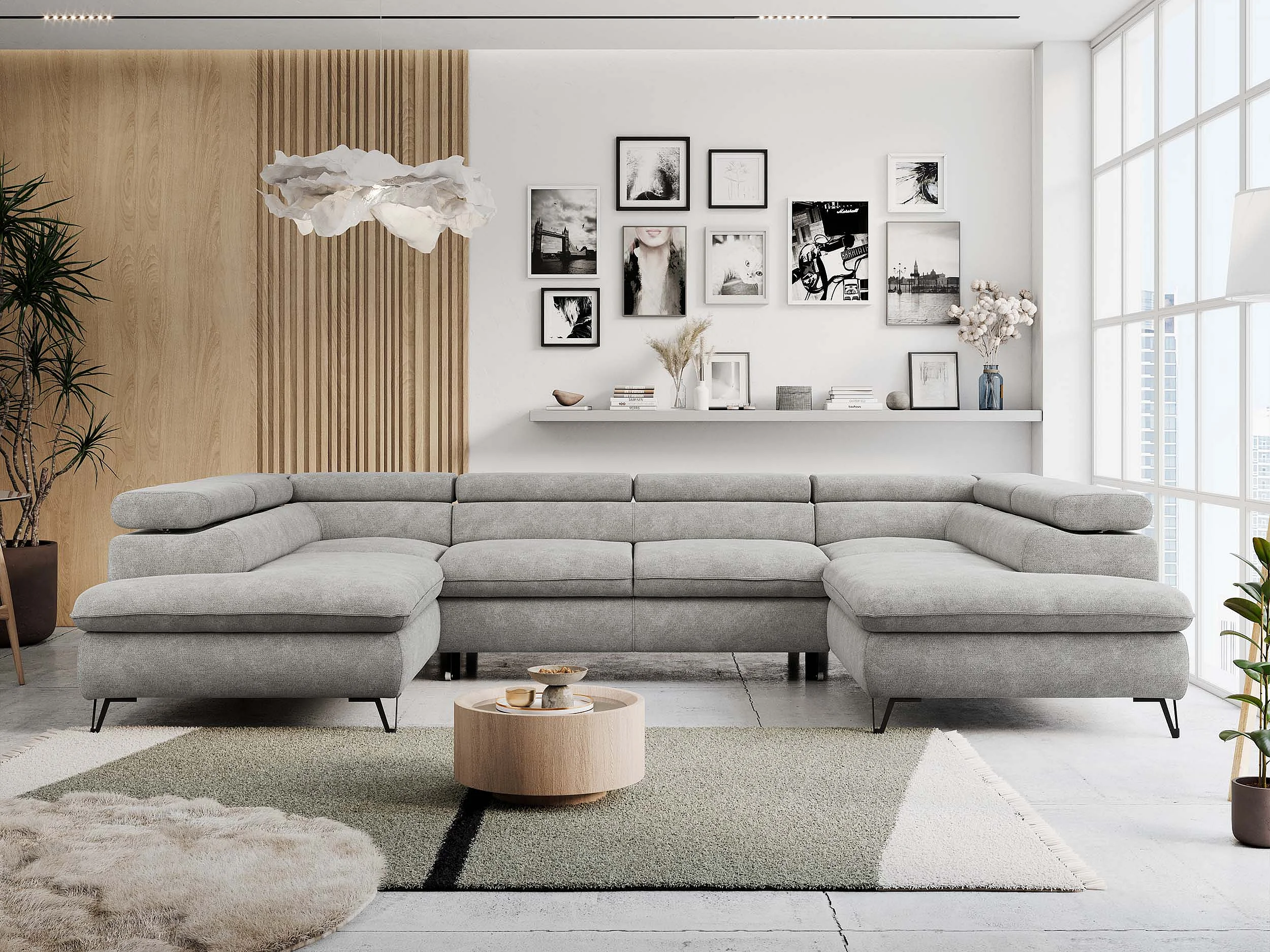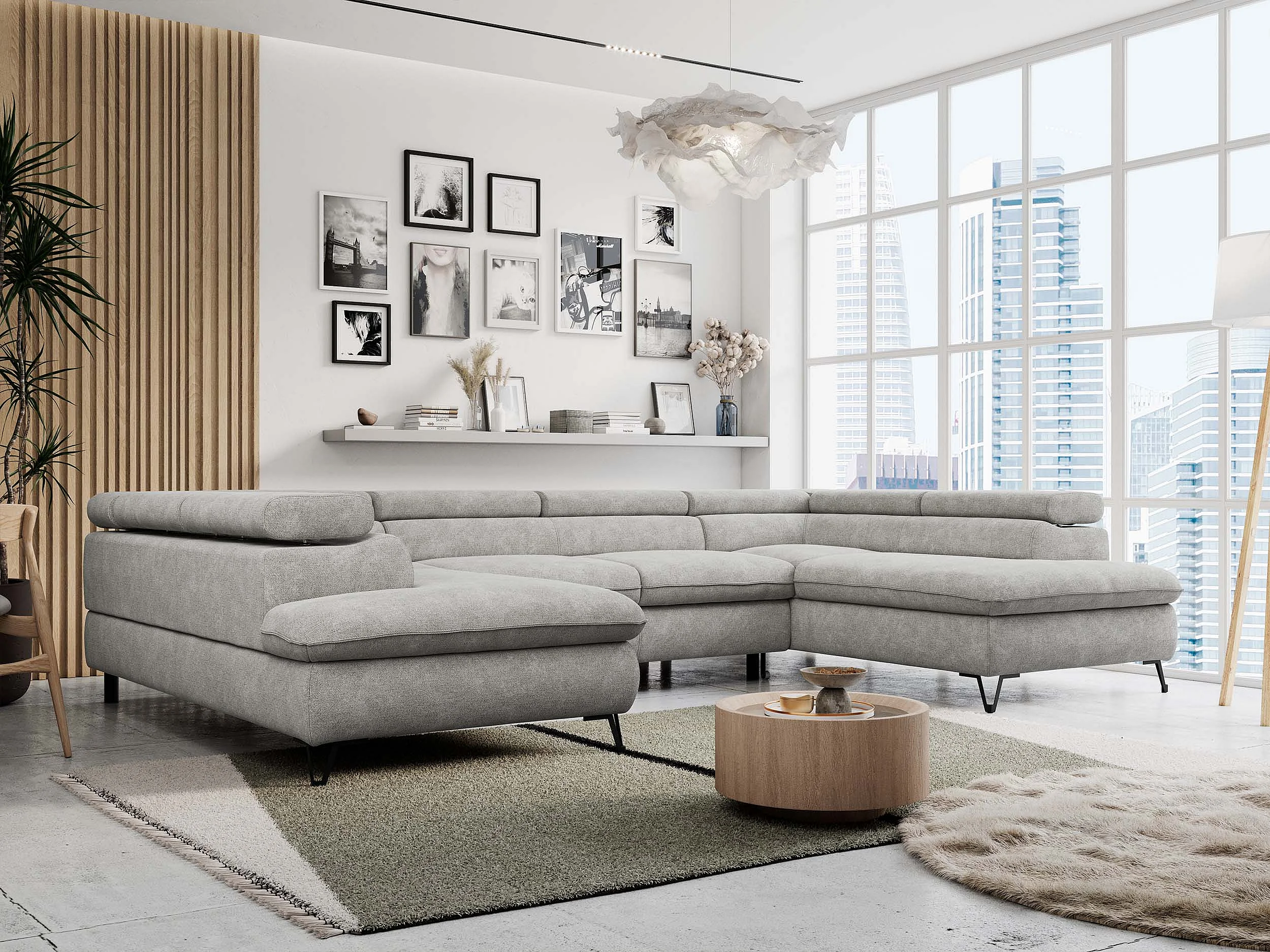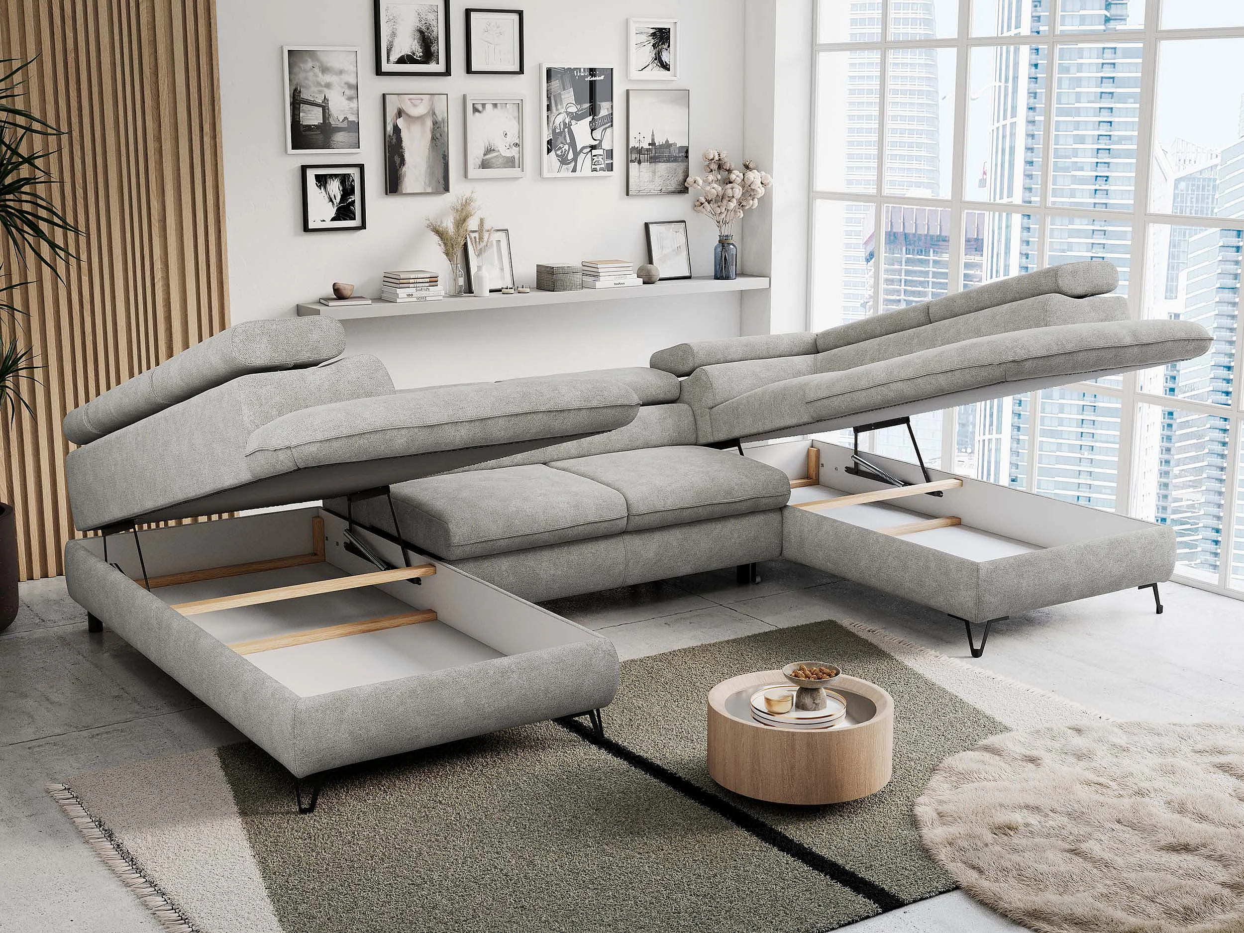 Ecksofa PETER U - schlaffunktion und Bettkästen, verstellbare Kopfstützen - Hellgrau Stukture