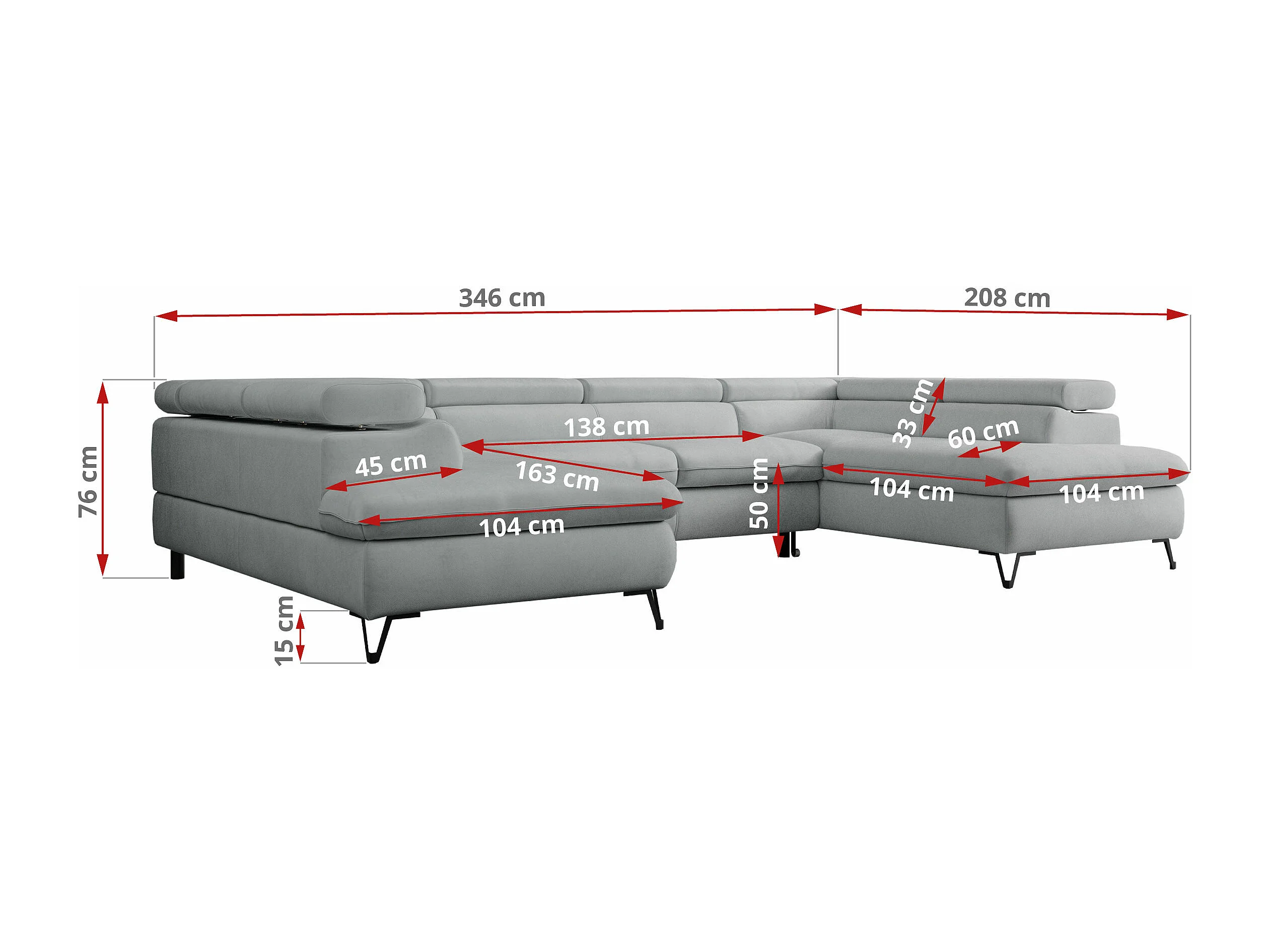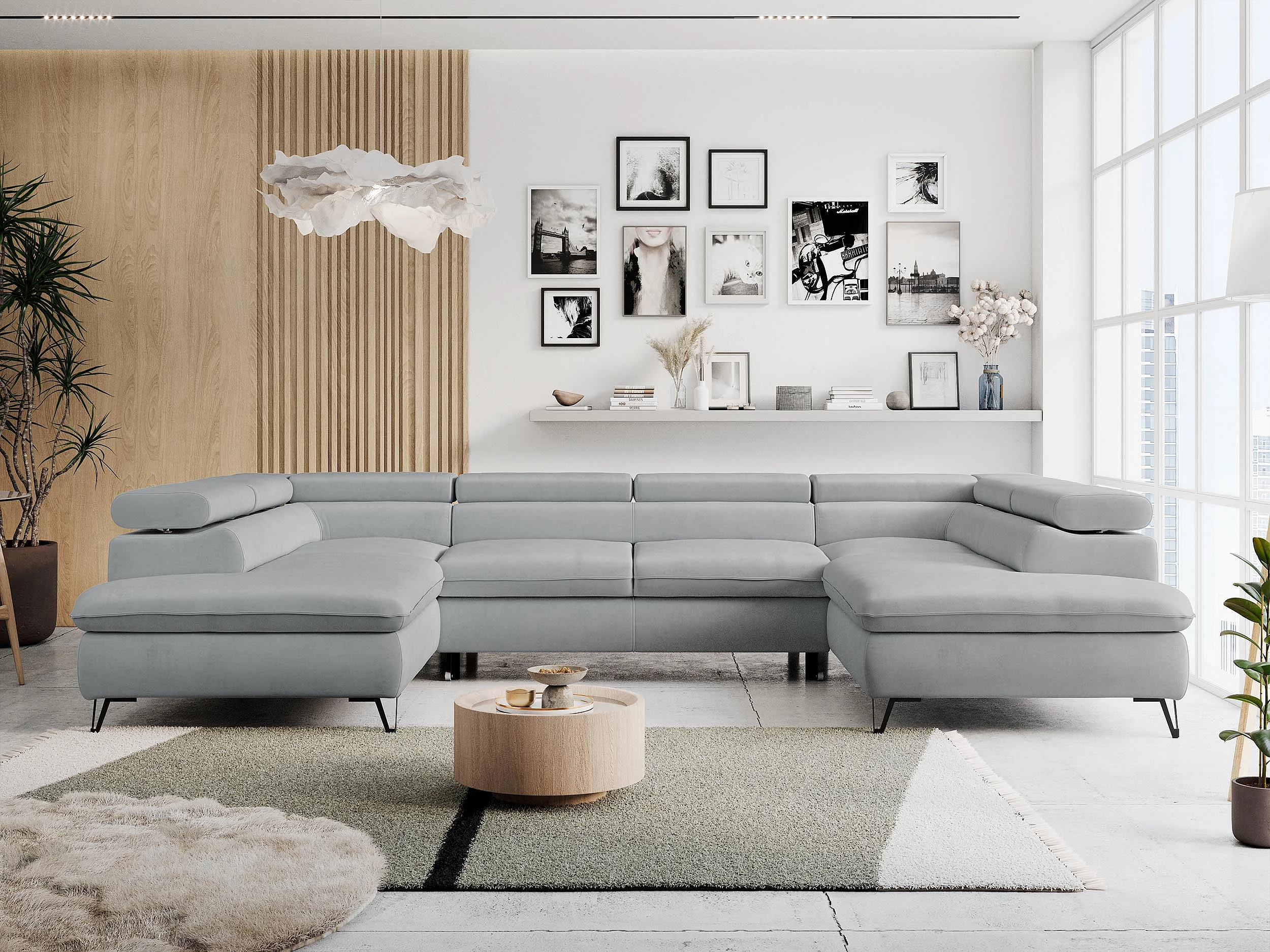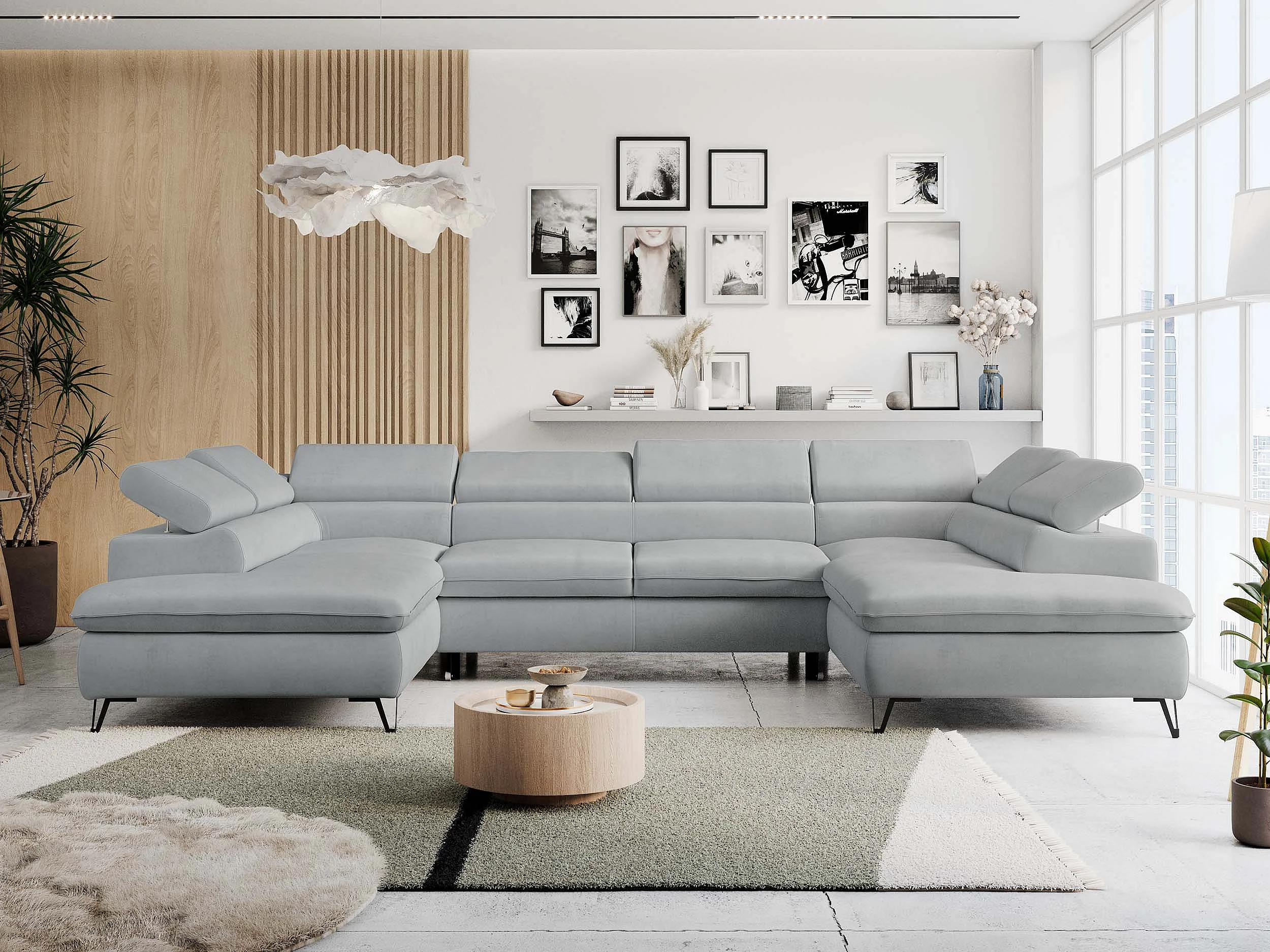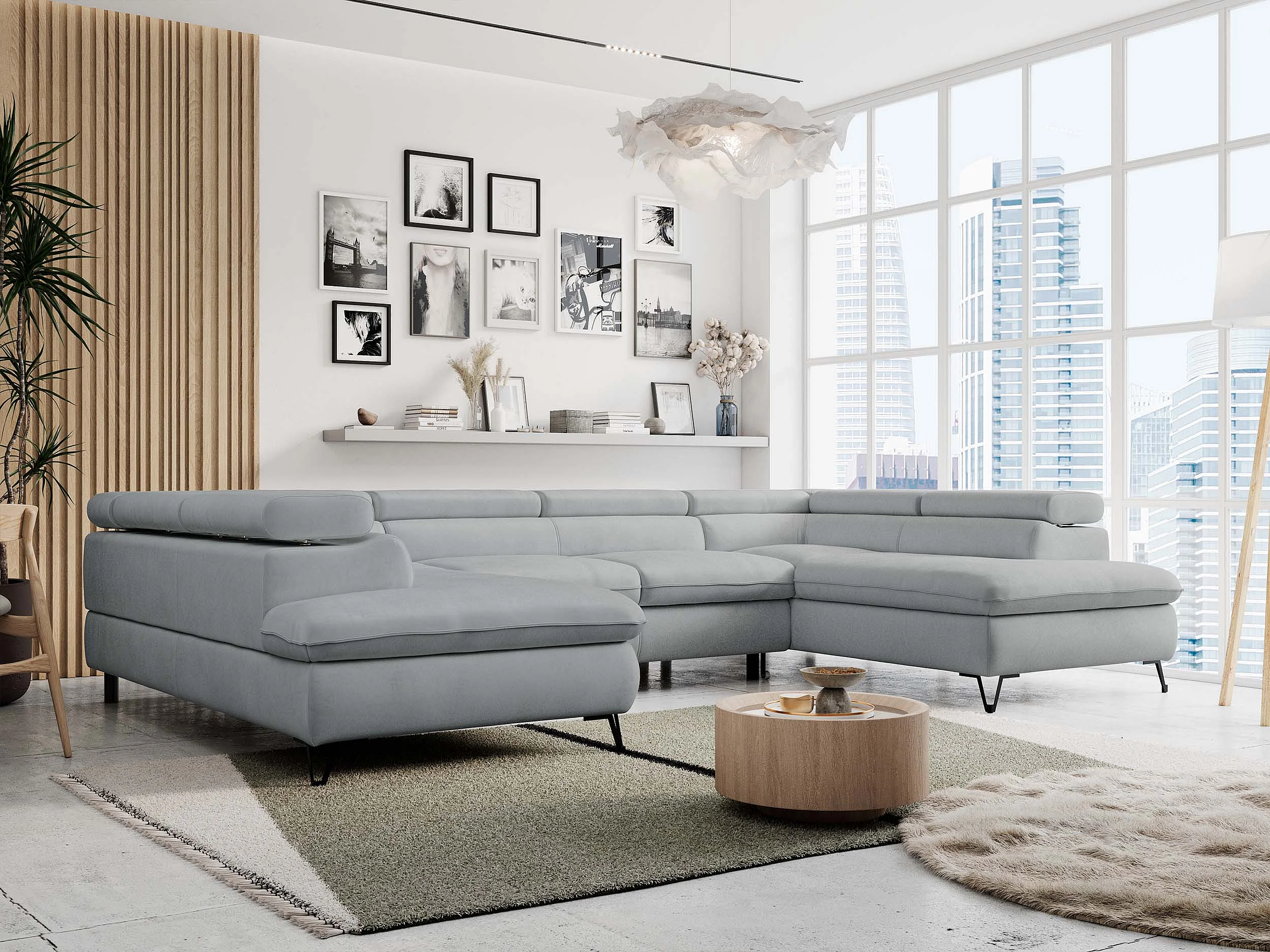 Ecksofa PETER U - schlaffunktion und Bettkästen, verstellbare Kopfstützen - Hellgrau Velvet