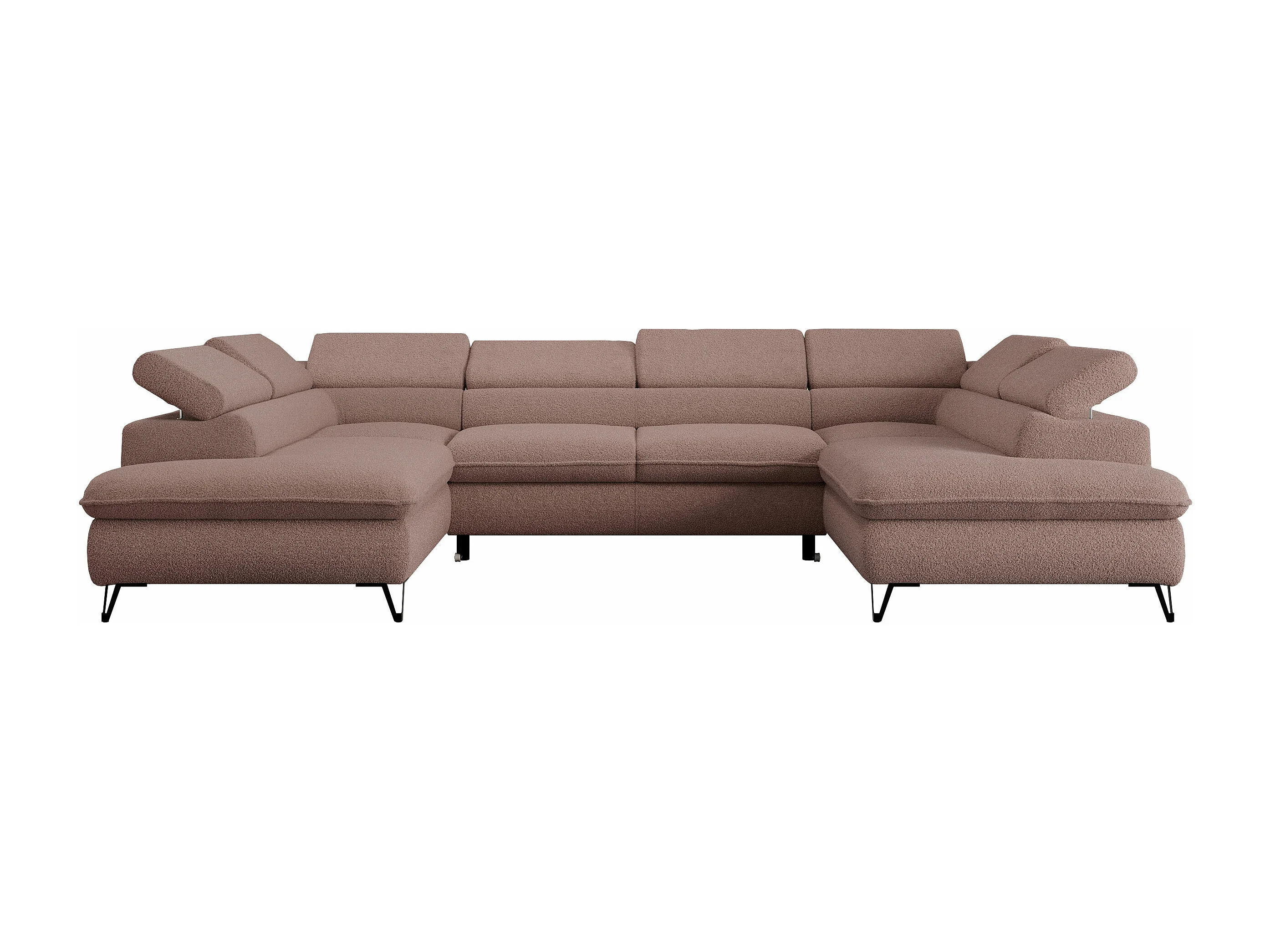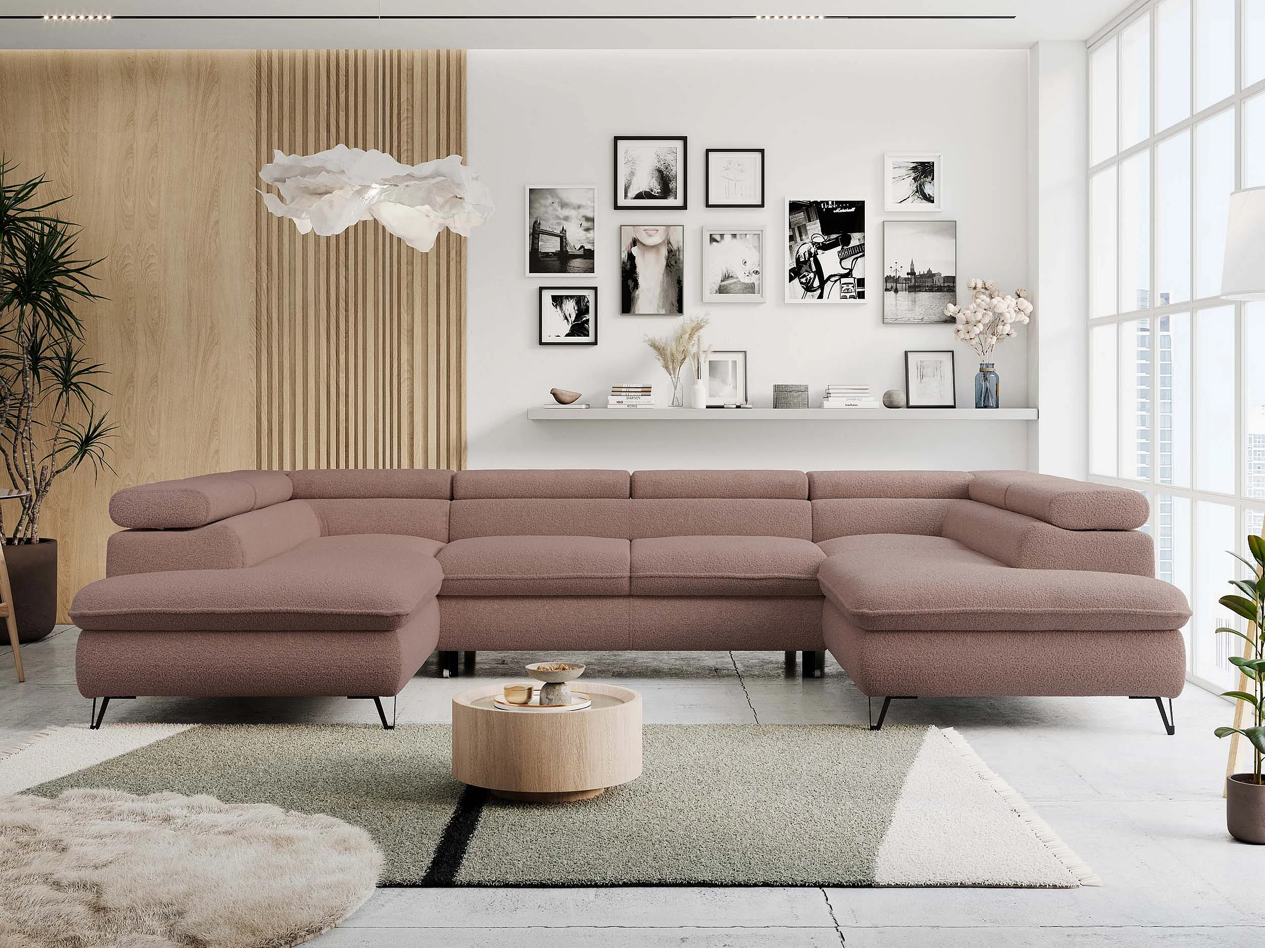 Ecksofa PETER U - schlaffunktion und Bettkästen, verstellbare Kopfstützen - Rosa Boucle