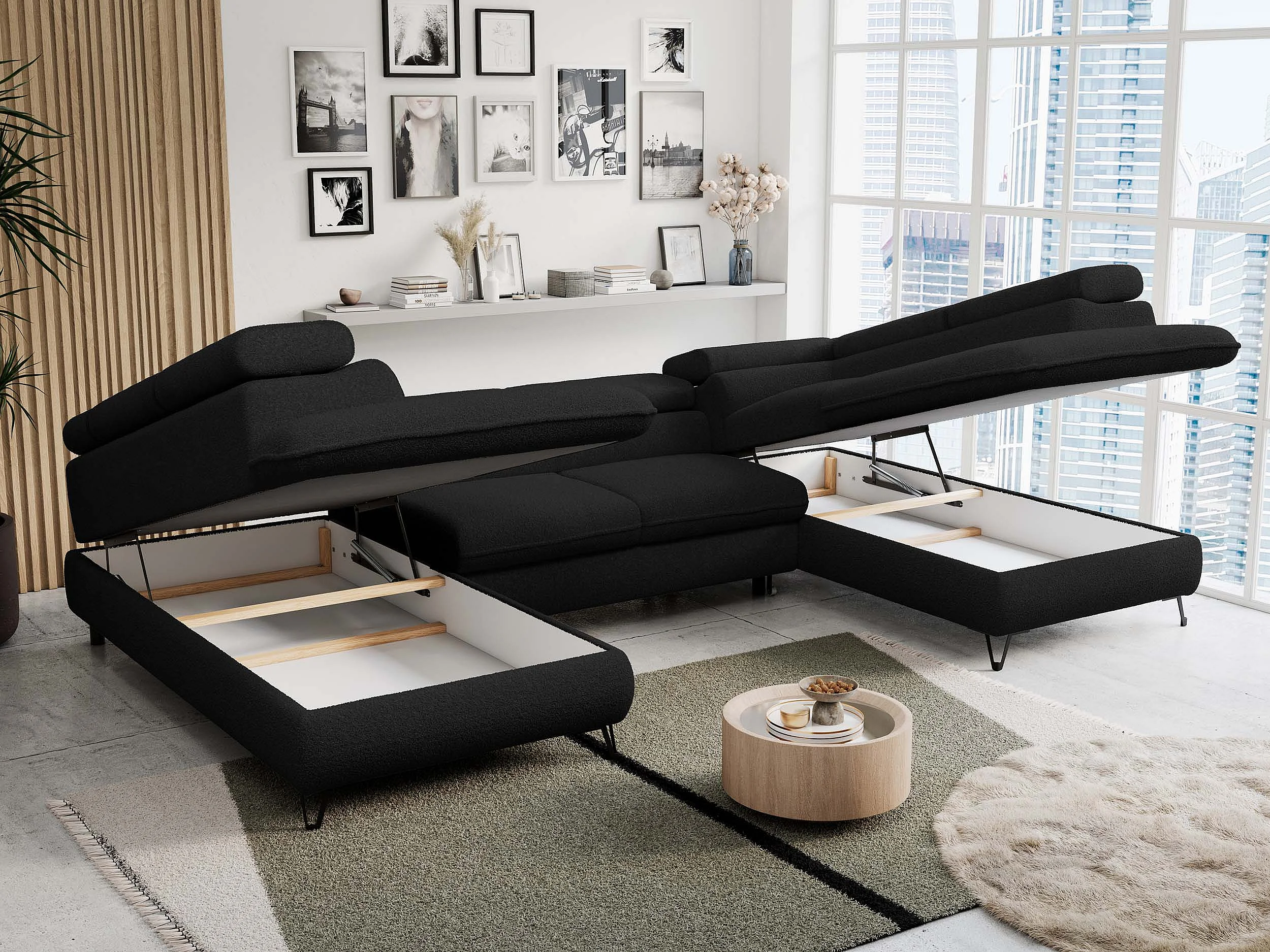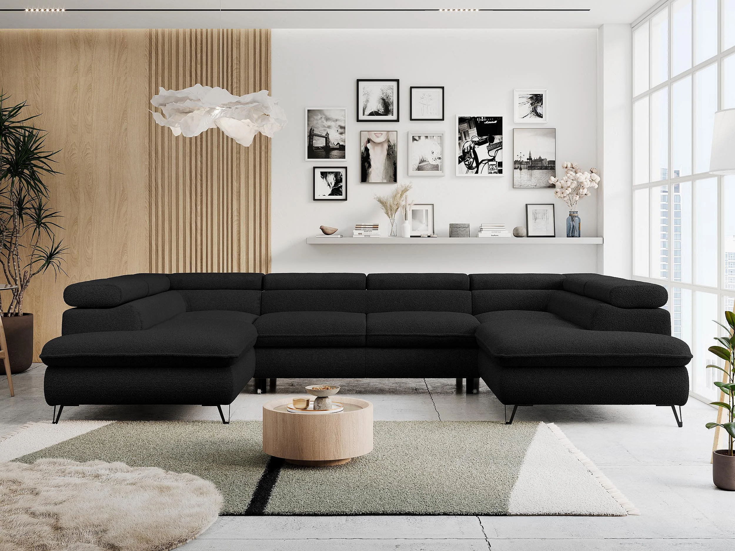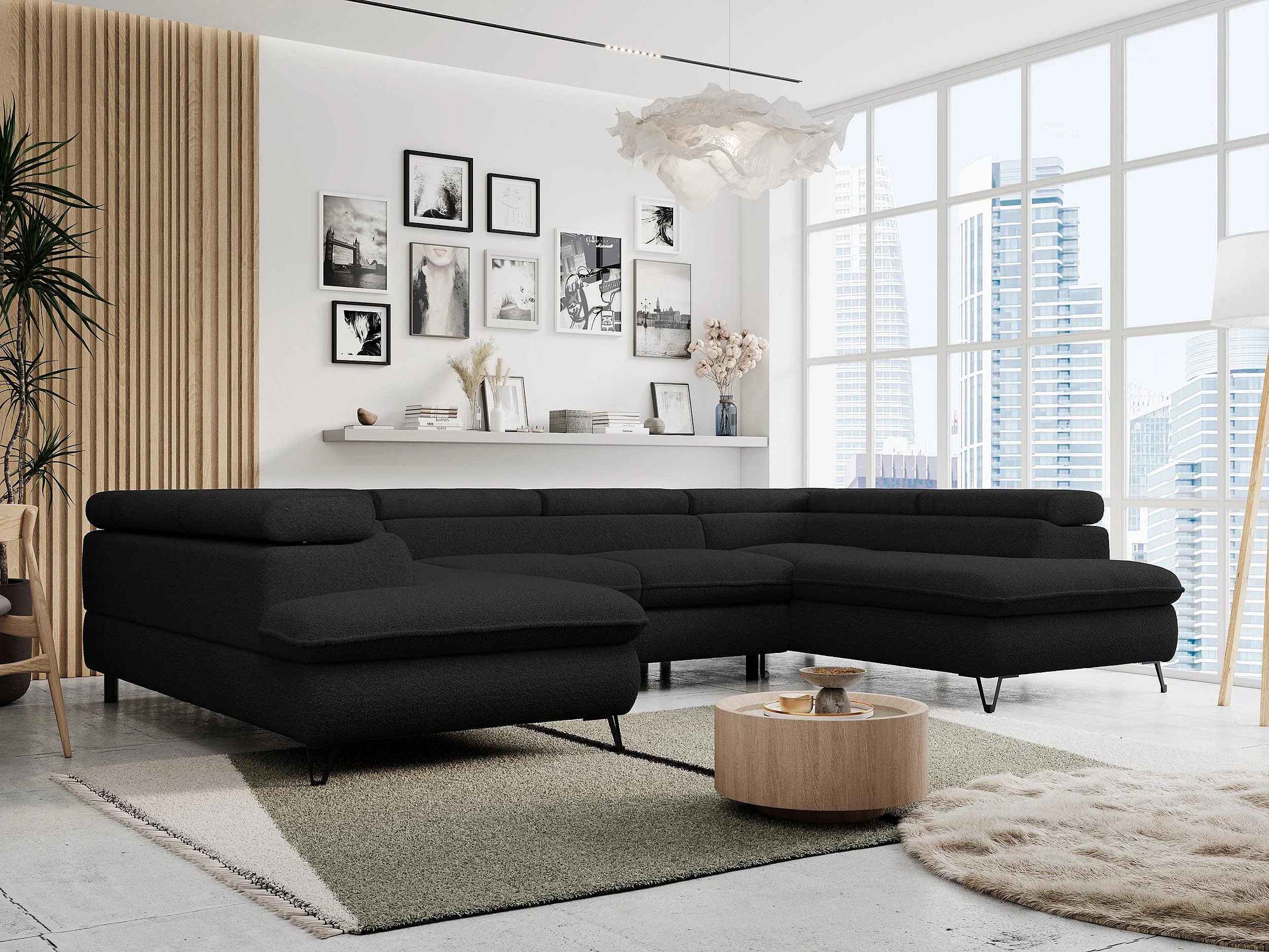 Ecksofa PETER U - schlaffunktion und Bettkästen, verstellbare Kopfstützen - Schwarz Boucle