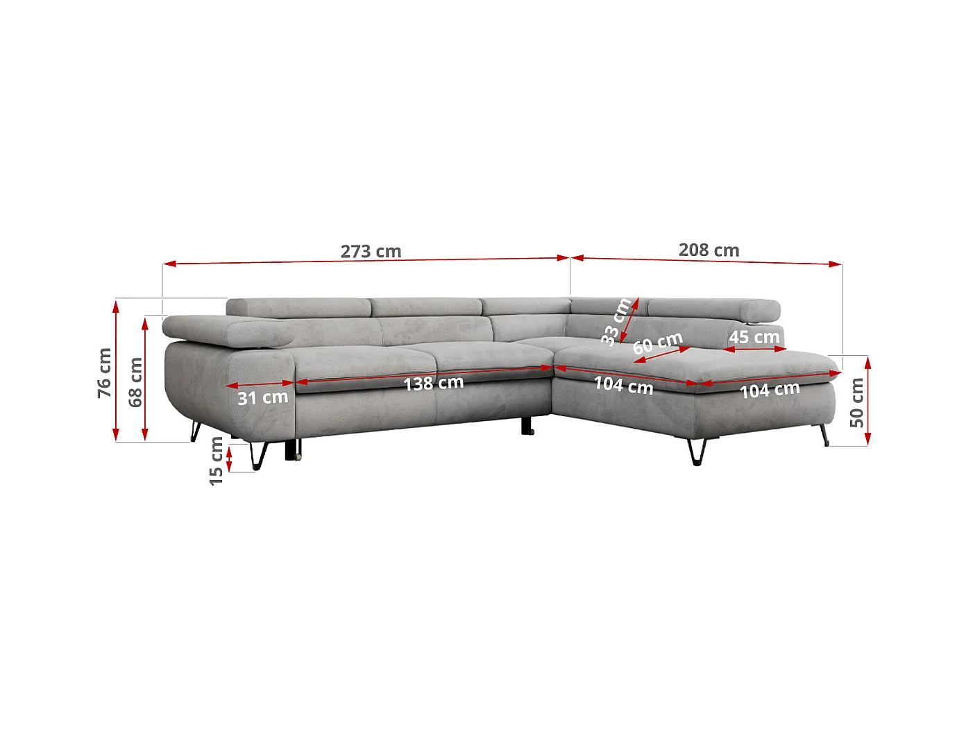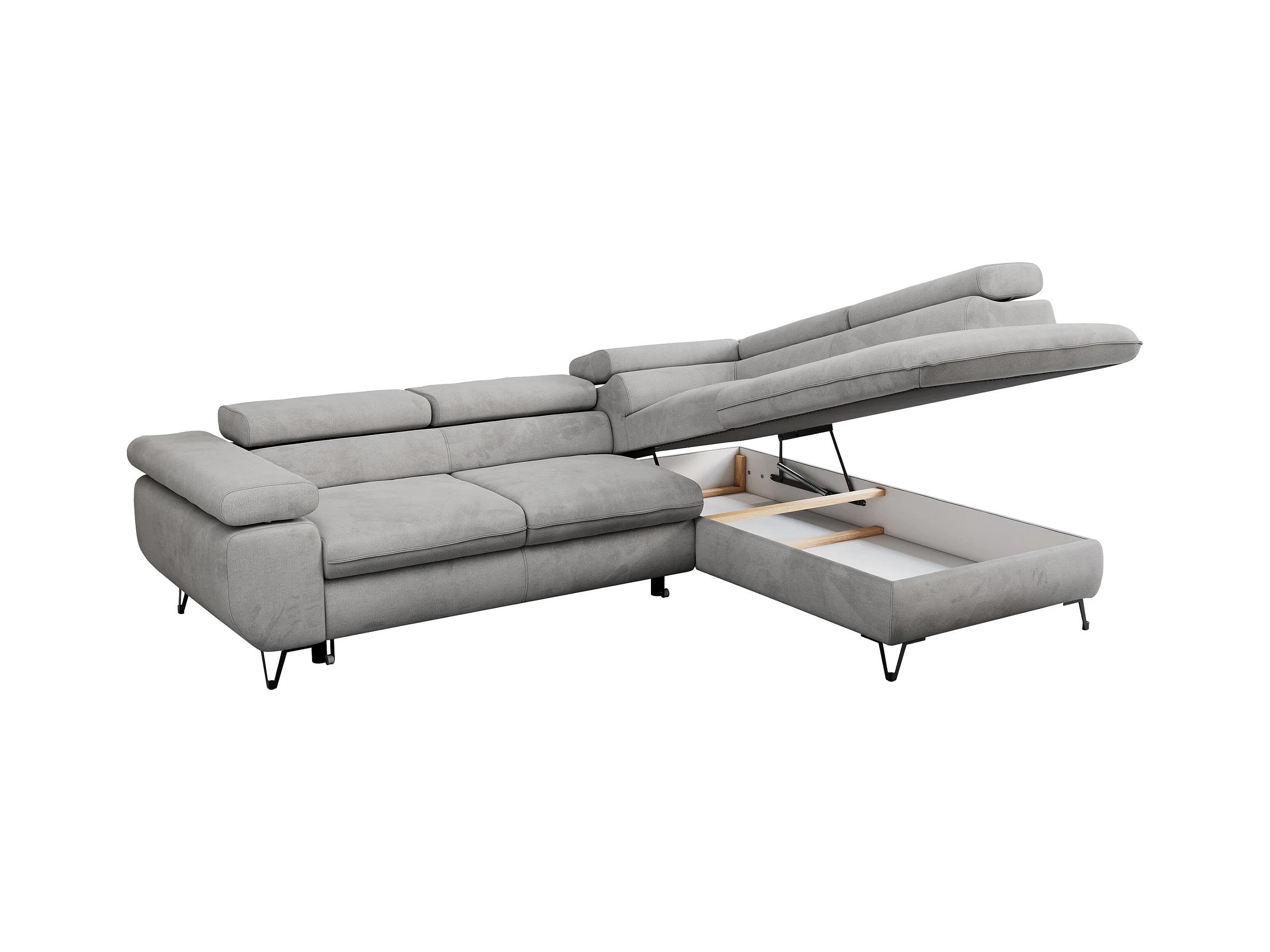 Ecksofa PETER verstellbare Kopfstütze, schlaffunktion - Hellgrau Velvet - Ecke Rechts