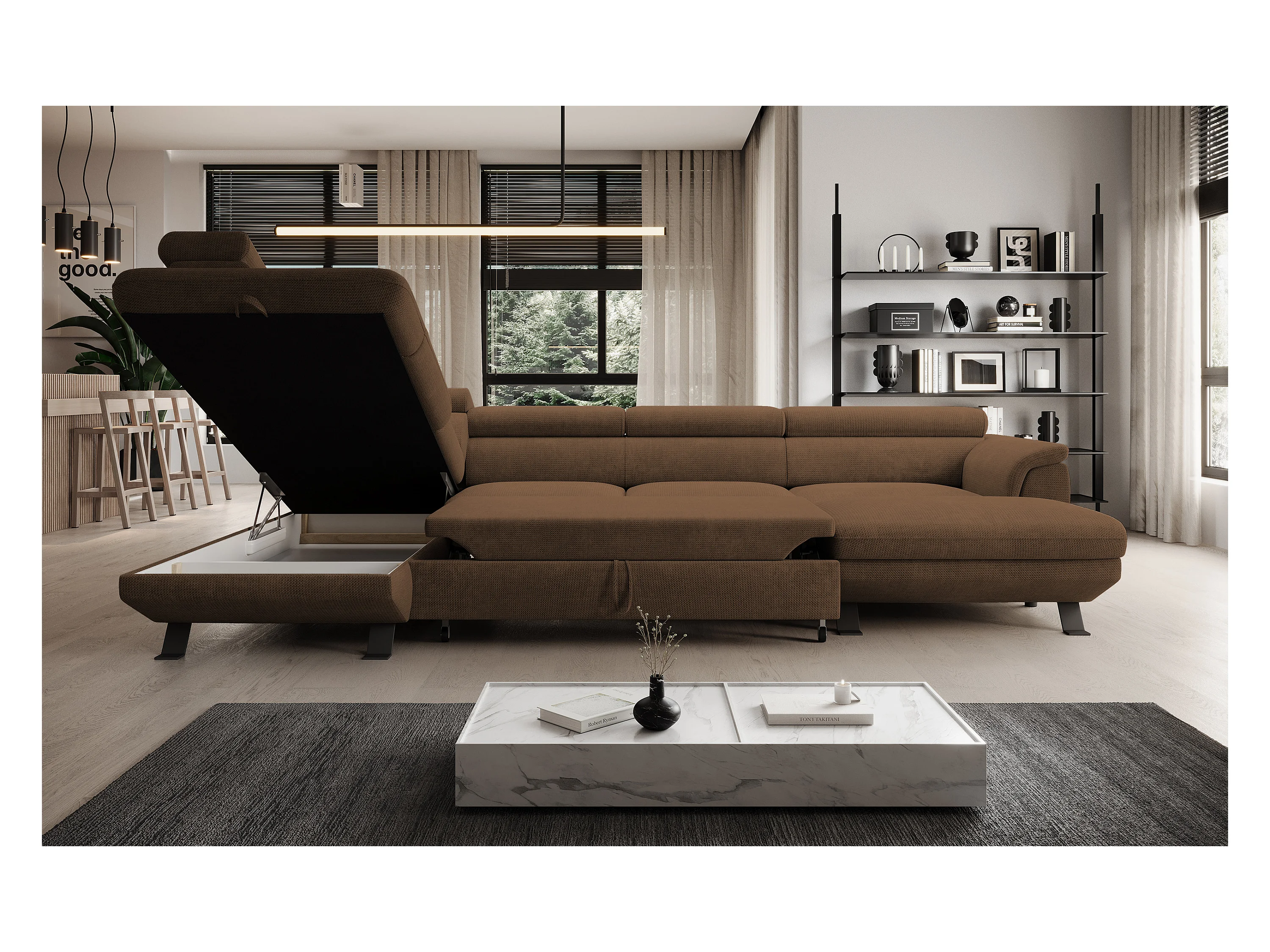 ECKSOFA RAVEN XL Eckcouch mit Schlaffunktion mit Ausziehbett, Verstellbaren Kopfstützen, Bettkasten, Großes Sofa 334x198x162cm Linke Seite Rost
