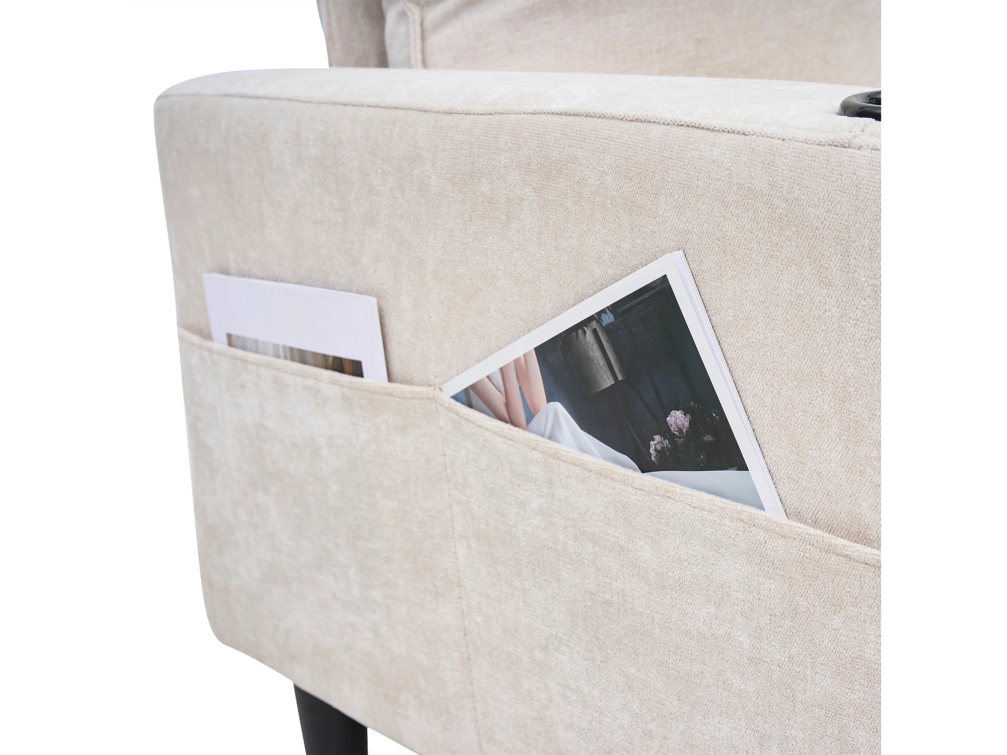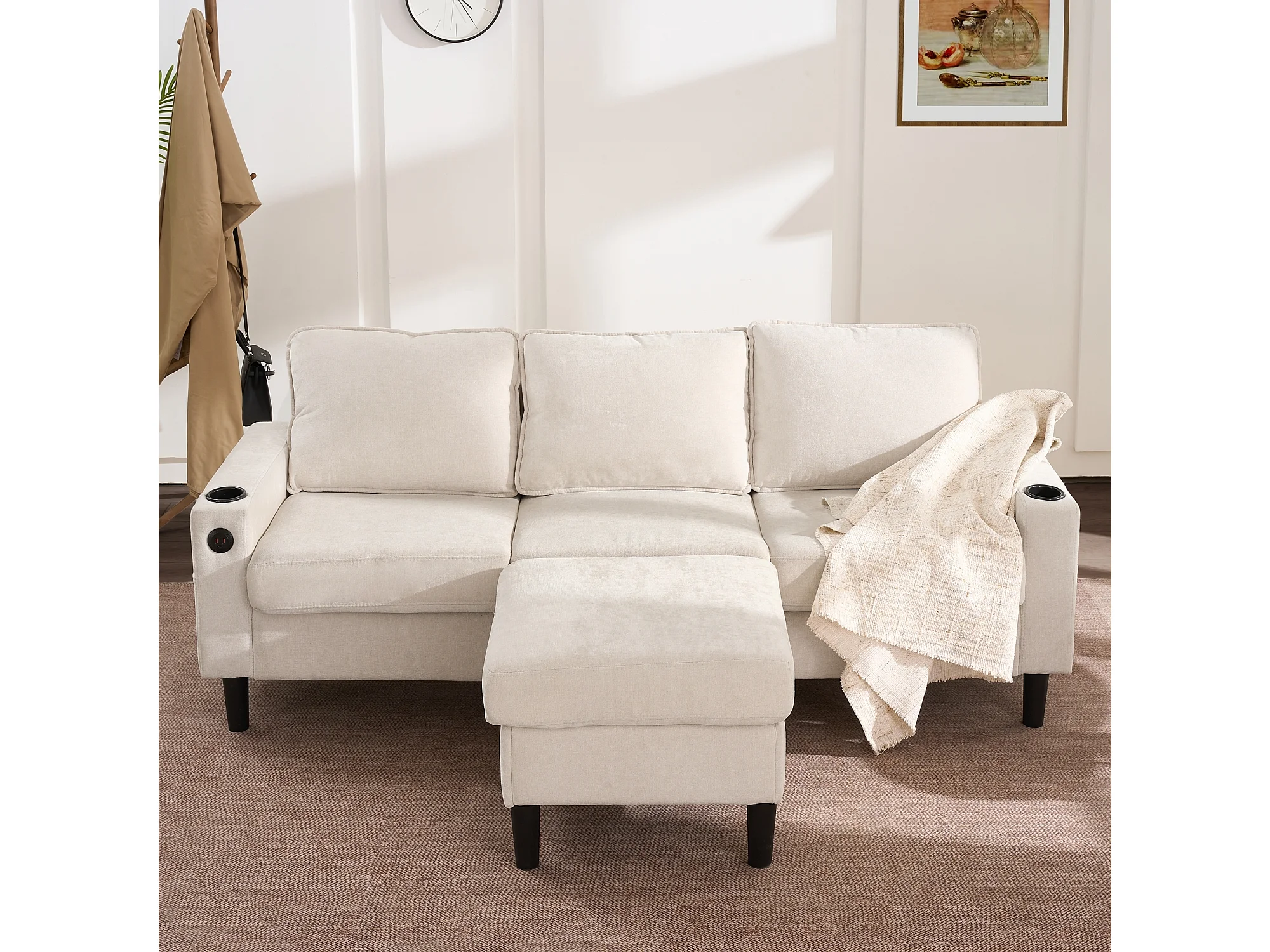 Ecksofa rechts - Sofa mit 2 Getränkehaltern und USB-Ladegerät - beiges leinen
