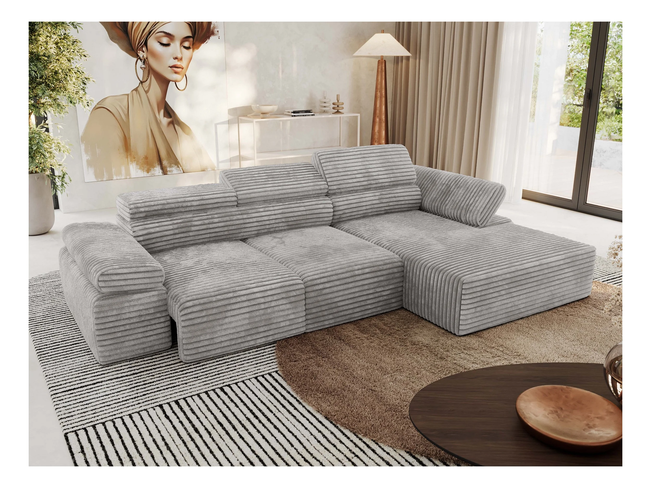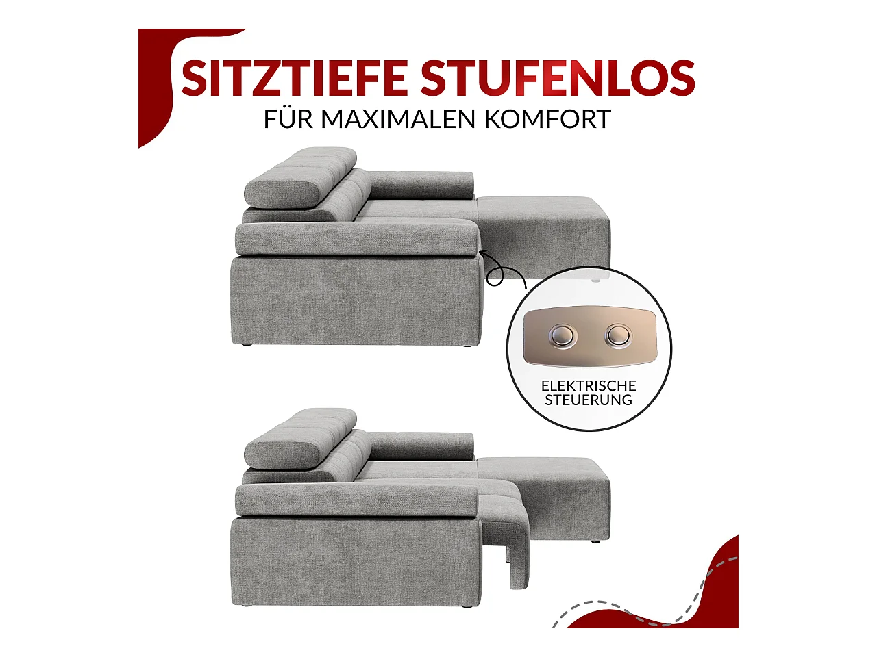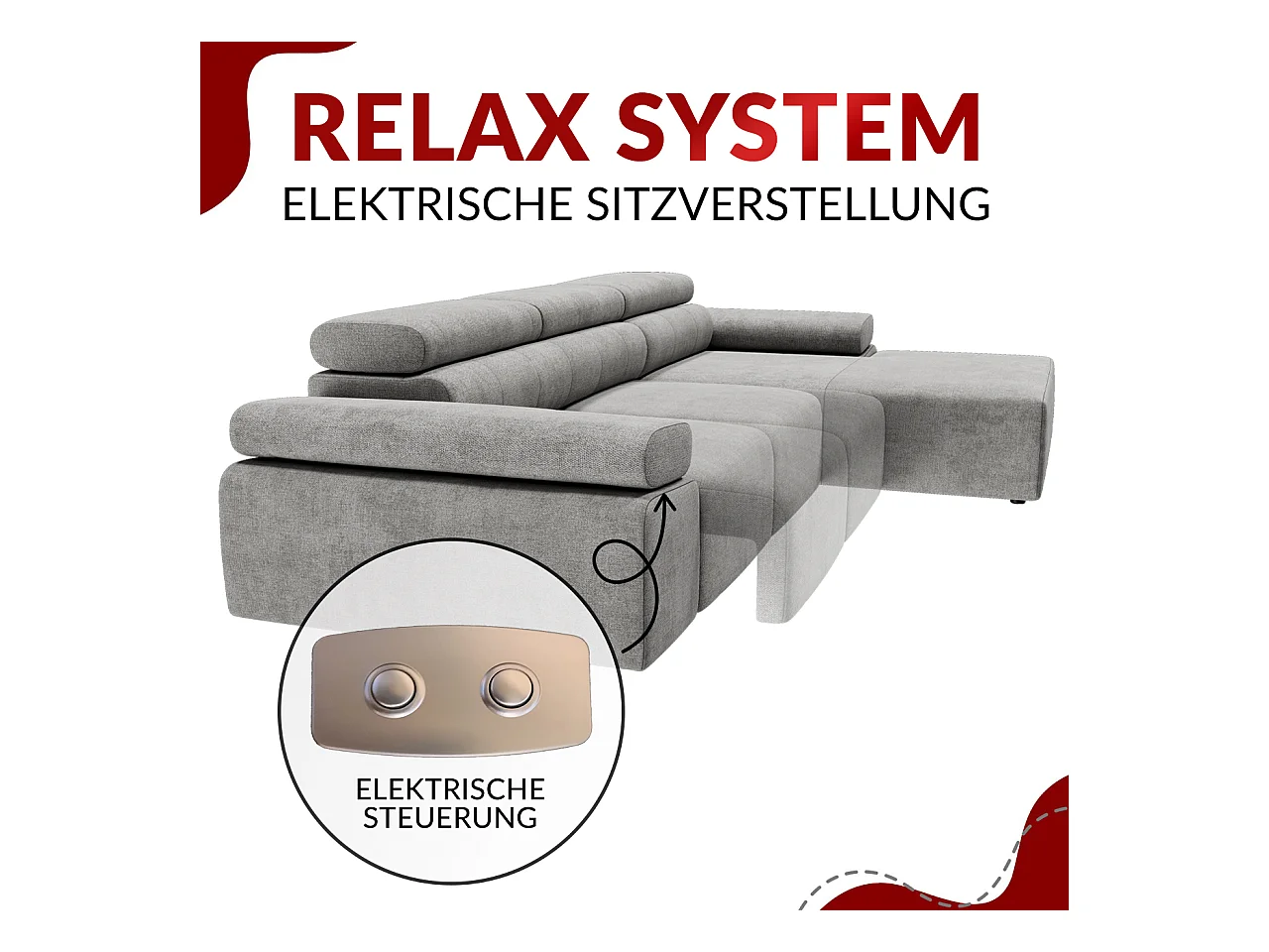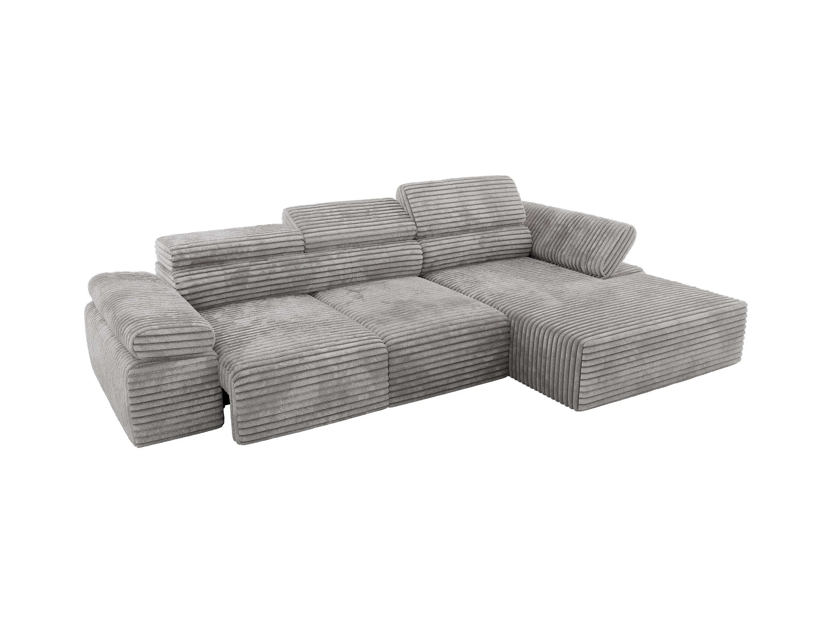 Ecksofa RILASSO - L-förmige Ecke mit Relax-funktion, elektrisch verstellbarer Sitz, Armlehnen - Hellgrau Cord - Ecke Rechts