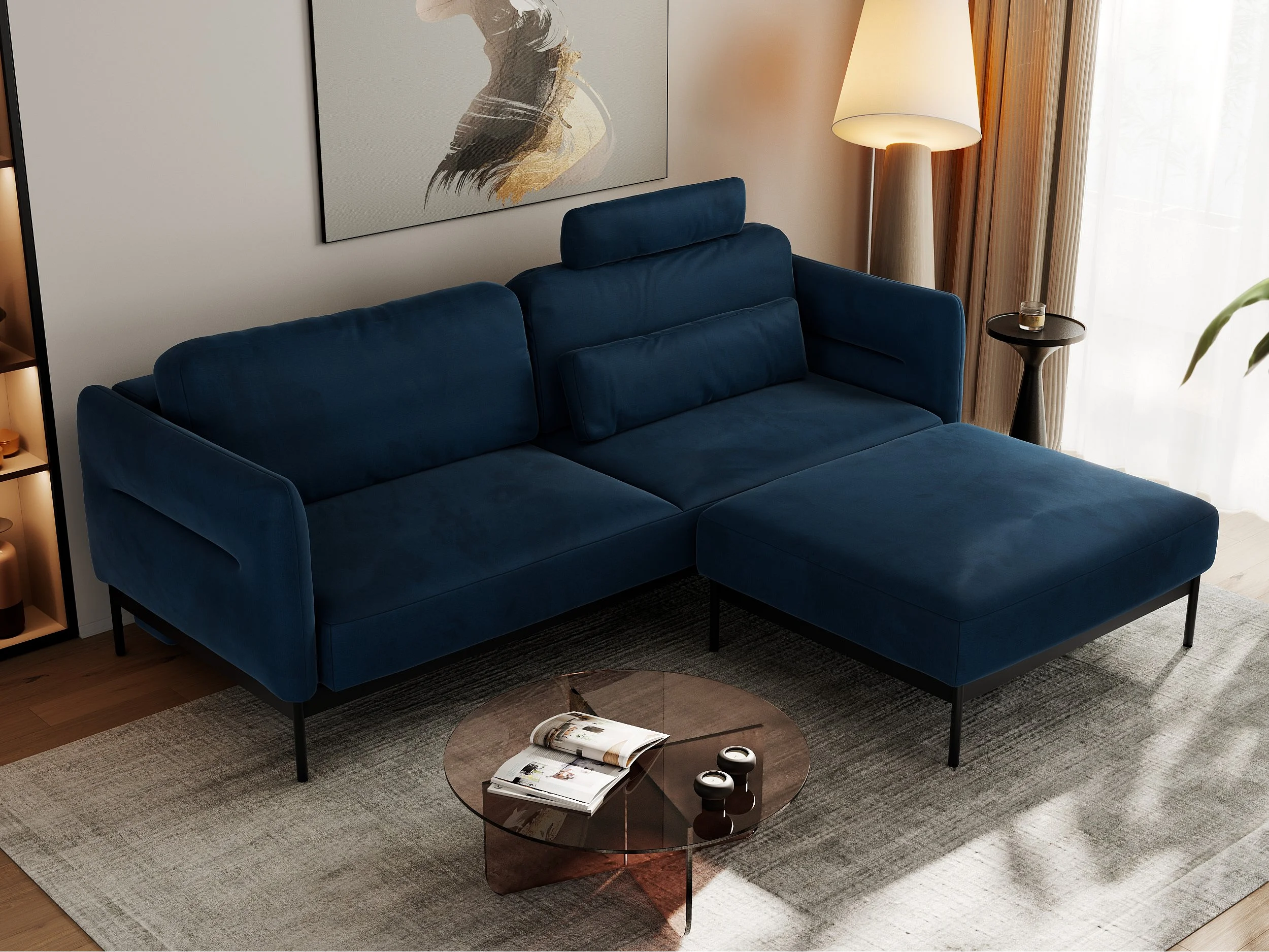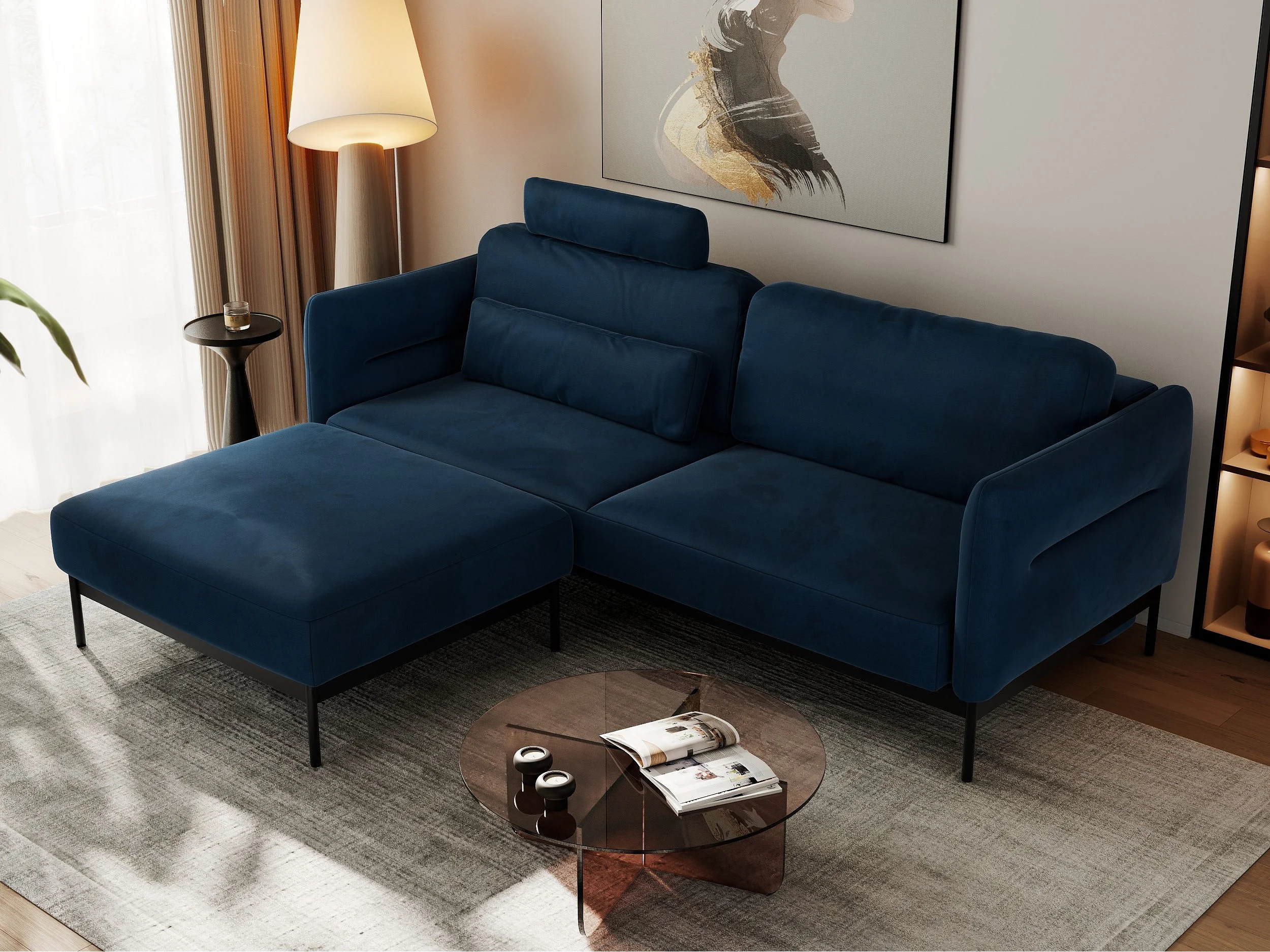 Ecksofa SALENTO - mit Metallbeine, Schlafsofa, mobilen Fußhocker, lose Kissen - Dunkelblau Velvet
