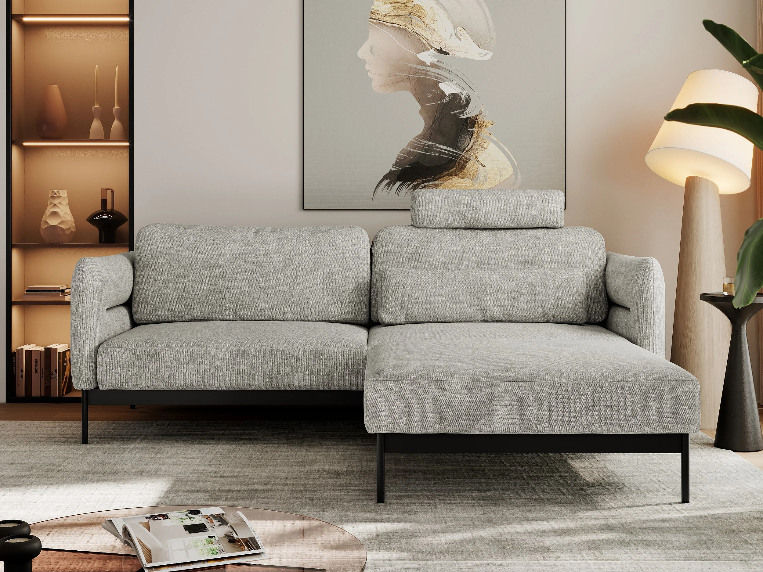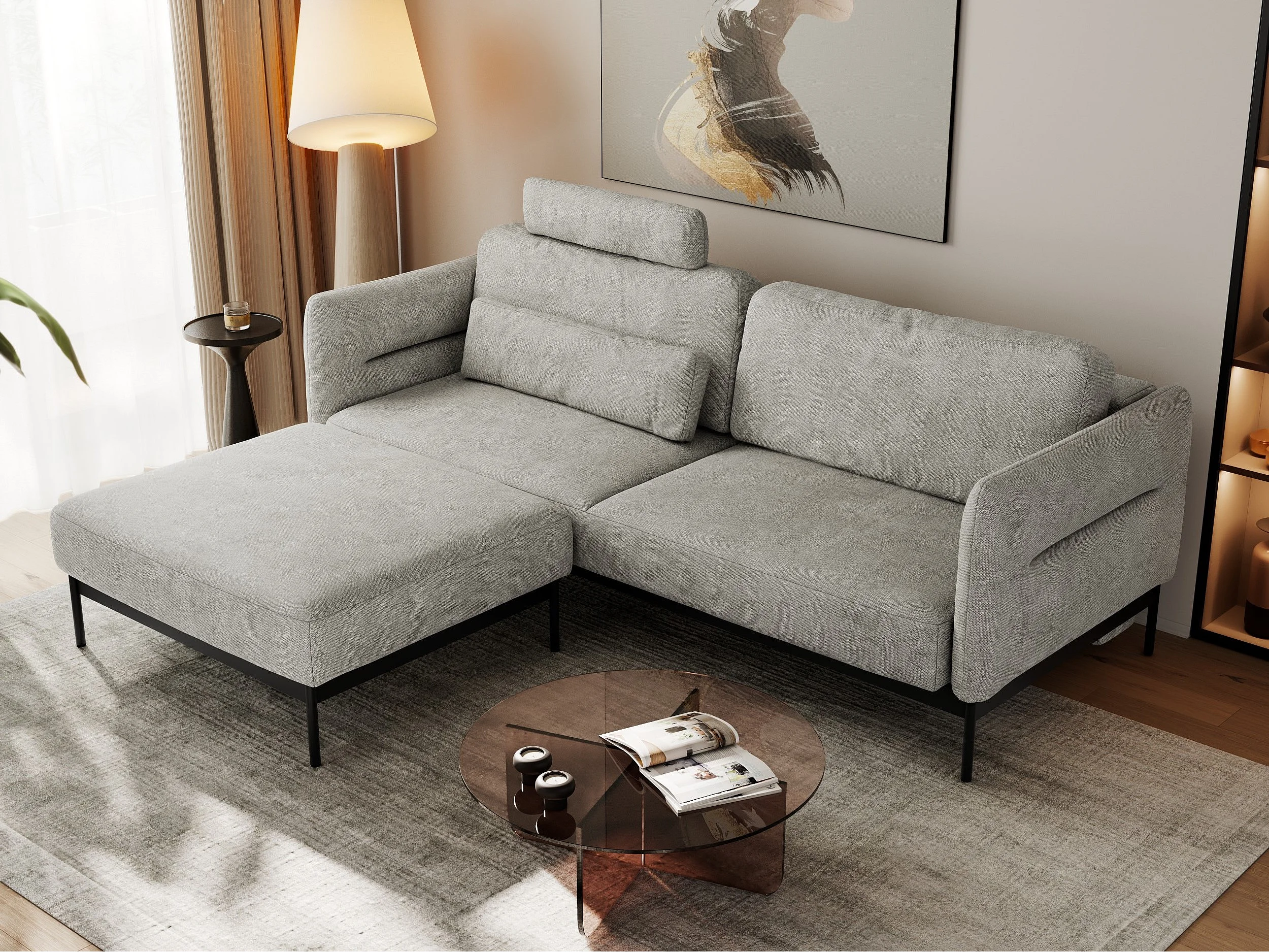 Ecksofa SALENTO - mit Metallbeine, Schlafsofa, mobilen Fußhocker, lose Kissen - Hellgrau Struktur