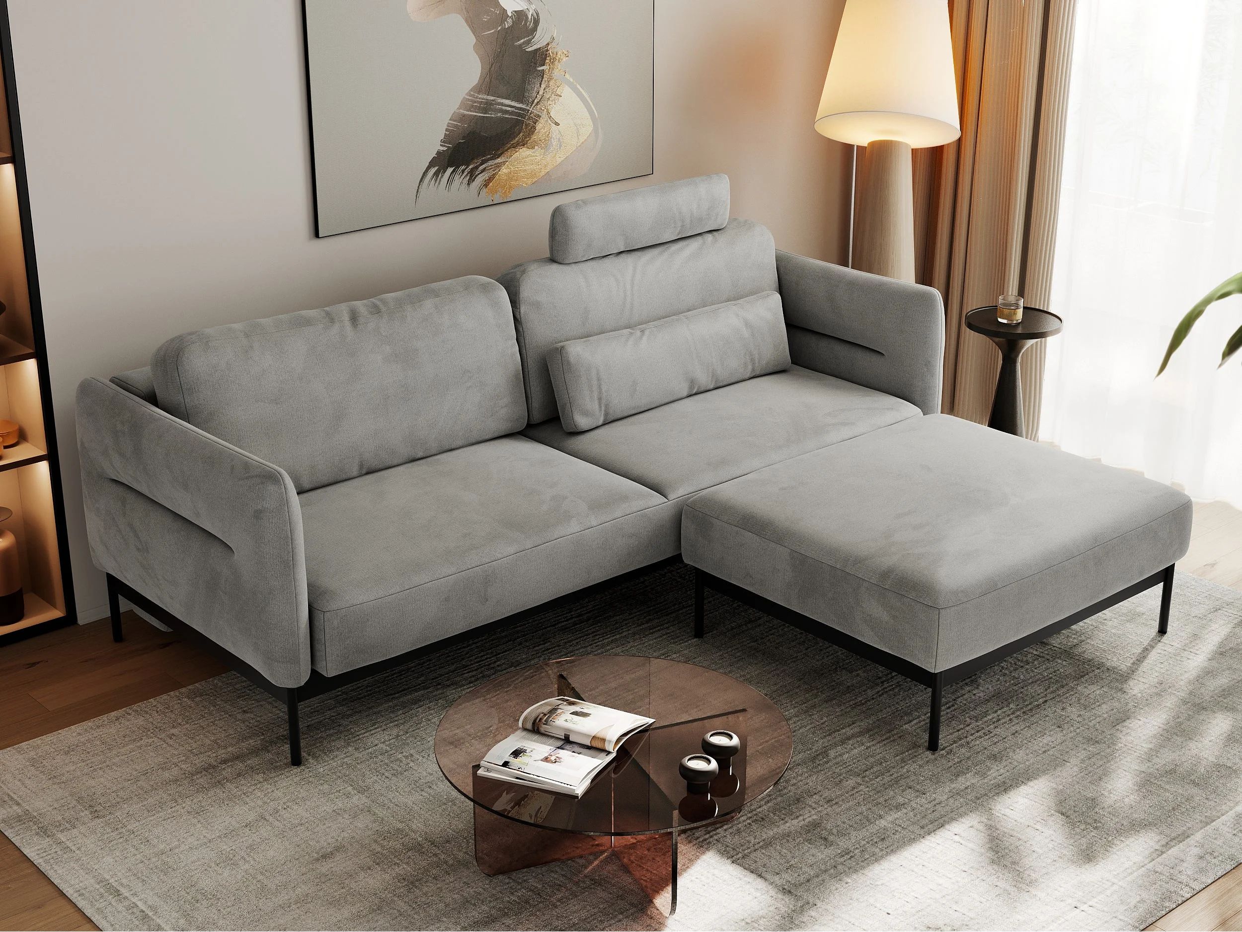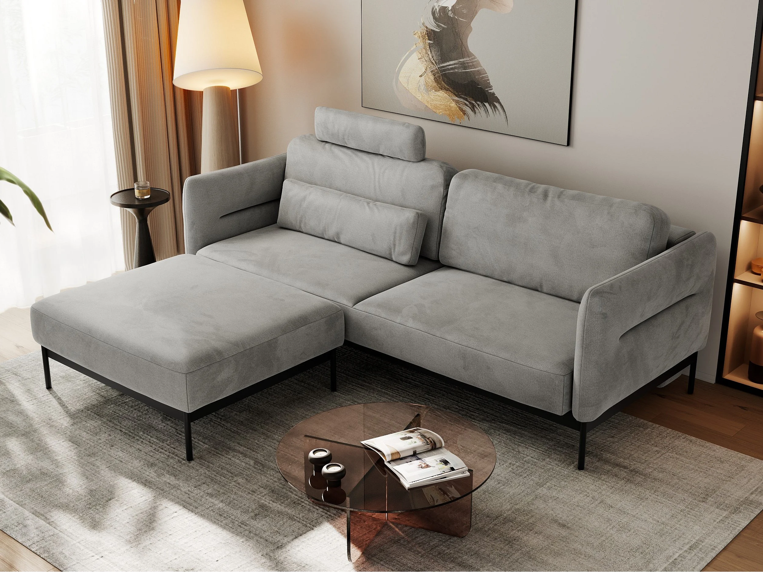 Ecksofa SALENTO - mit Metallbeine, Schlafsofa, mobilen Fußhocker, lose Kissen - Hellgrau Velvet