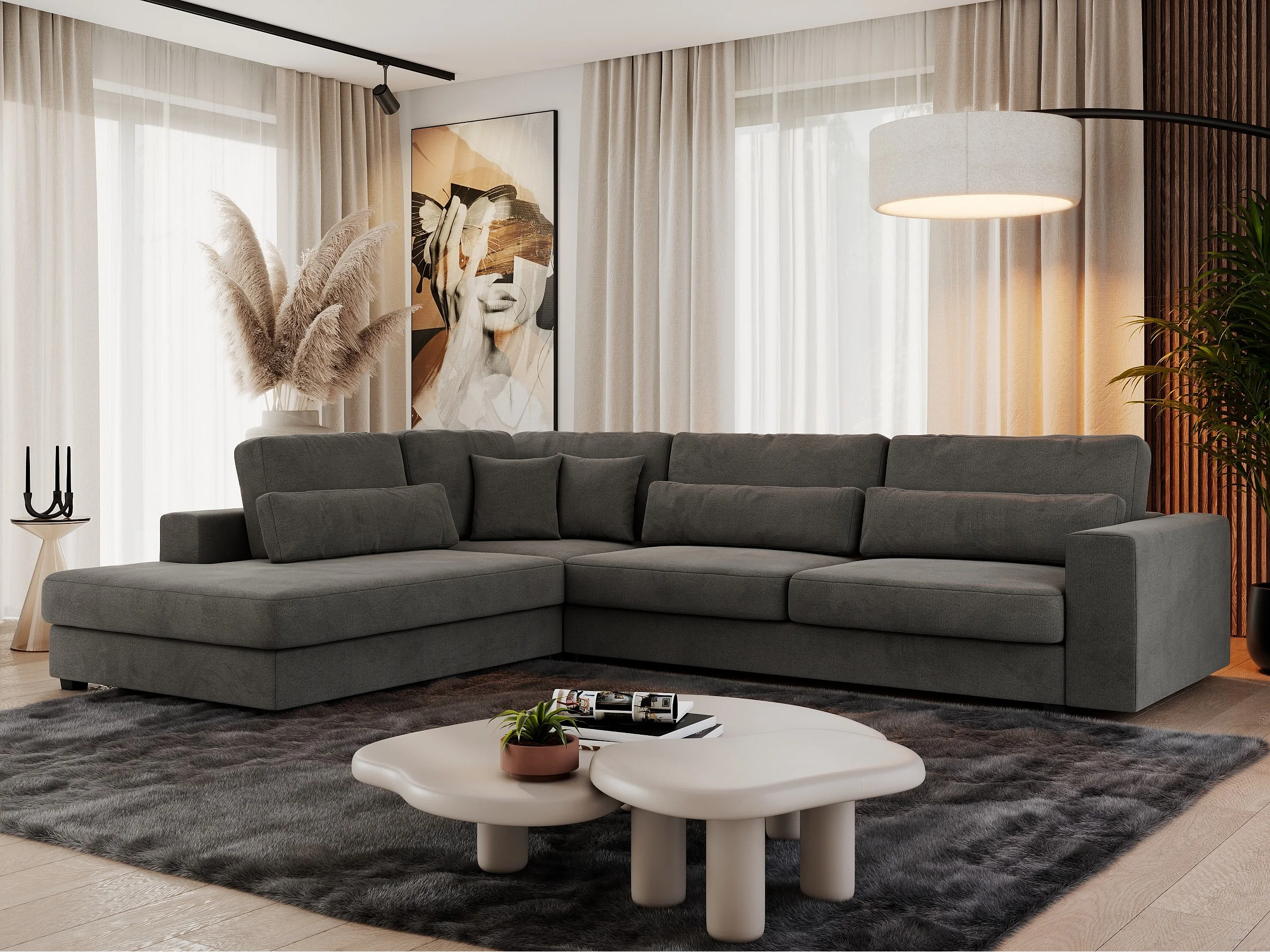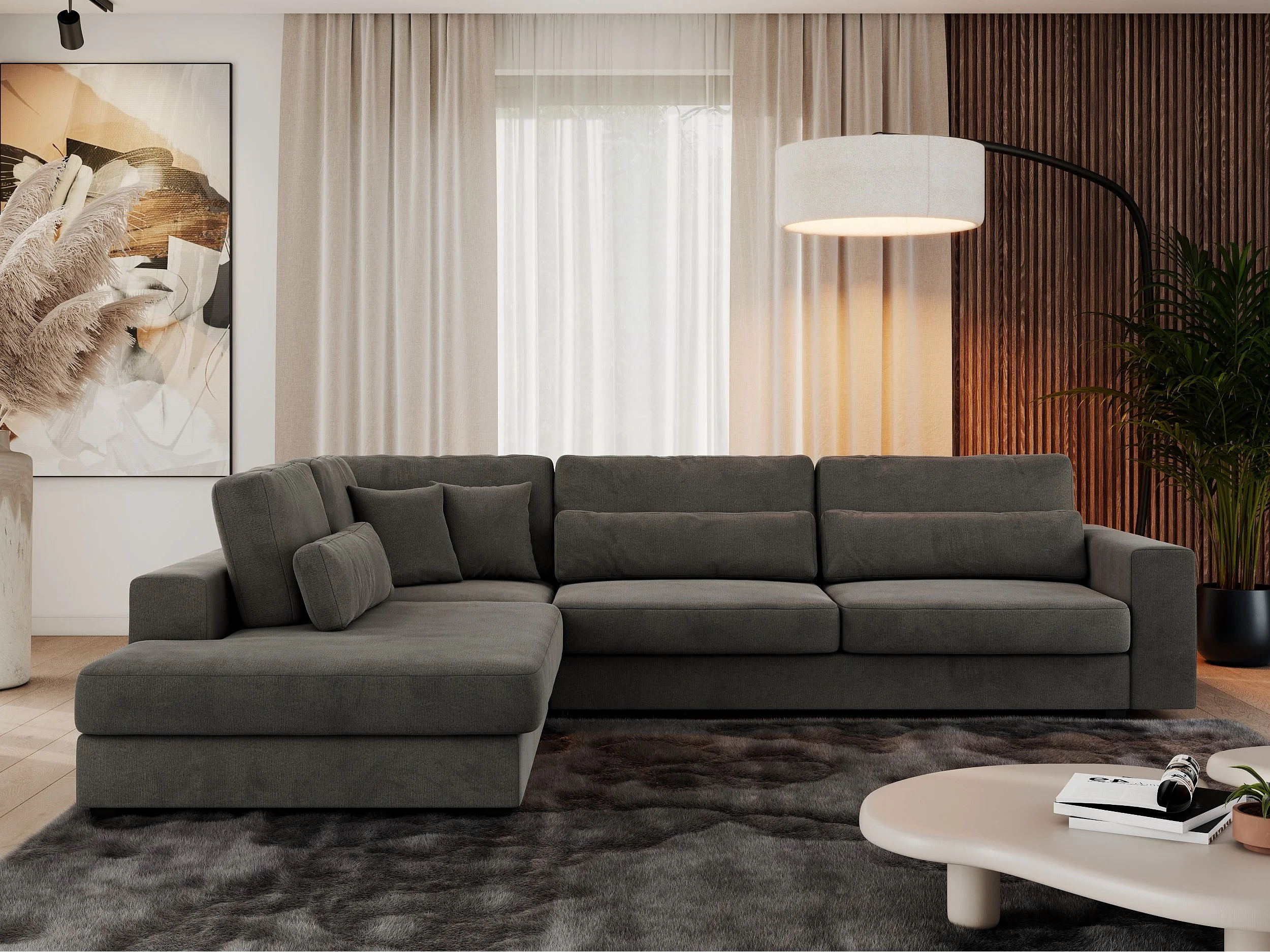 Ecksofa SAVONA - mit Armlehnen, lose Kissen, große L-förmige Ecke, Wohnlandschaft - Dunkelgrau Velvet - Ecke Links