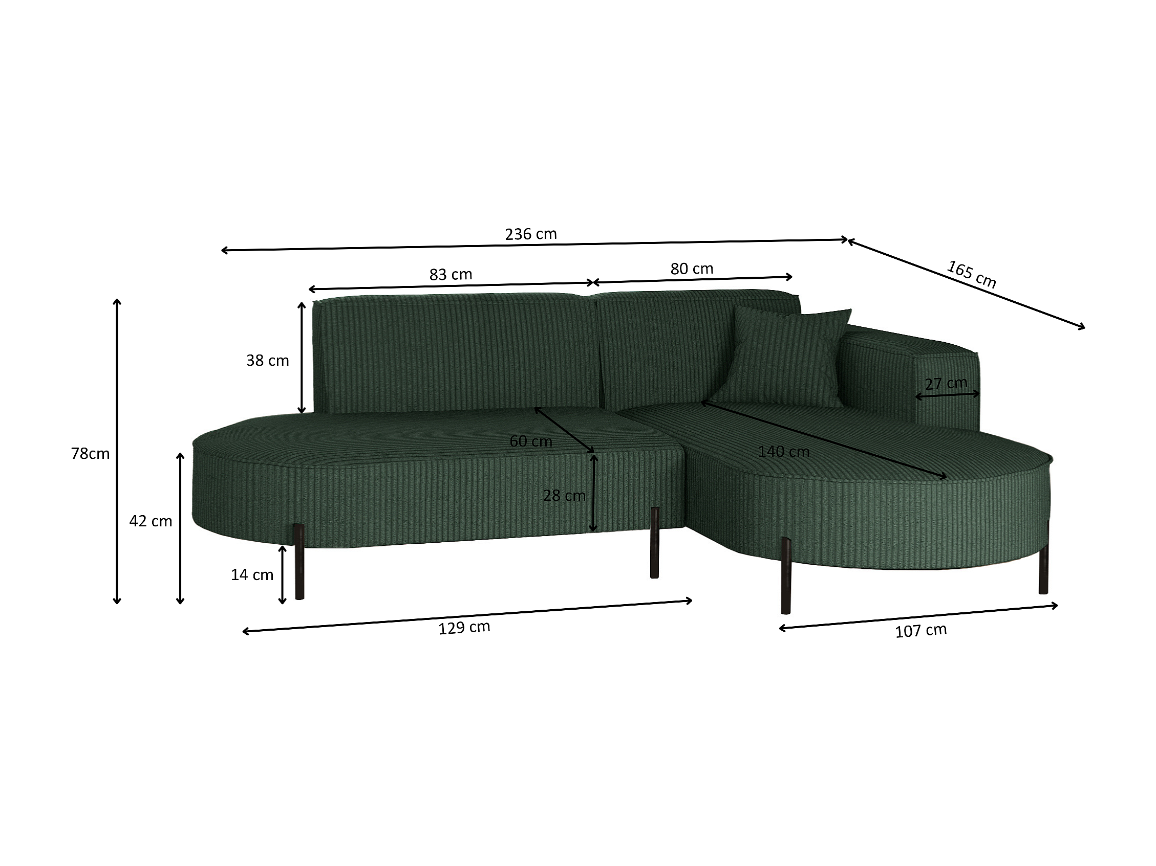Ecksofa, Sofa L-Form Designer Modena Rein stoff Poso Grün Rechts