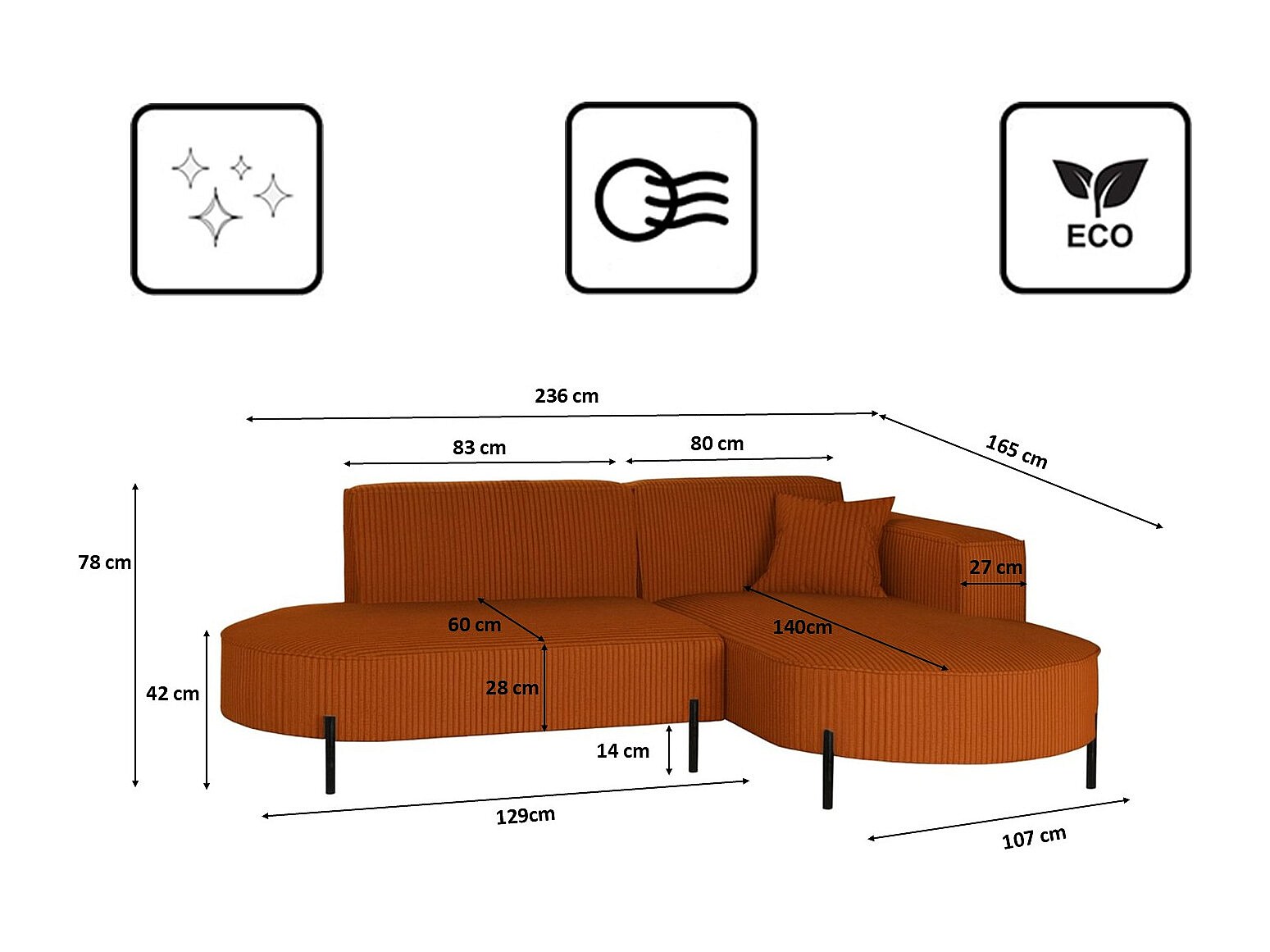 Ecksofa, Sofa L-Form Designer Modena Rein stoff Poso Kupfer Rechts