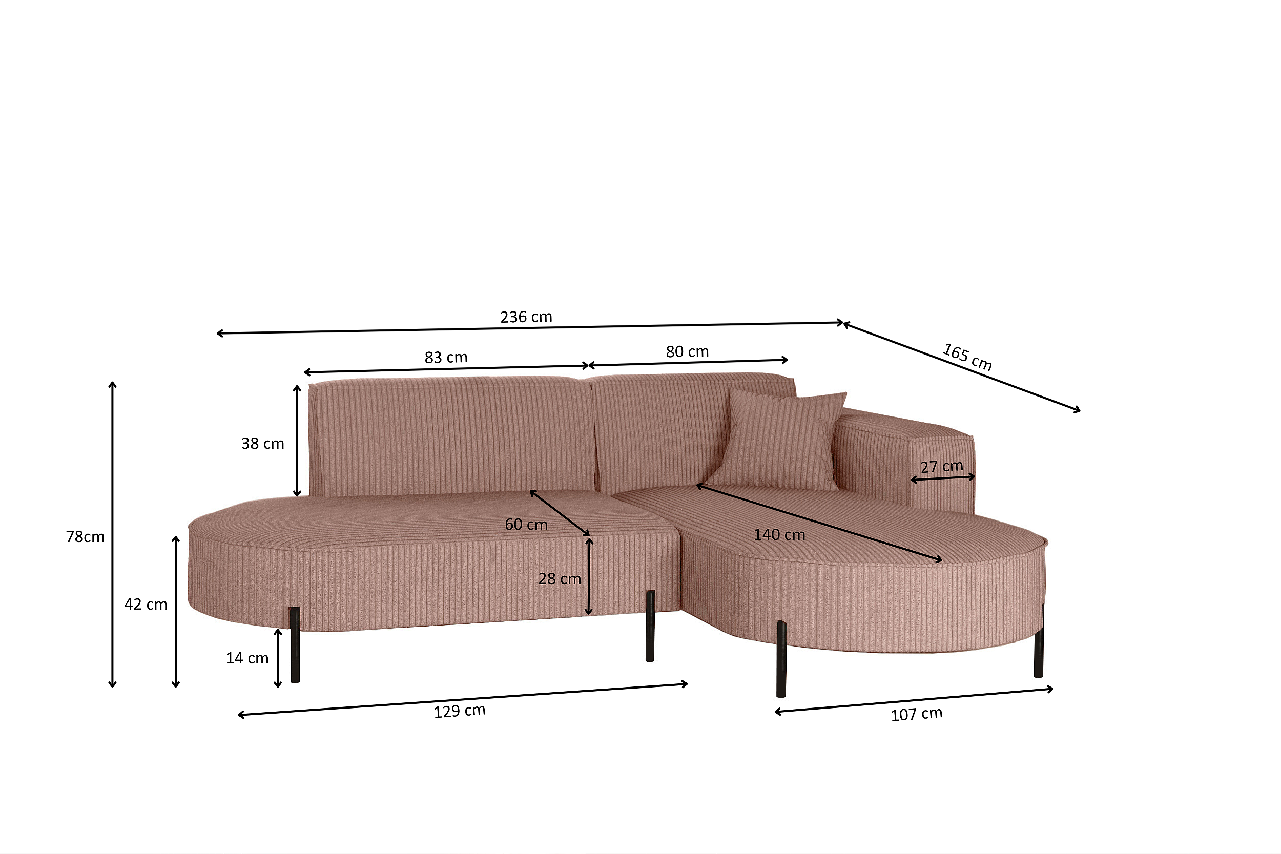 Ecksofa, Sofa L-Form Designer Modena Rein stoff Poso Rosa Rechts