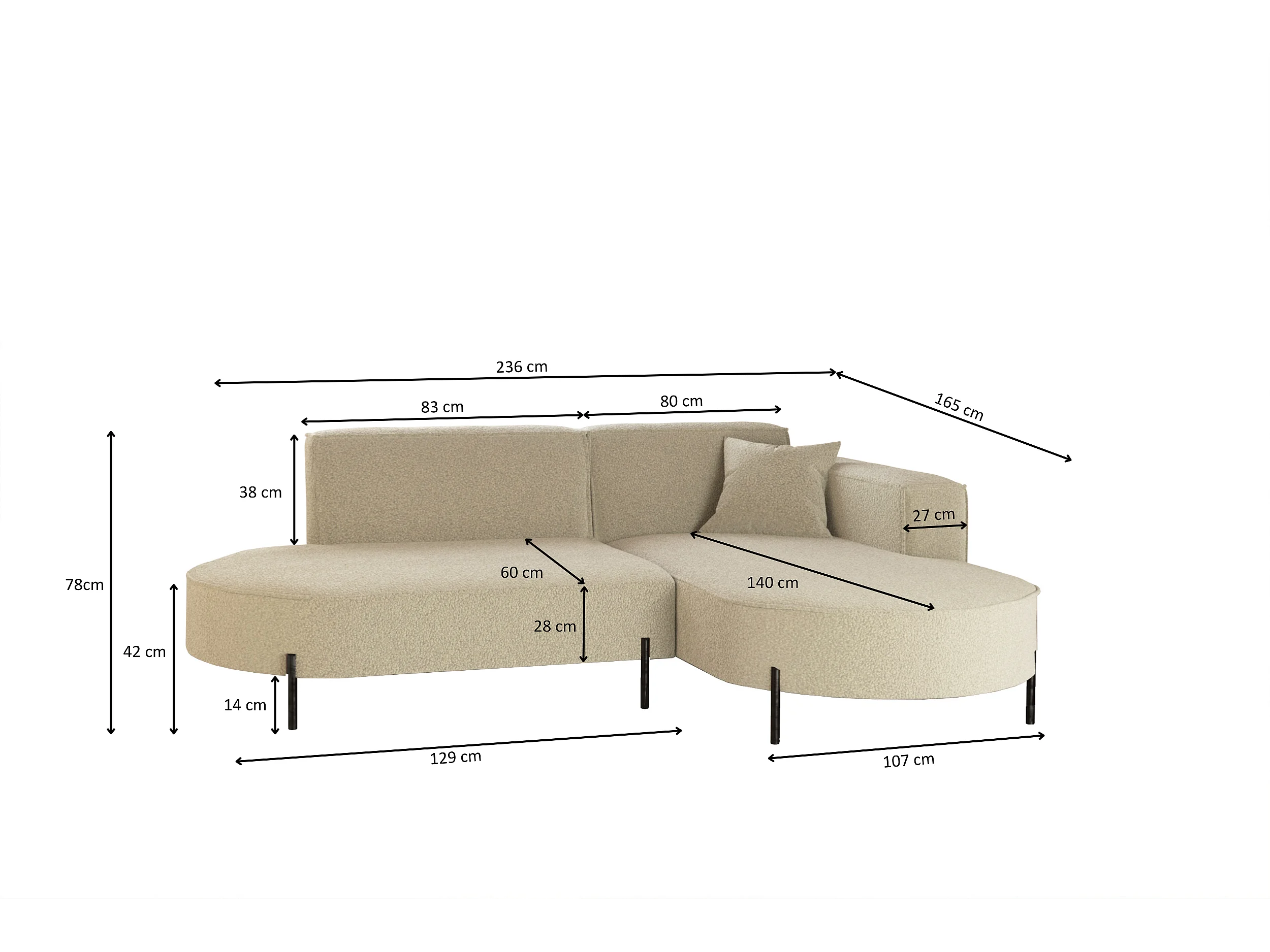 Ecksofa, Sofa L-Form Designer Modena Rein stoff Quelle Beige Rechts