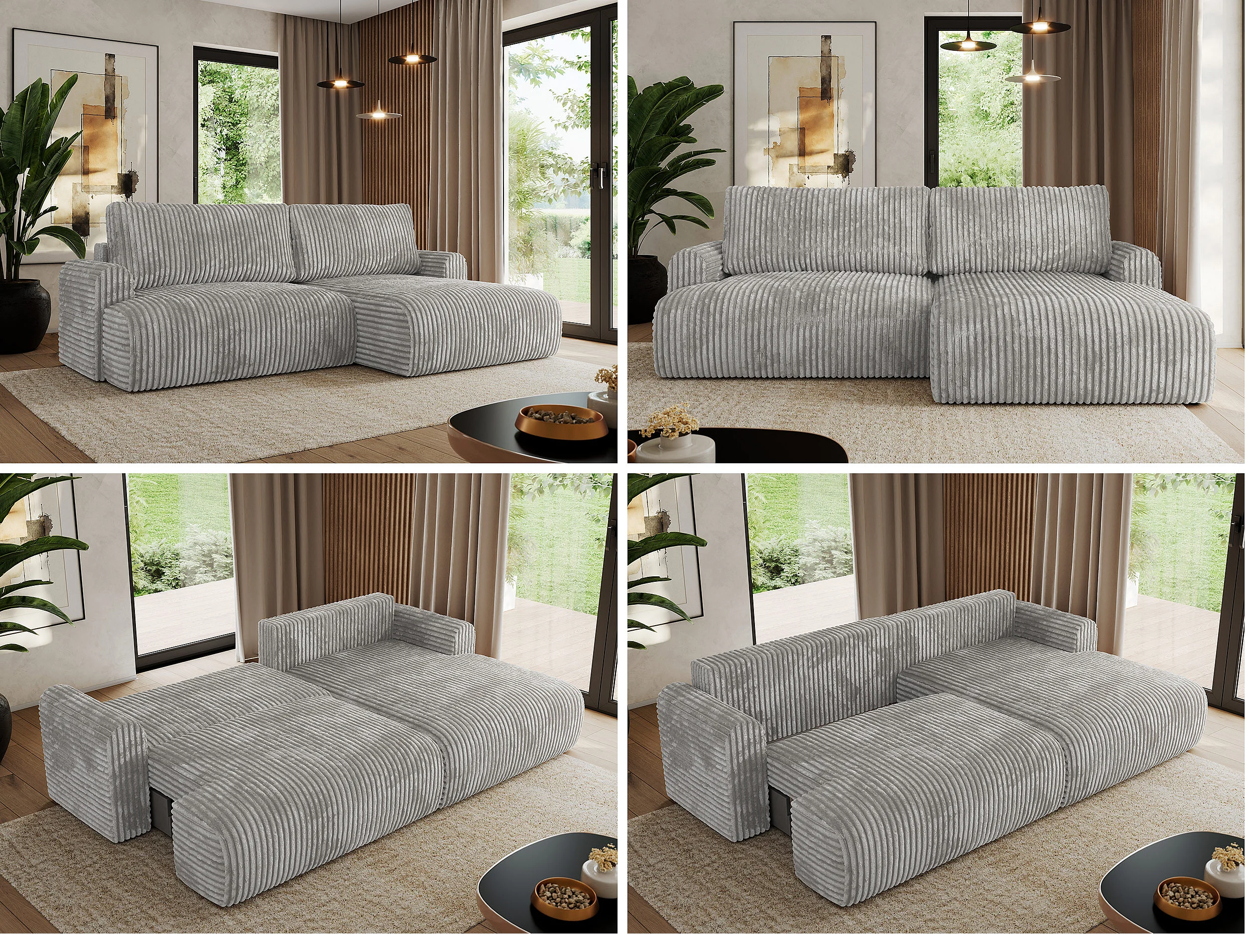 Ecksofa TONO - mit Schlaffunktion und Bettkasten, L-form Ecke, Armlehnen - Grau Cord - Ecke Rechts