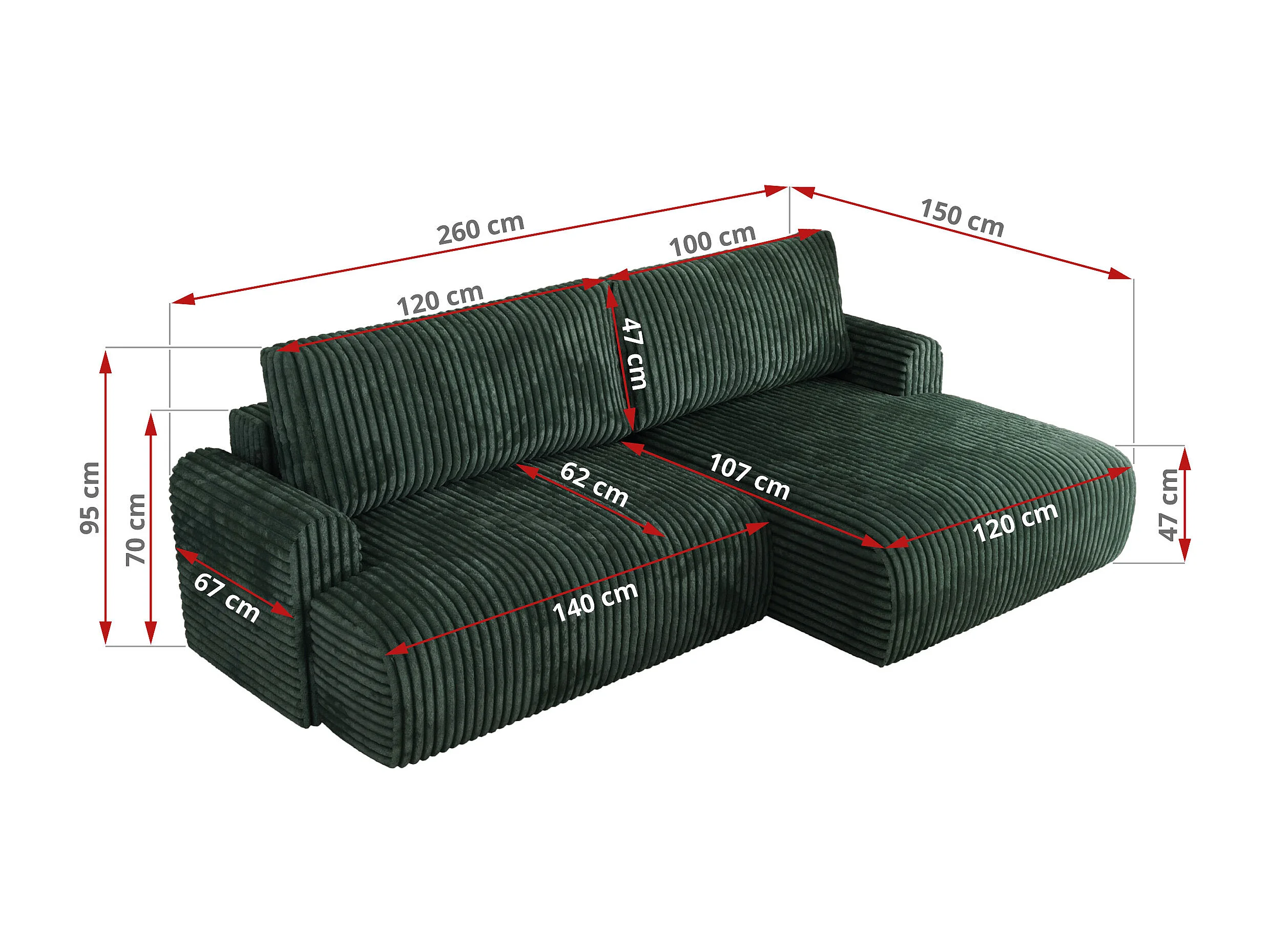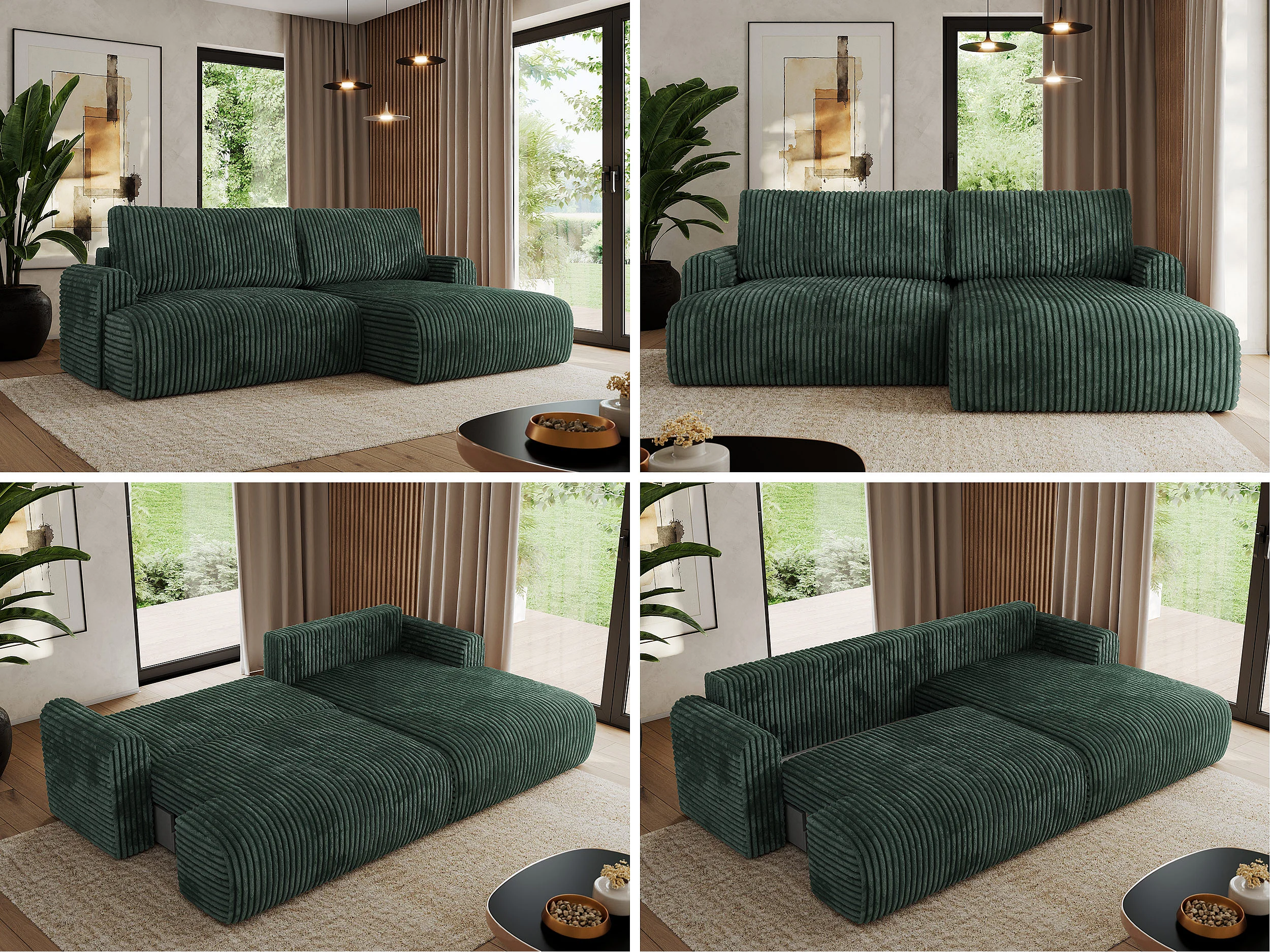 Ecksofa TONO - mit Schlaffunktion und Bettkasten, L-form Ecke, Armlehnen - Grün Cord - Ecke Rechts