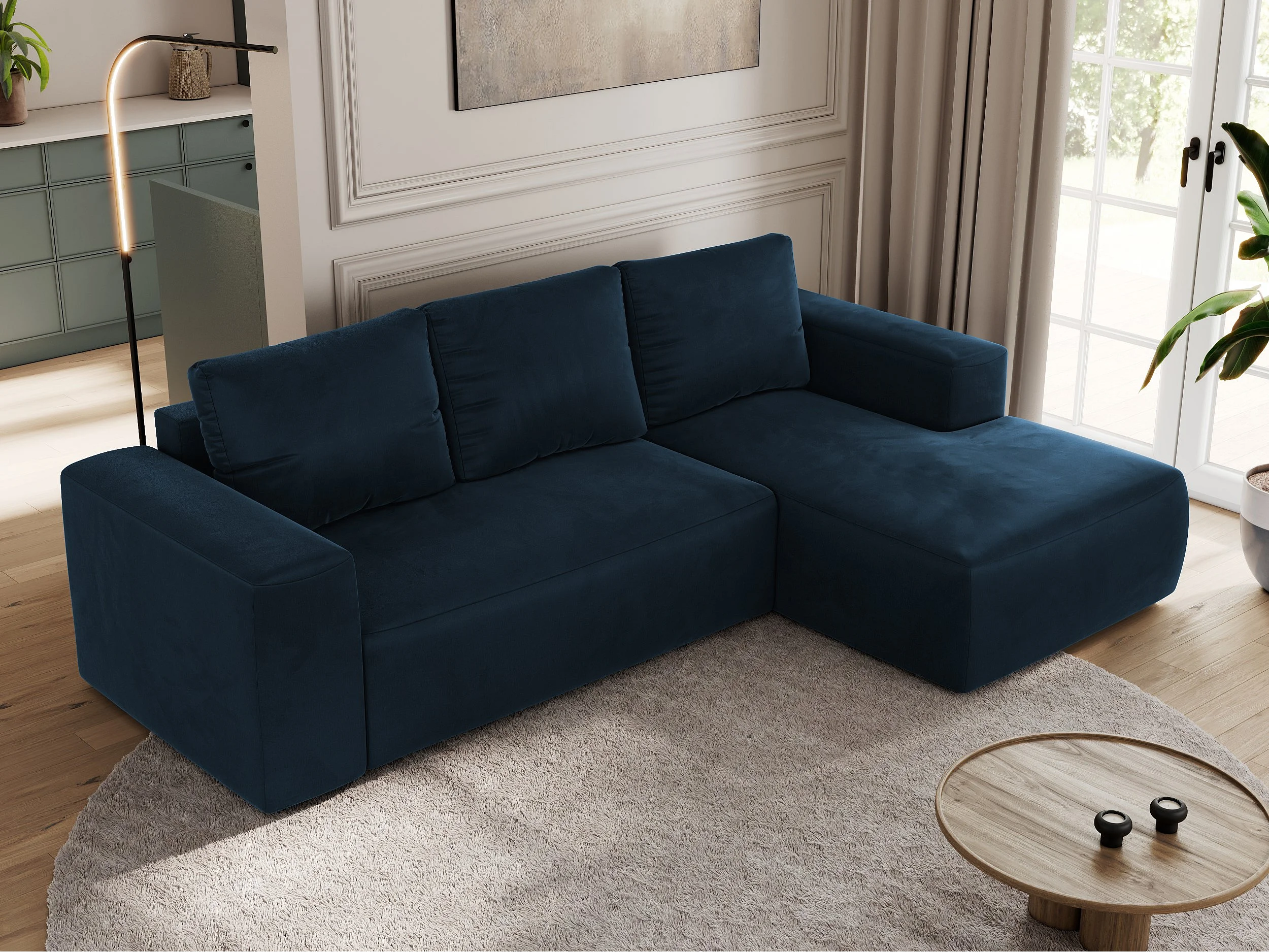 Ecksofa TRENTINO - mit Schlaffunktion und Bettkasten, L-form Couch, lose Kissen und Armlehnen - Dunkelblau Velvet - Ecke Rechts