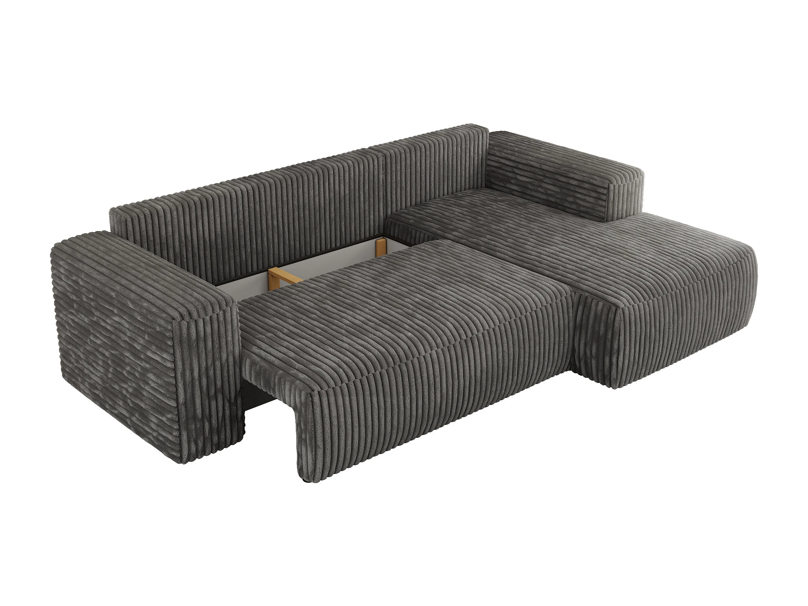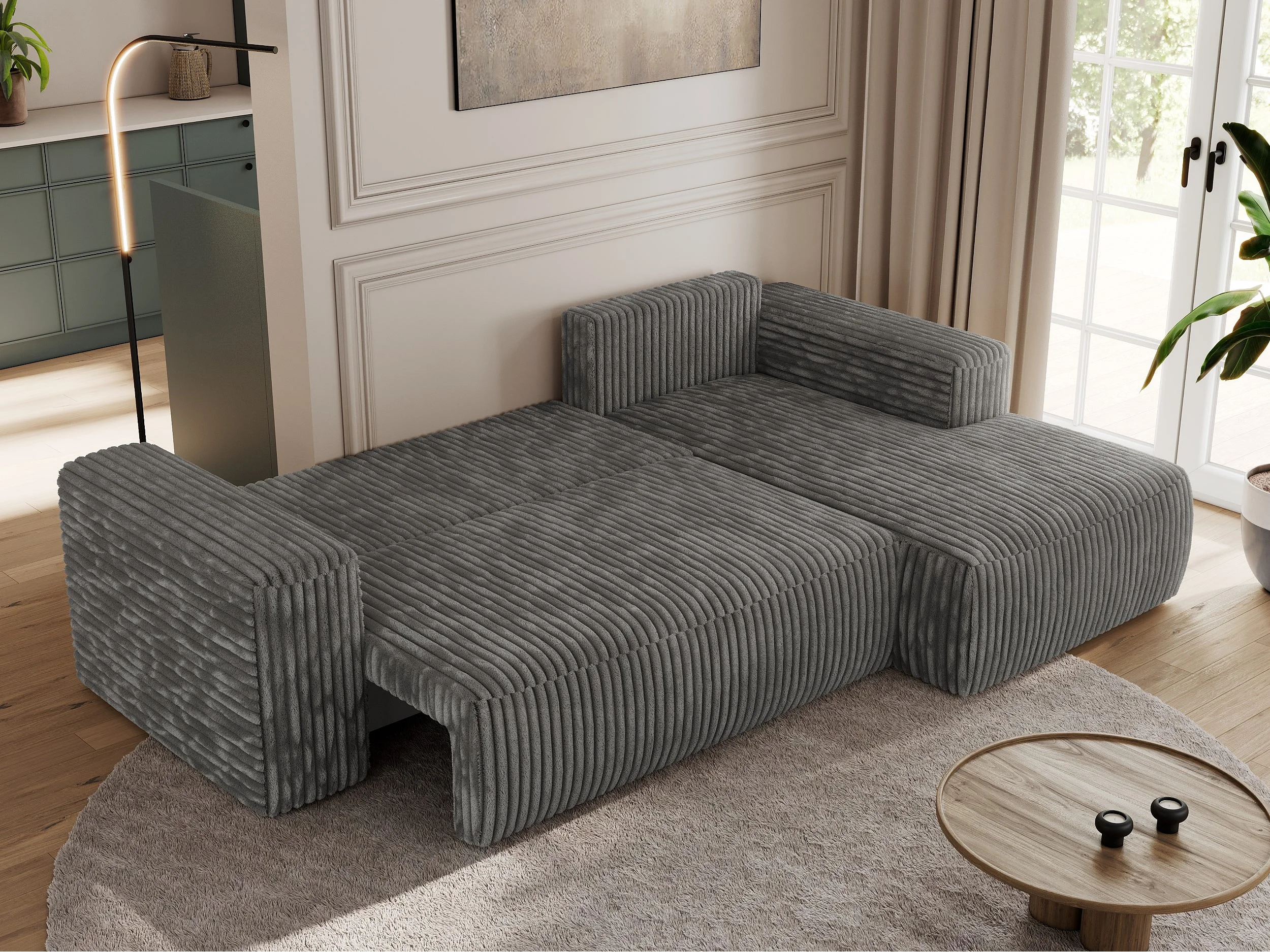 Ecksofa TRENTINO - mit Schlaffunktion und Bettkasten, L-form Couch, lose Kissen und Armlehnen - Dunkelgrau Cord - Ecke Rechts