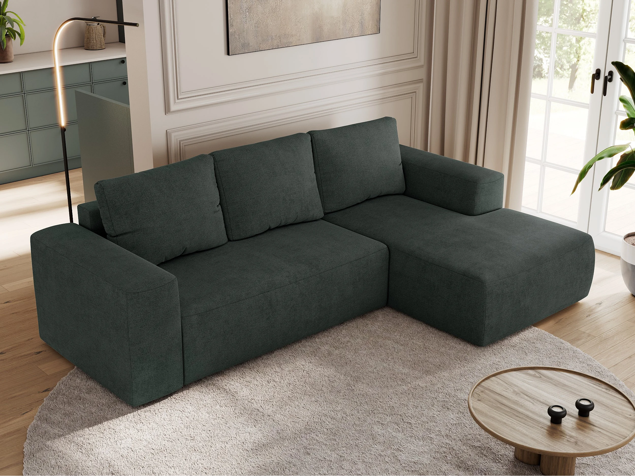 Ecksofa TRENTINO - mit Schlaffunktion und Bettkasten, L-form Couch, lose Kissen und Armlehnen - Dunkelgrau Stukture - Ecke Rechts