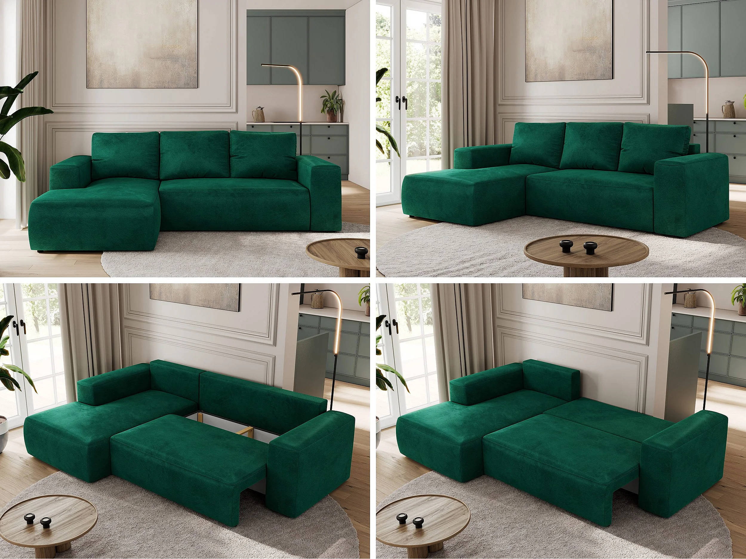Ecksofa TRENTINO - mit Schlaffunktion und Bettkasten, L-form Couch, lose Kissen und Armlehnen - Dunkelgrün Velvet - Ecke Links