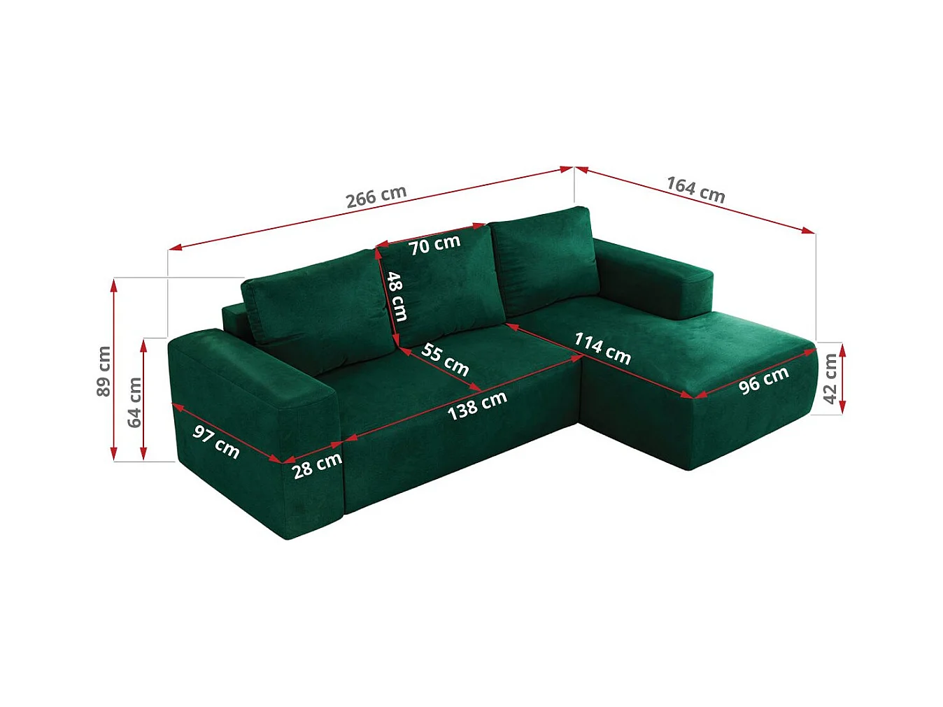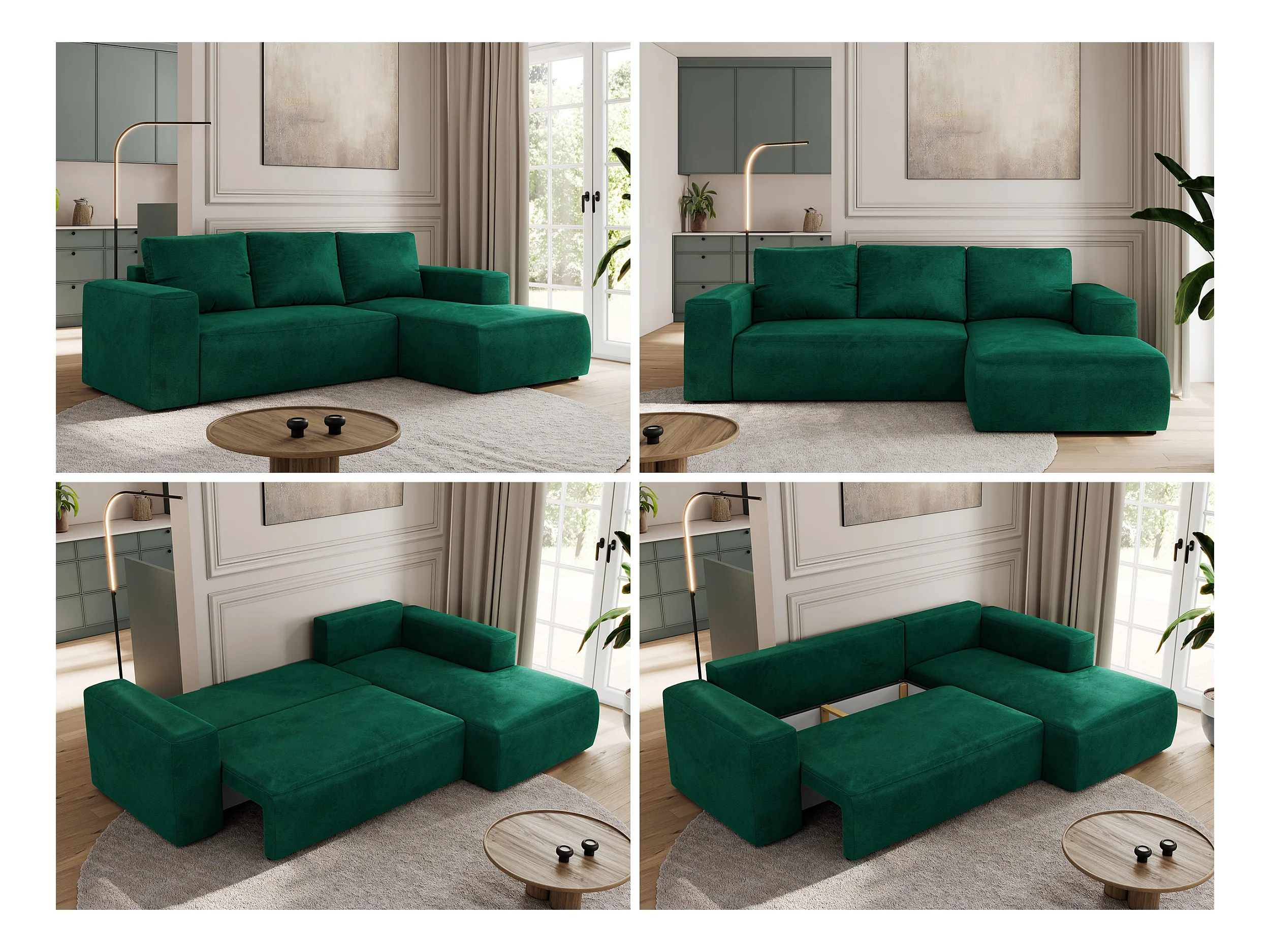 Ecksofa TRENTINO - mit Schlaffunktion und Bettkasten, L-form Couch, lose Kissen und Armlehnen - Dunkelgrün Velvet - Ecke Rechts