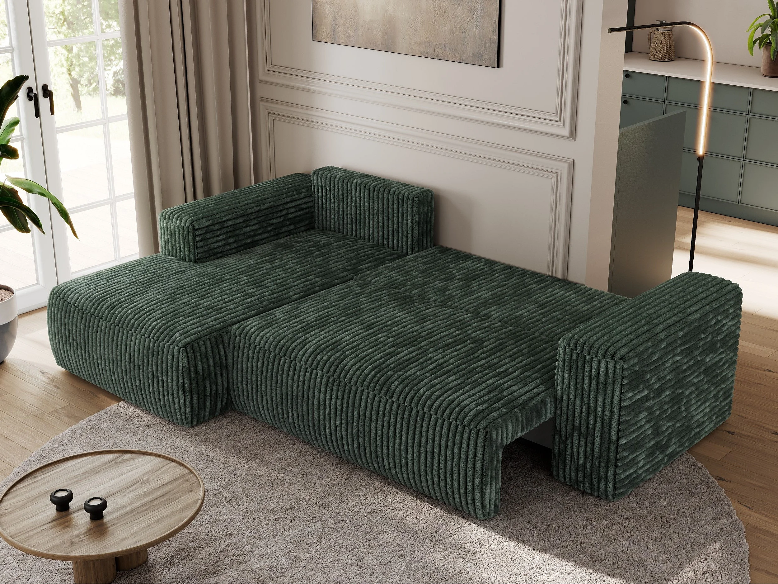 Ecksofa TRENTINO - mit Schlaffunktion und Bettkasten, L-form Couch, lose Kissen und Armlehnen - Grün Cord - Ecke Links