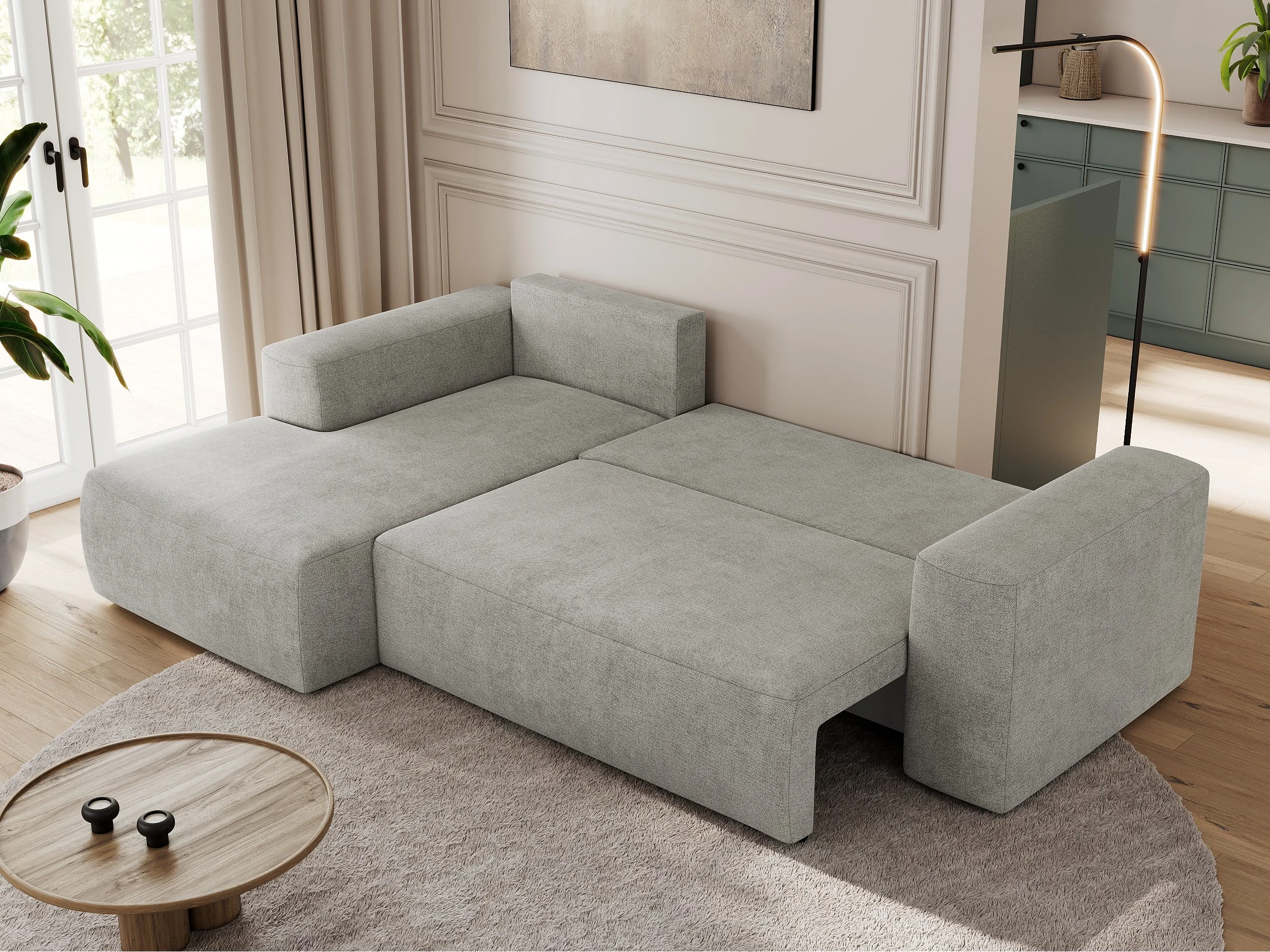 Ecksofa TRENTINO - mit Schlaffunktion und Bettkasten, L-form Couch, lose Kissen und Armlehnen - Hellgrau Stukture - Ecke Links