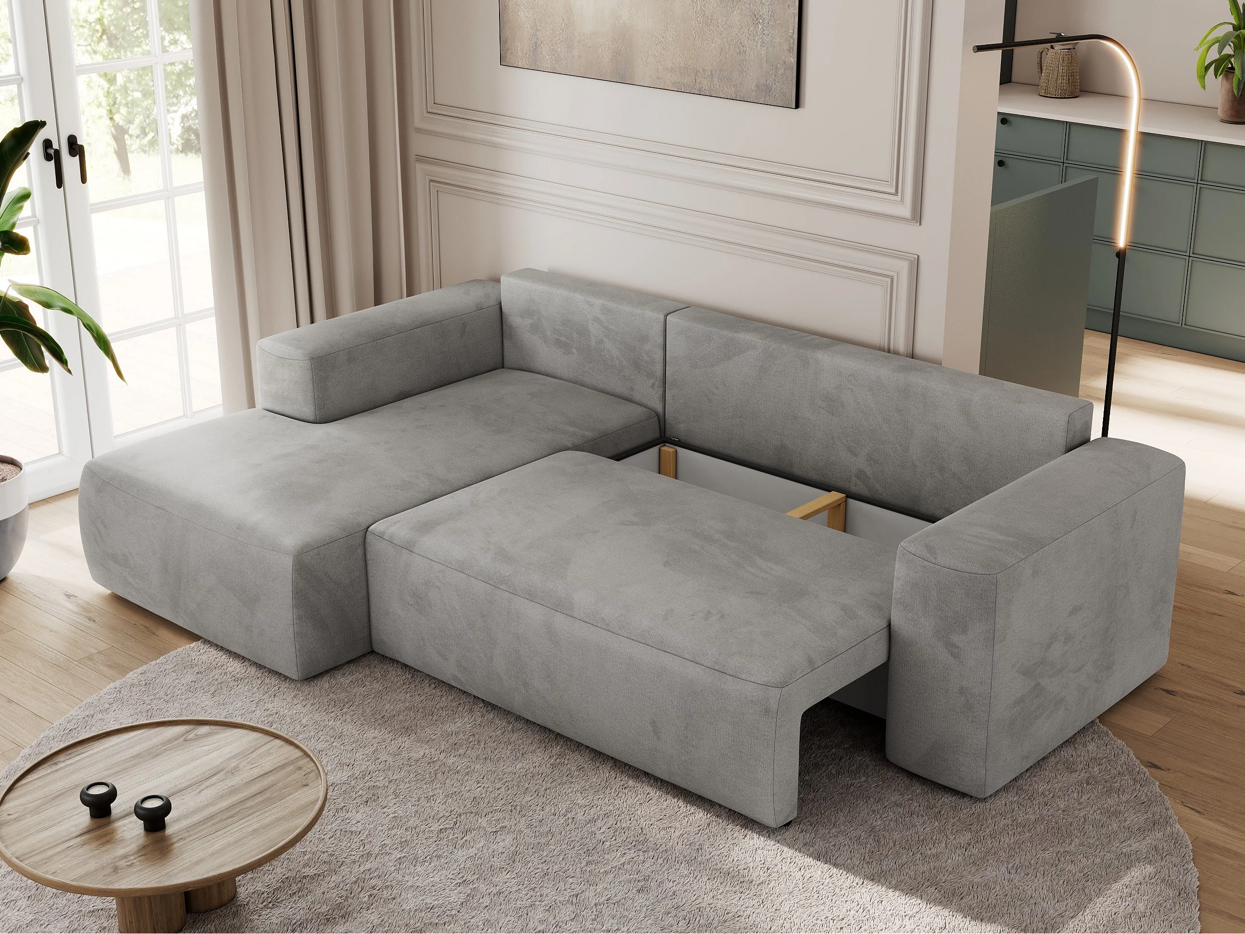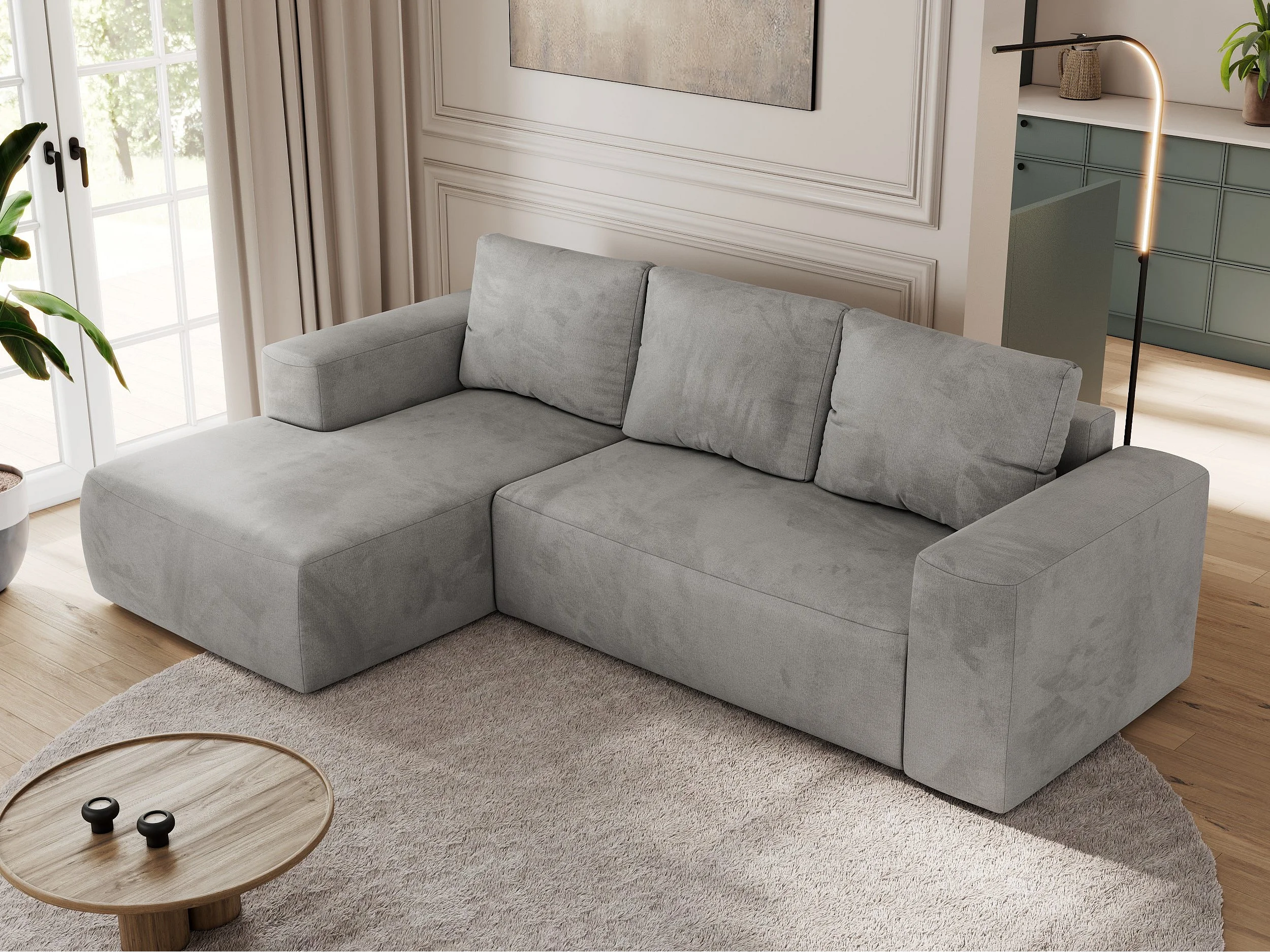 Ecksofa TRENTINO - mit Schlaffunktion und Bettkasten, L-form Couch, lose Kissen und Armlehnen - Hellgrau Velvet - Ecke Links