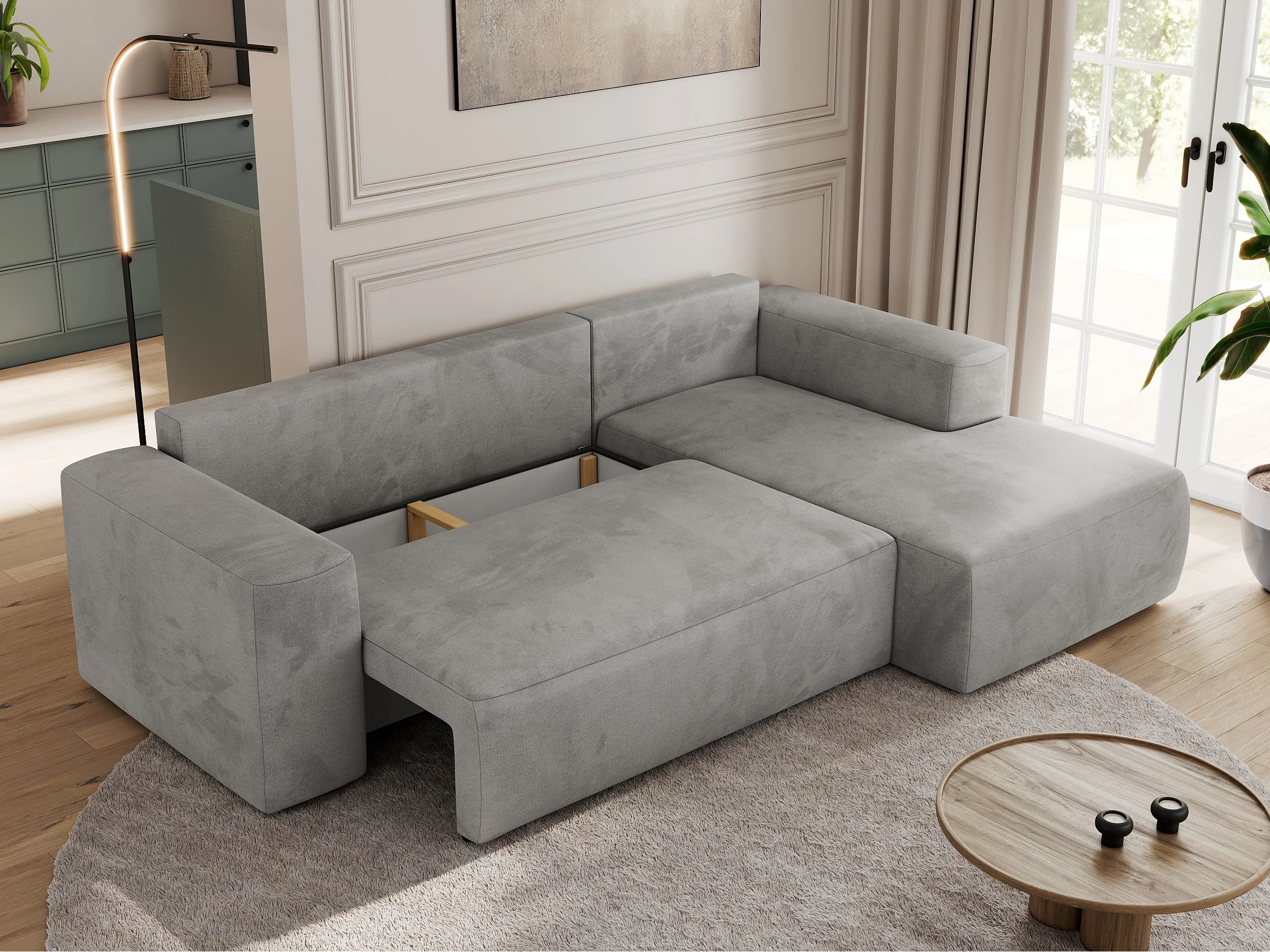 Ecksofa TRENTINO - mit Schlaffunktion und Bettkasten, L-form Couch, lose Kissen und Armlehnen - Hellgrau Velvet - Ecke Rechts