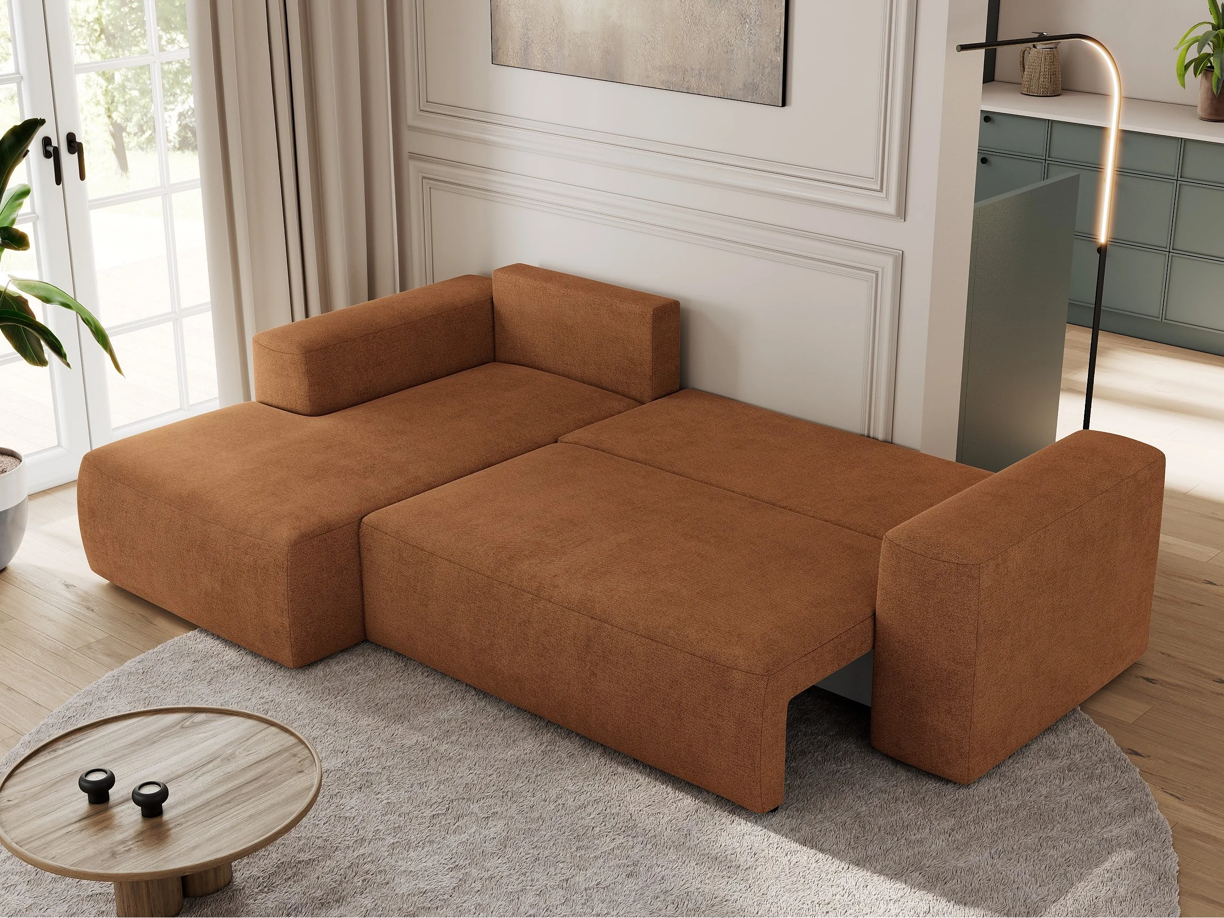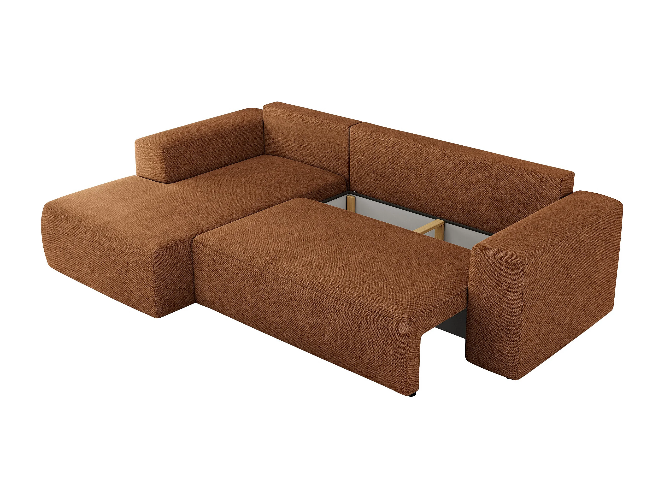 Ecksofa TRENTINO - mit Schlaffunktion und Bettkasten, L-form Couch, lose Kissen und Armlehnen - Orange Stukture - Ecke Links